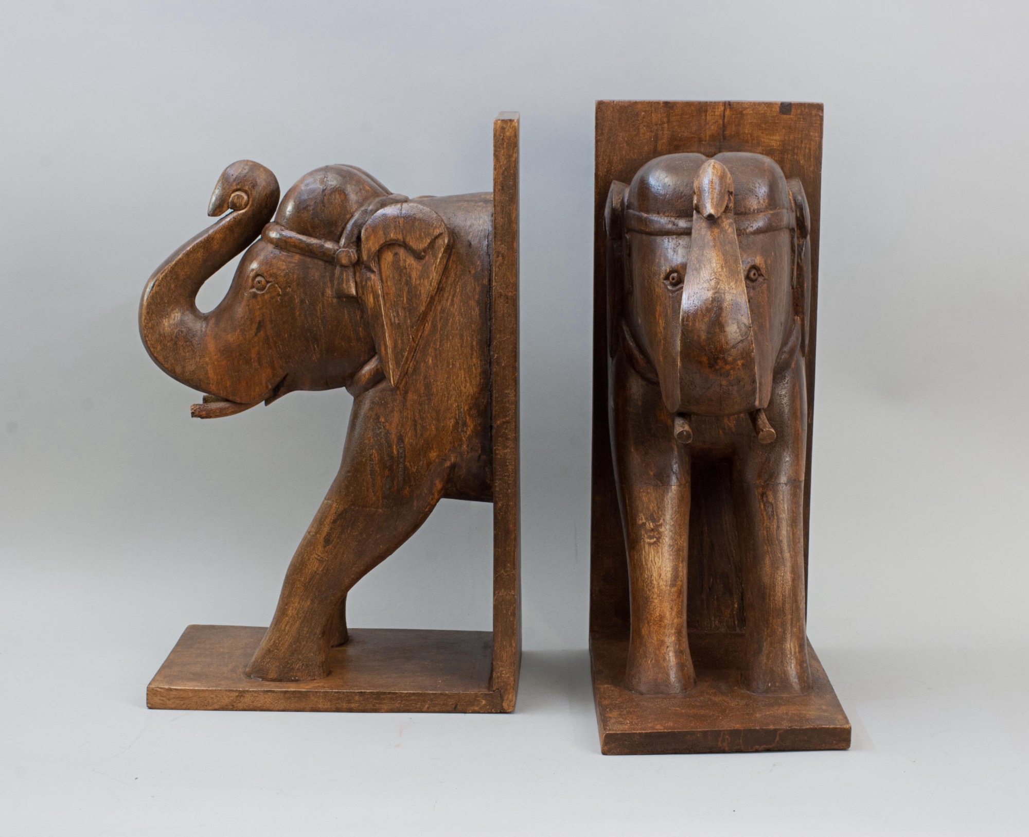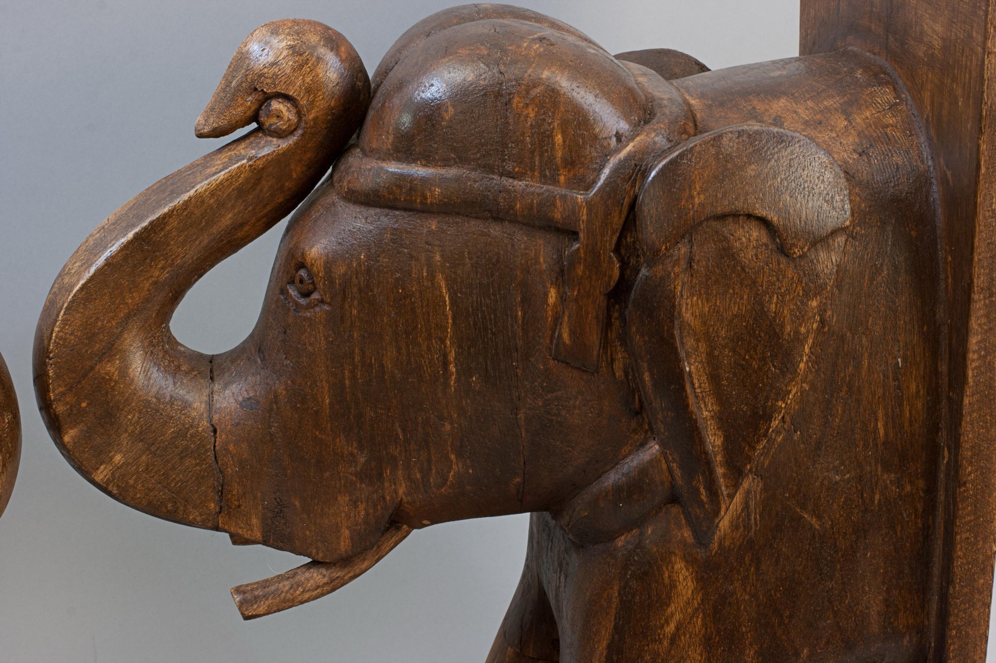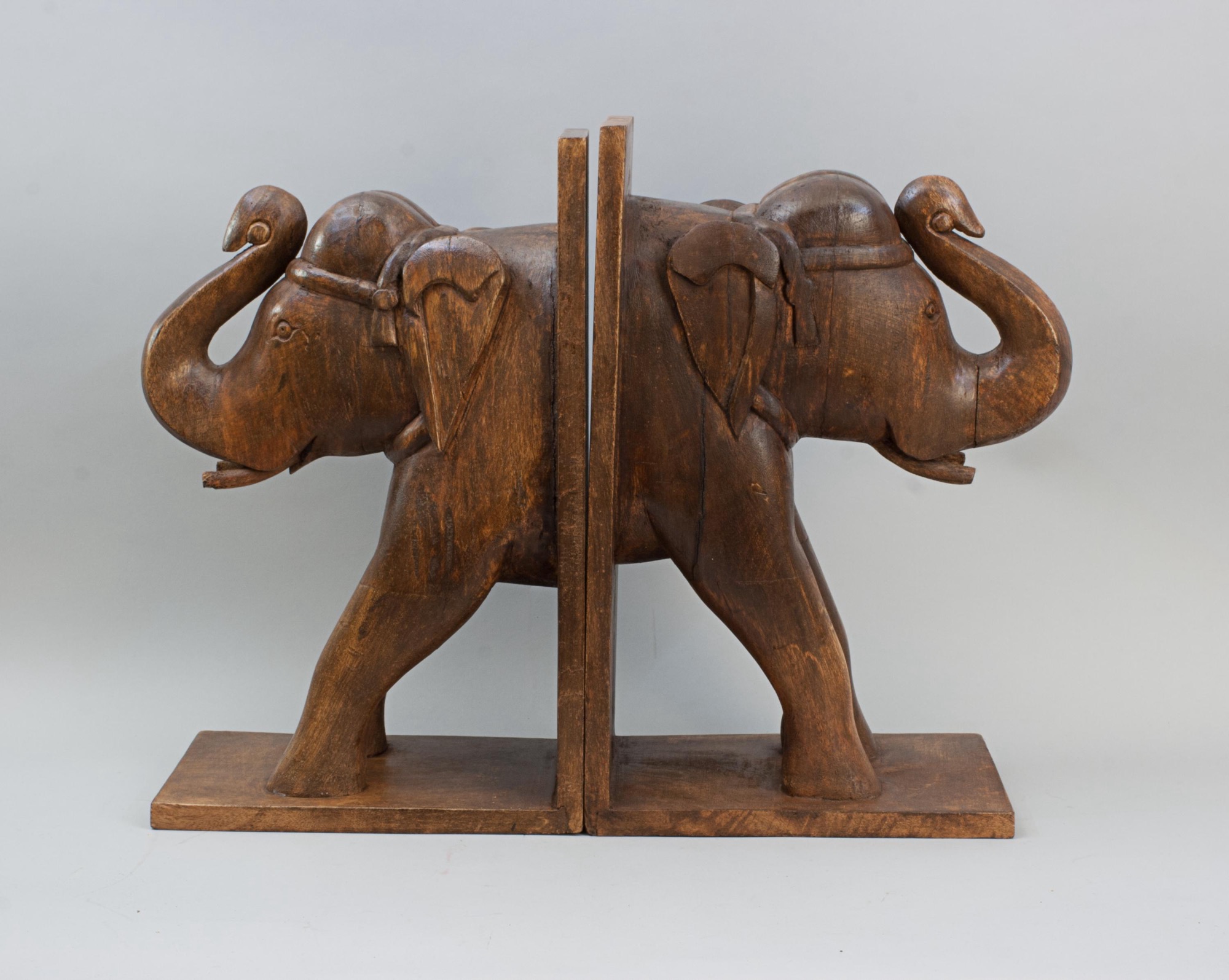 This is a very large pair of carved bookends depicting stylized Asian elephants. Beautifully shaped and hand-carved from teak wood, each bookend represents the front half of an elephant, as these are hand carved they are therefore not completely identical. The elephants are solid and substantial, with rounded bodies, thick legs, and gently simplified forms that emphasize strength and presence.
