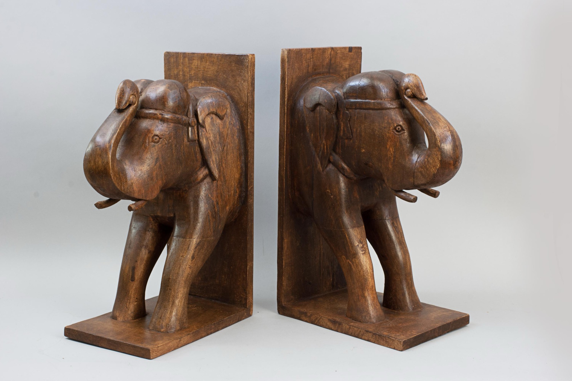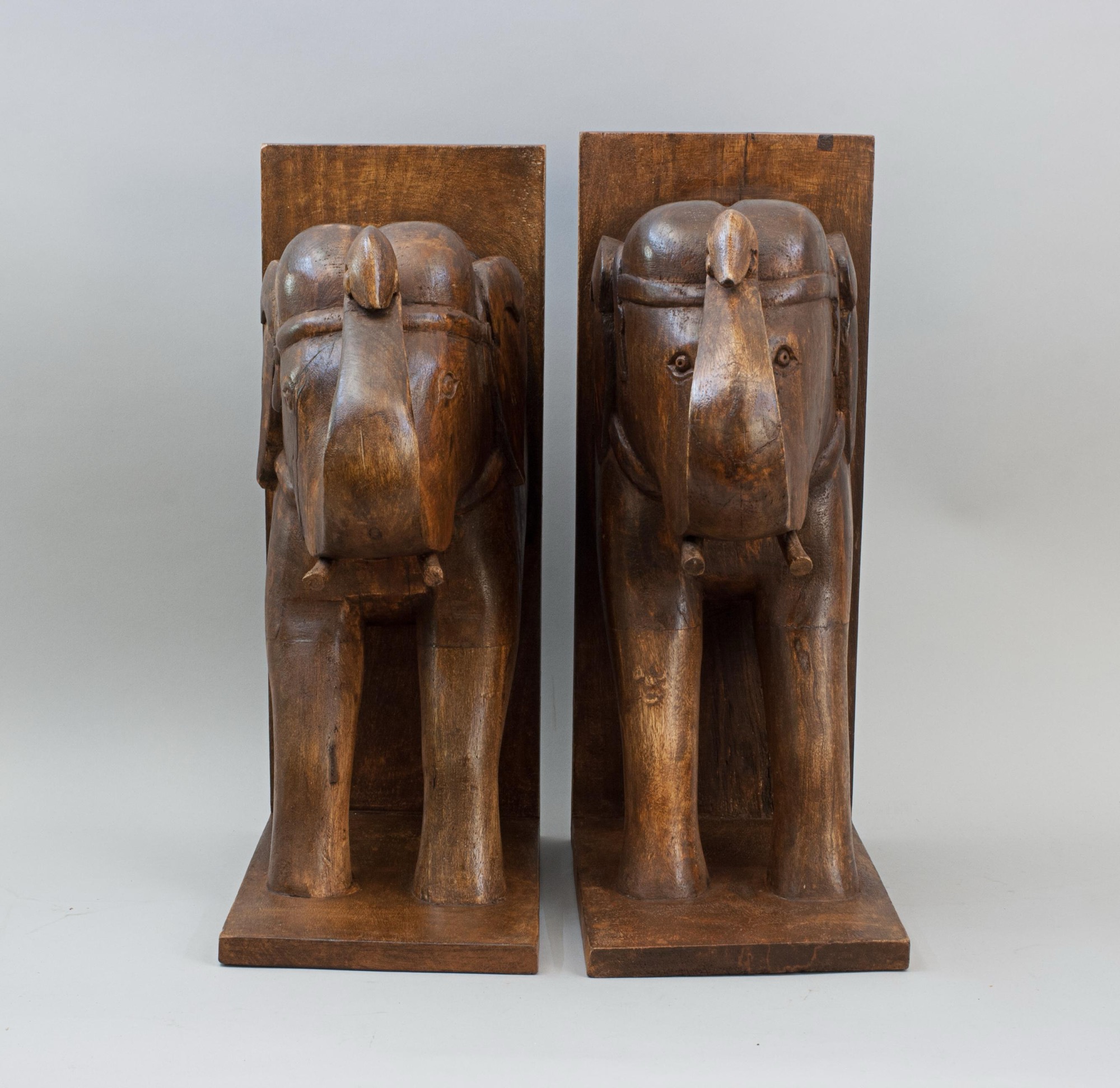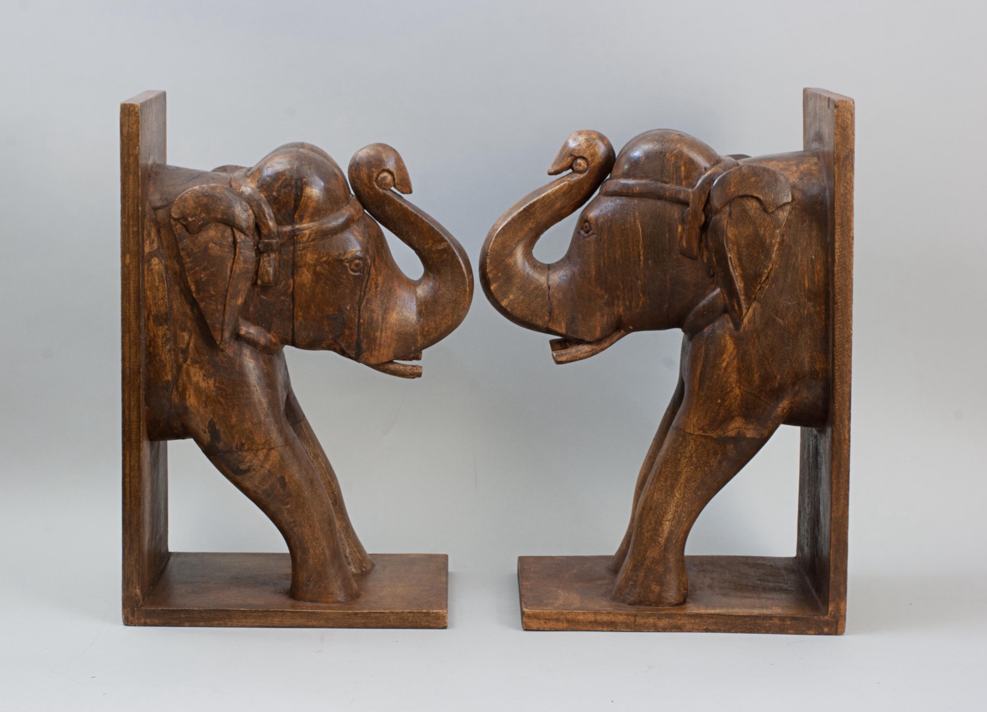 This is a very large pair of carved bookends depicting stylized Asian elephants. Beautifully shaped and hand-carved from teak wood, each bookend represents the front half of an elephant, as these are hand carved they are therefore not completely identical. The elephants are solid and substantial, with rounded bodies, thick legs, and gently simplified forms that emphasize strength and presence.