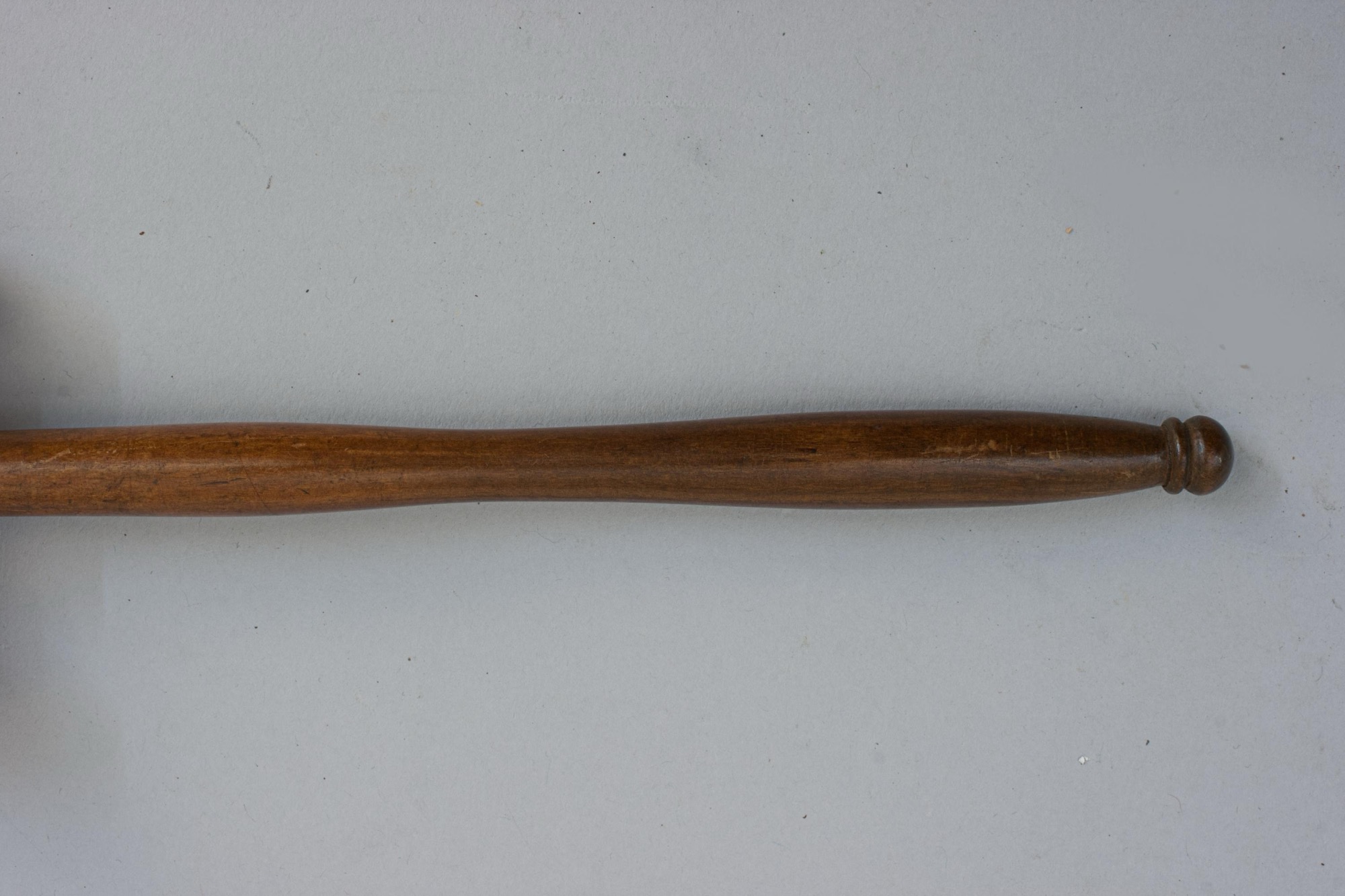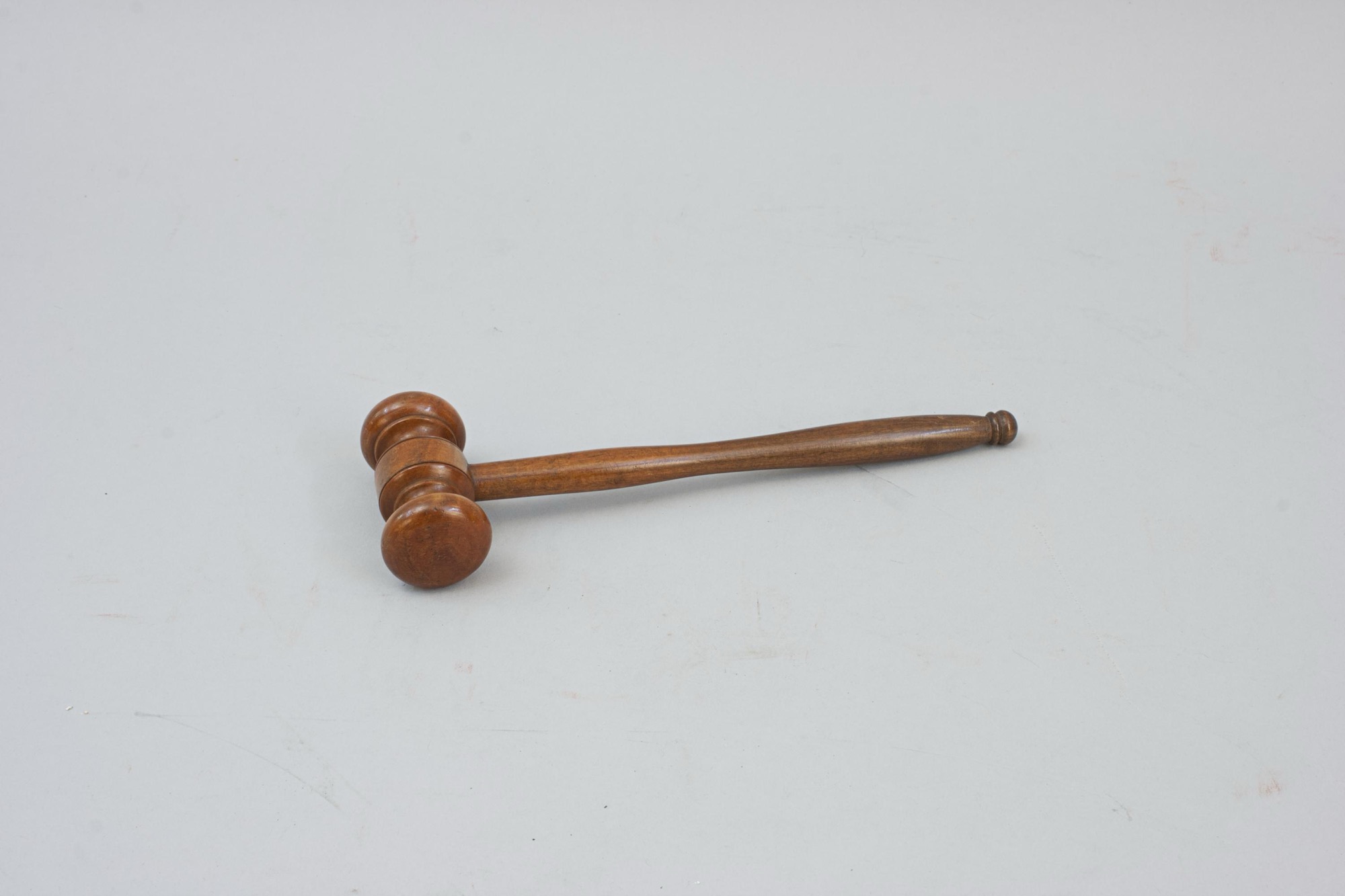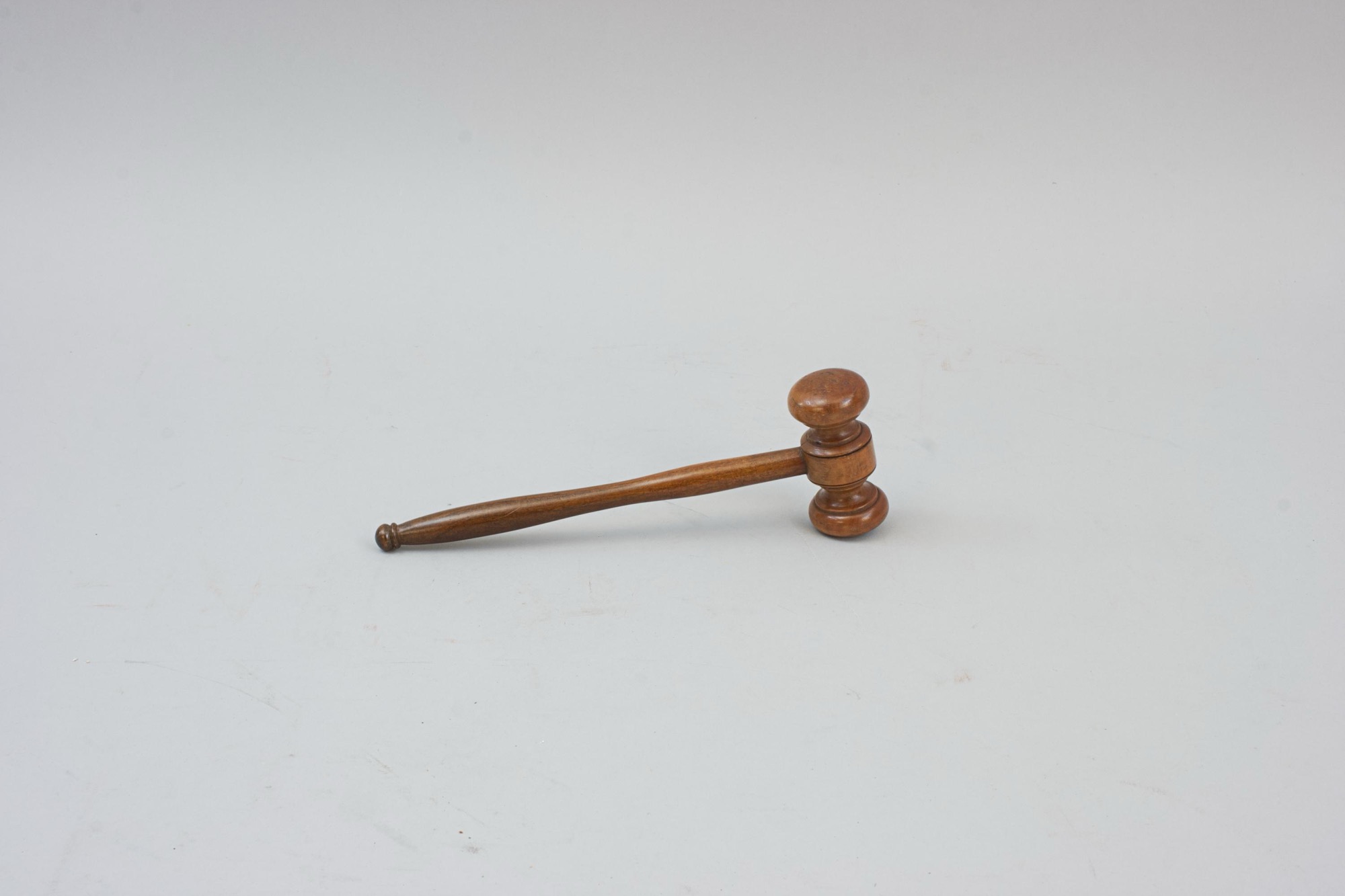 A well turned wooden gavel, small ceremonial mallet traditionally used by judges, auctioneers, and presiding officers to call for attention, punctuate rulings, or maintain order. The gavel has a cylindrical well shaped head with slightly rounded ends, each end is symmetrical, giving it a balanced appearance. The handle is long, slender, and tapered. It starts thicker where it connects to the head and gradually narrows down toward the middle before getting thicker at the end, finishing with a small rounded knob for grip.