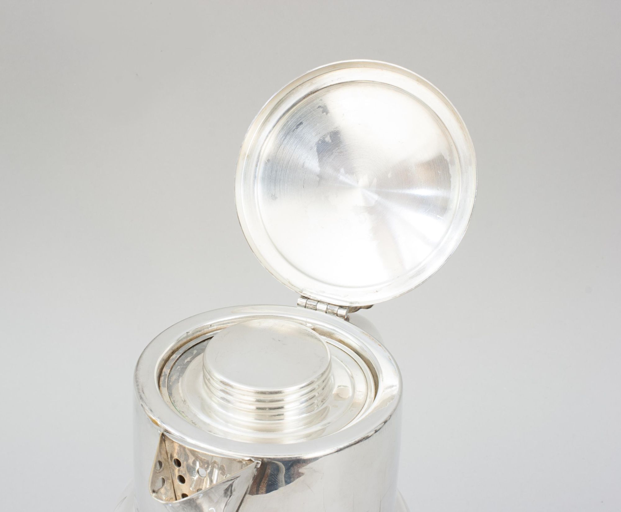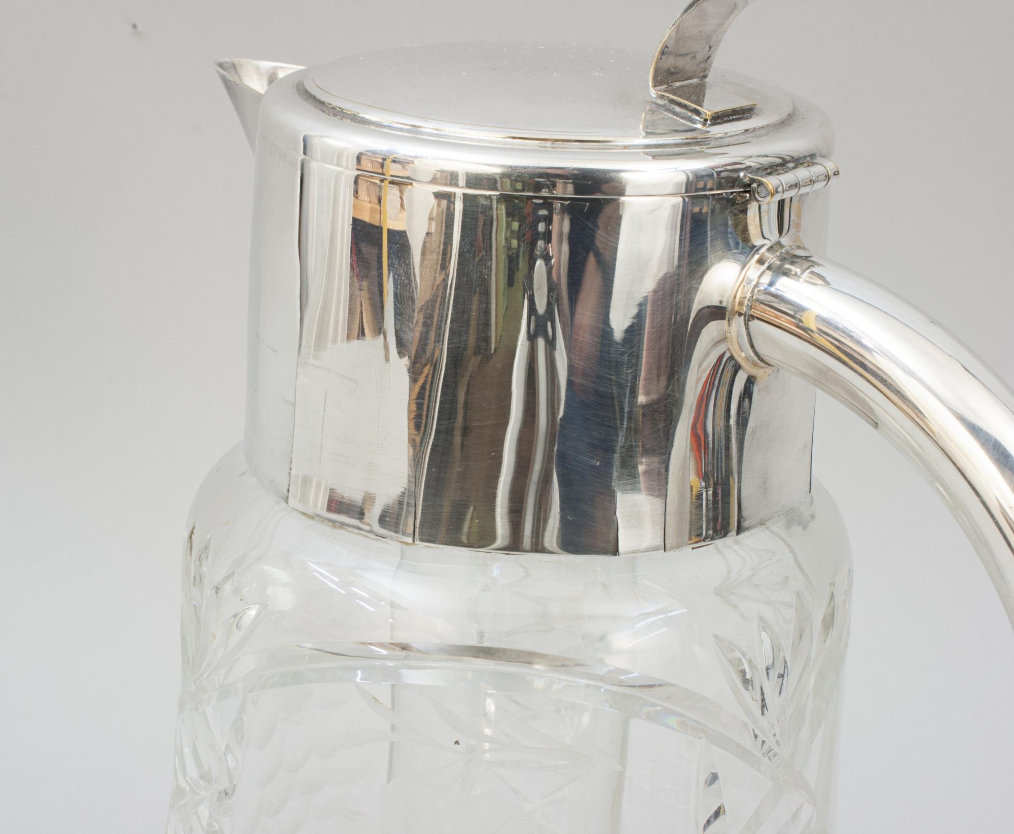 A very nice large continental lemonade jug with original internal cooling insert, this is the ideal way to keep your beverages chilled. The glass insert is filled with ice and put in place thus cooling the liquid inside, be it lemonade, orange juice or even Pimms, without the ice melting and diluting your drink. The glass pitcher is with plated handle, spout with removable filter and hinged lid. The original internal glass insert is secured in place by a plated lid, this can be unscrewed from the glass tube to fill with ice.