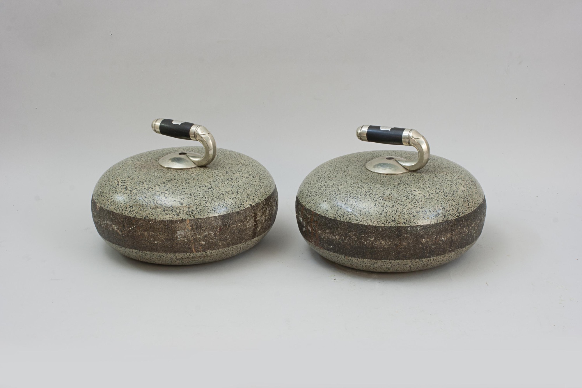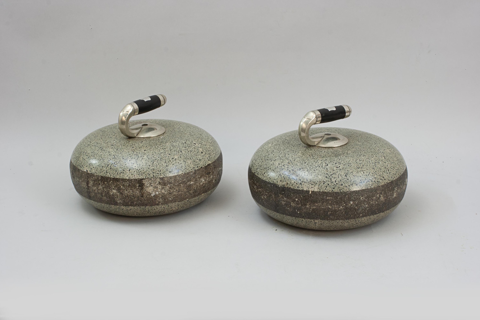 A fine pair of traditional Victorian double-soled grey granite curling stones. Each round, dressed stone features a shallow depression to the top and bottom, designed to accommodate the plated one-piece cast goose-neck handle with wooden grip. This construction allows the stones to be reversed and used on both sides.
