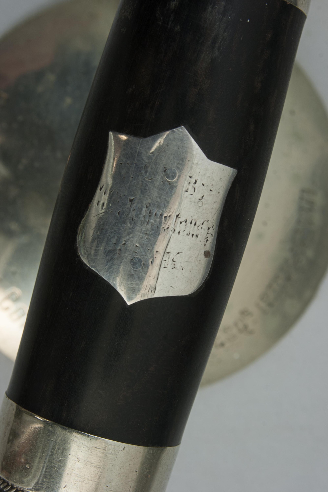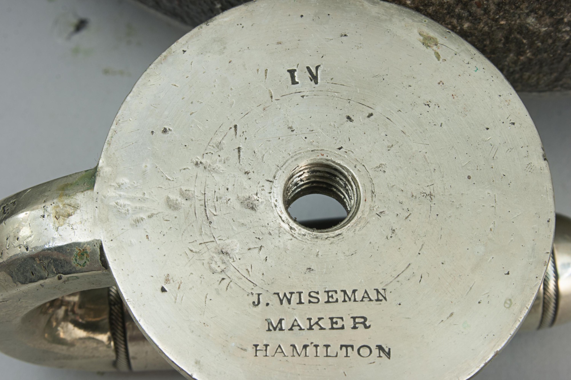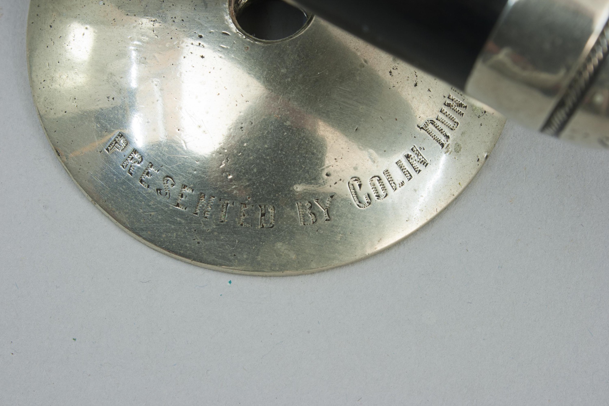 The striking band running around the circumference remains intact. Both handles are engraved: "PRESENTED BY COLIN DUNLOP JUNE ESQ., 11TH JULY 1871". Each wooden grip also bears an inset shield engraved with the winner's name, now too worn to decipher. The plated handles are stamped underneath: "J. Wiseman, Maker, Hamilton".