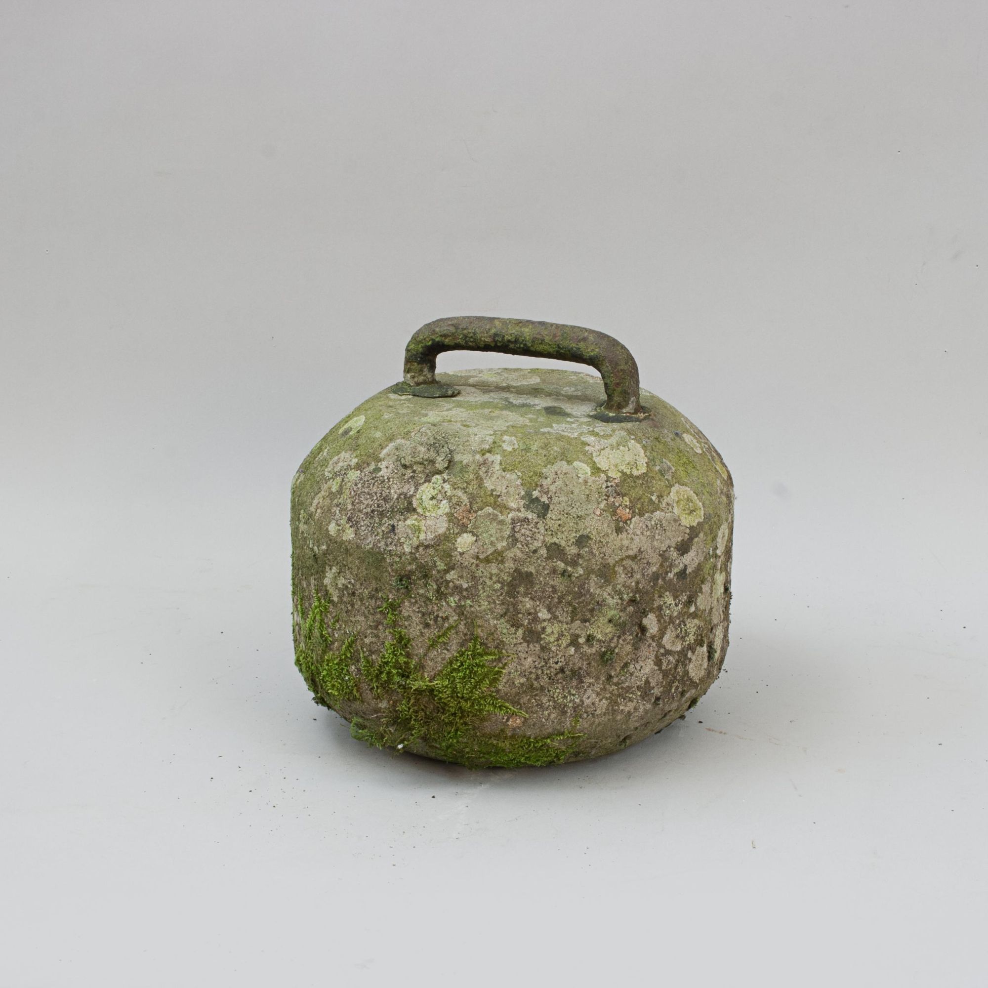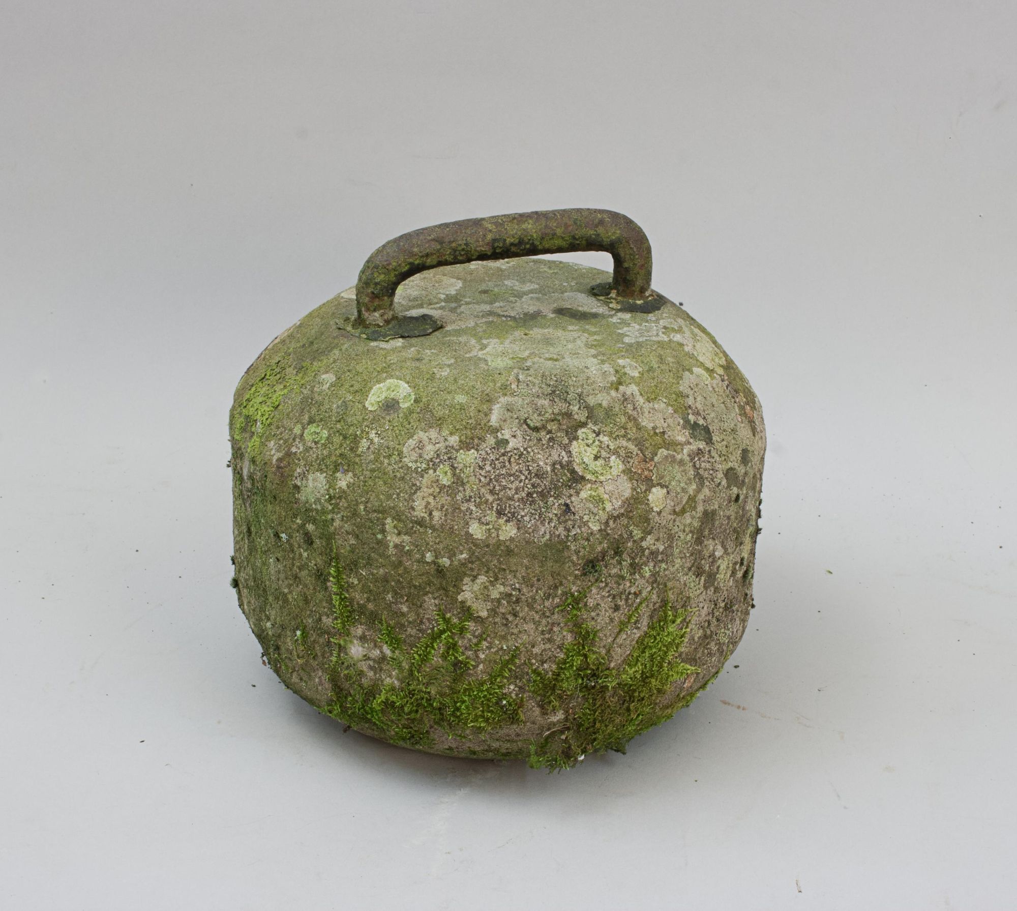 A very fine example of an early single-soled curling stone, of rough, unpolished granite with a forged iron hoop handle. The handle is permanently fixed with lead into holes bored into the top of the stone, a traditional early method of attachment.