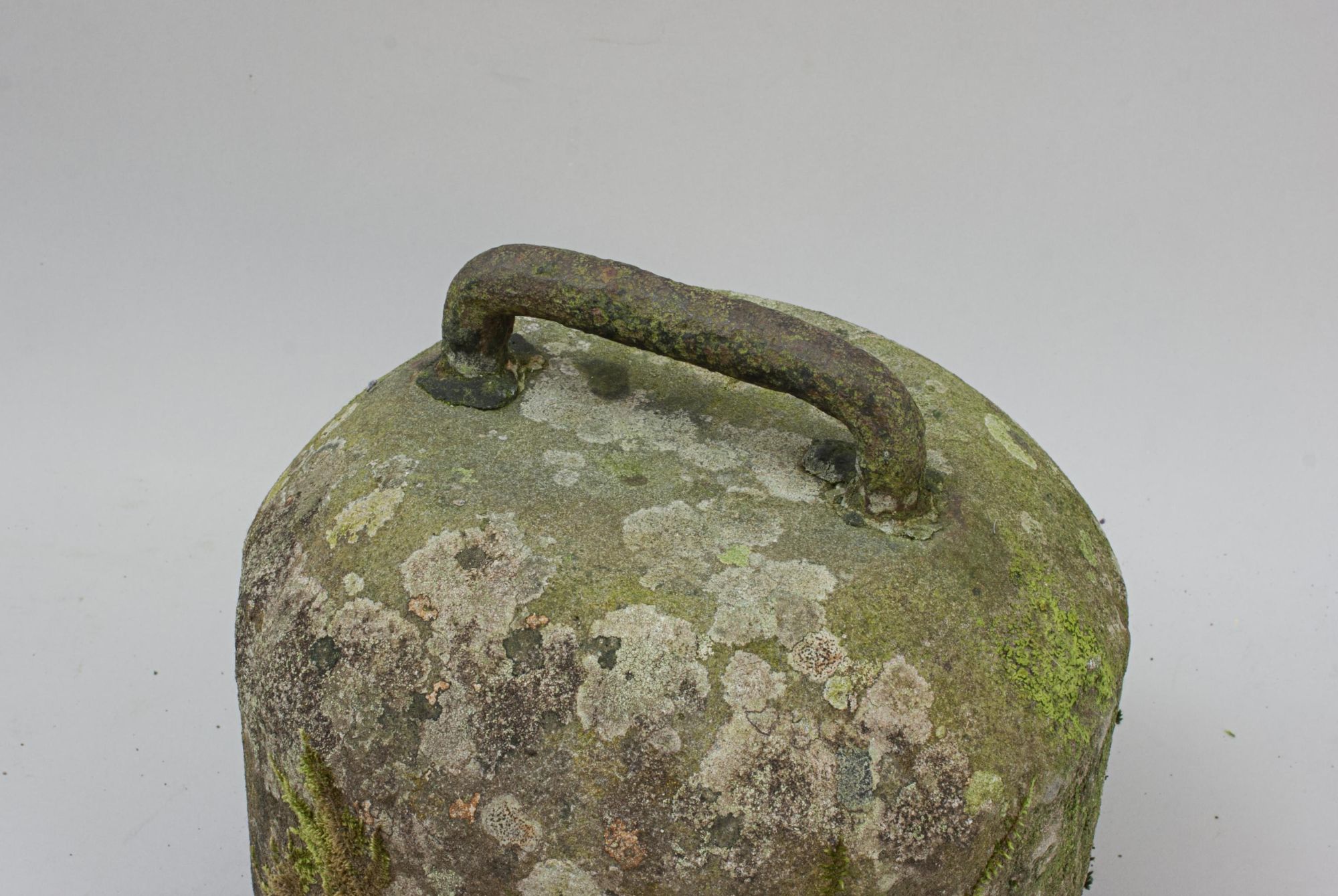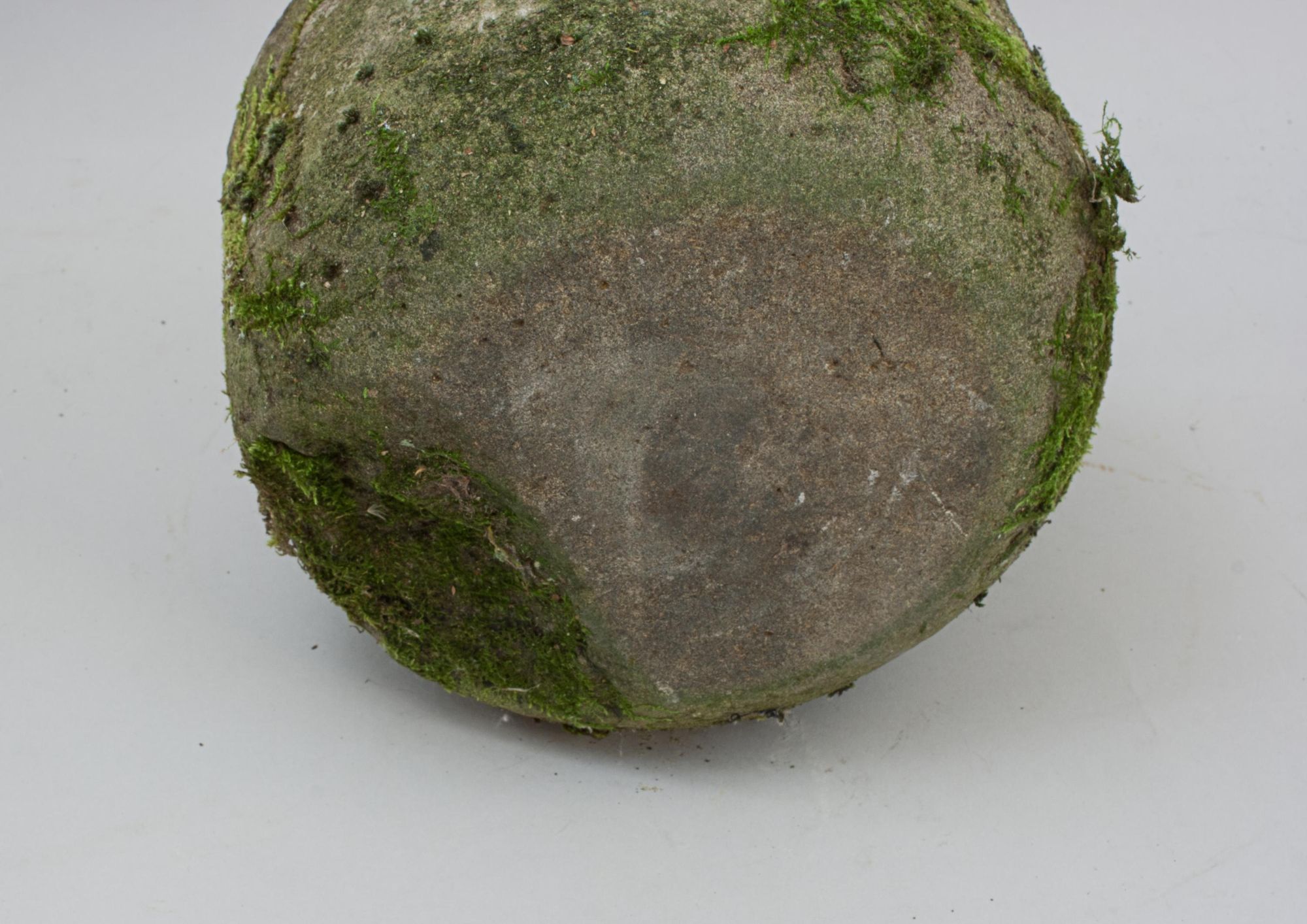 The stone retains a wonderful rustic character, with a coarse, natural surface and traces of moss, lichen, and algae, giving it a romantic, timeworn appeal. The striking band running around the circumference remains largely intact, though there is a small section missing below the band, evidence of a few hard encounters over its long life.