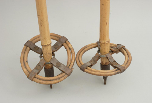 A nice pair of early flat top ash skis, polished with pointed tips and wedged tails, decorative grooves to the surface and the underside with a single groove along its length. A very nice pair of skis, stamped "220" & "1225" just in front of the fabric foot plates with simple metal toe bindings. The rear of the tip branded 'ALPESTRA' with a tree logo and 'P. Gleize, Cham Bery Onix' within an oval.