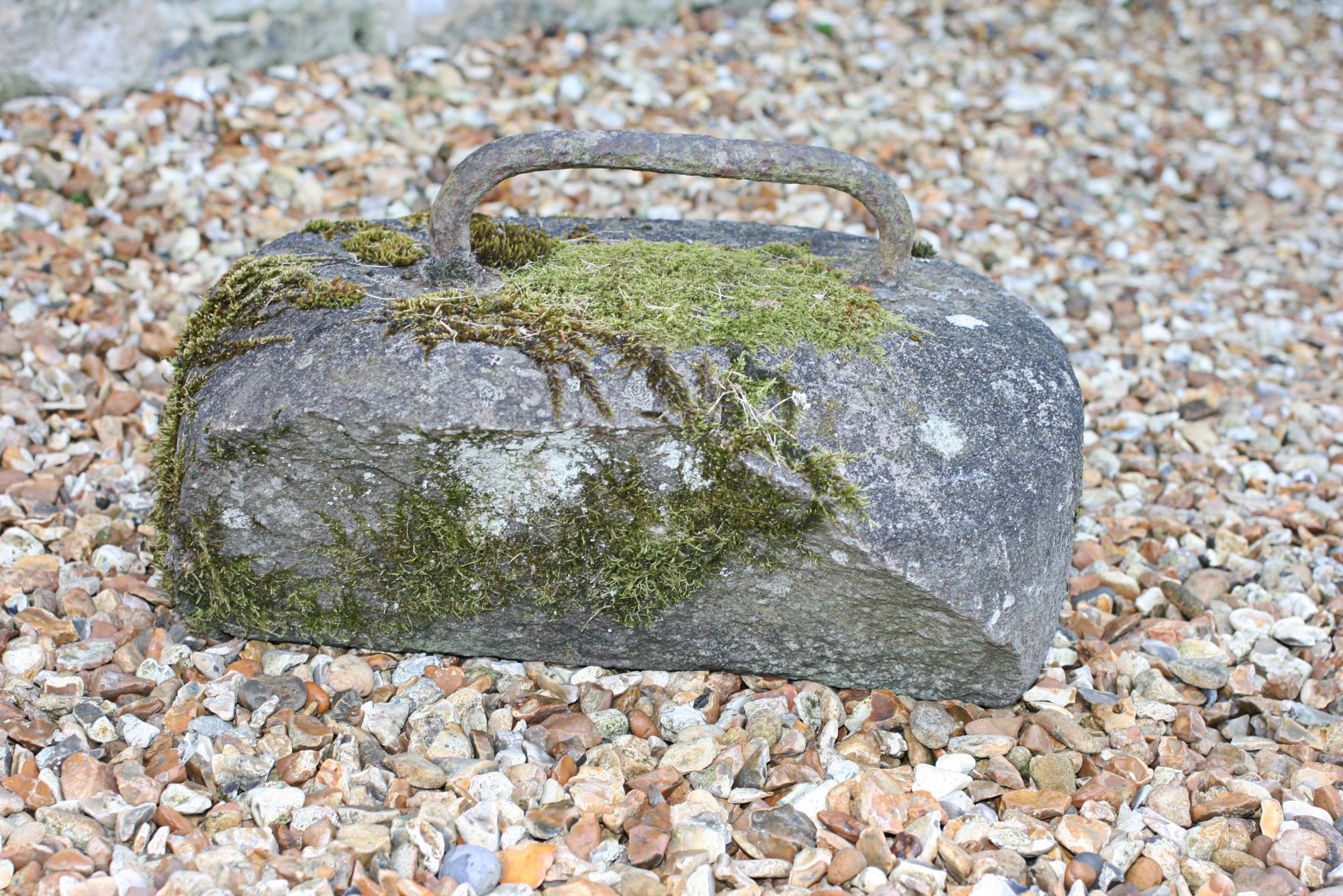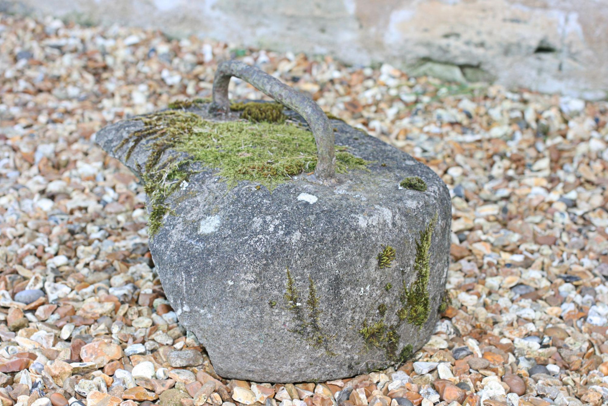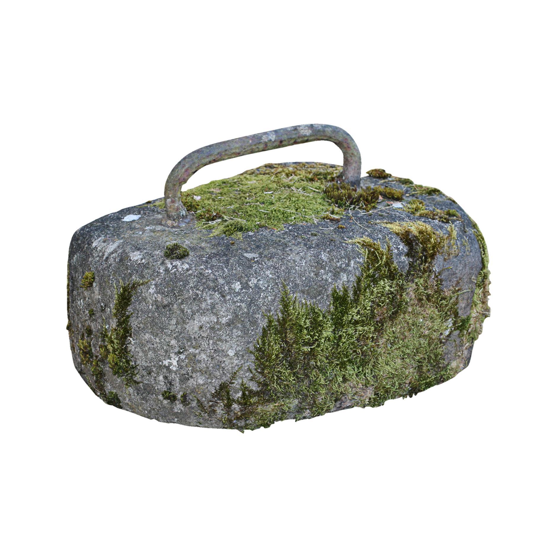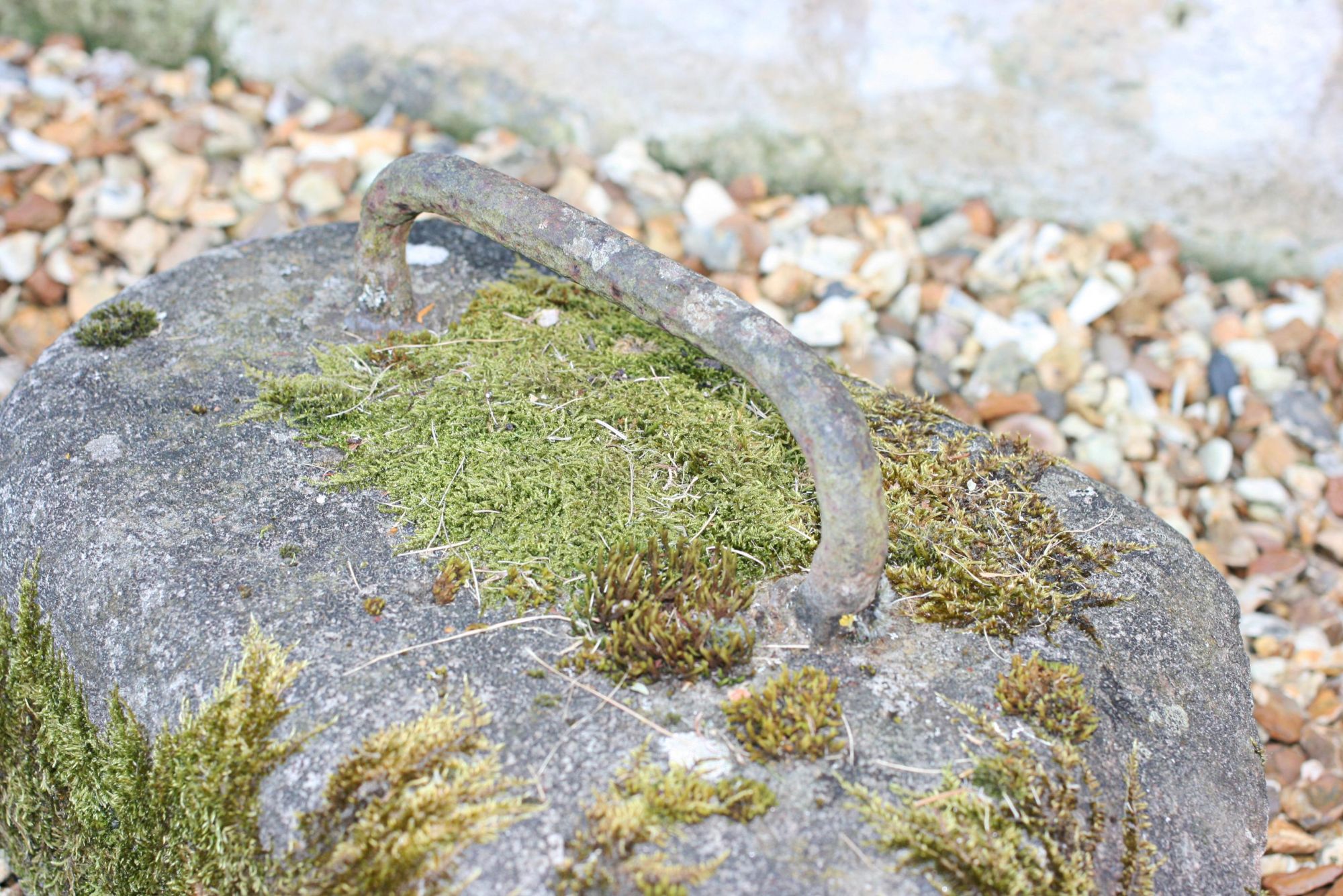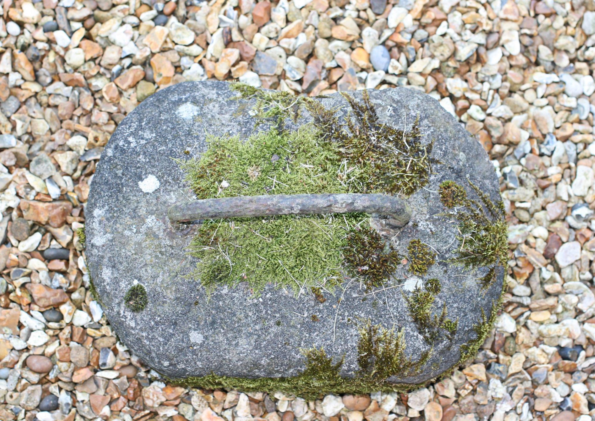 This stone retains a wonderful rustic charm, with a coarse, natural surface showing traces of moss, lichen, and algae, and evidence of hard encounters over its long life - including a small section missing at the rear (see images). It weighs approximately 40 kg, with a height of 23 cm including the handle.
