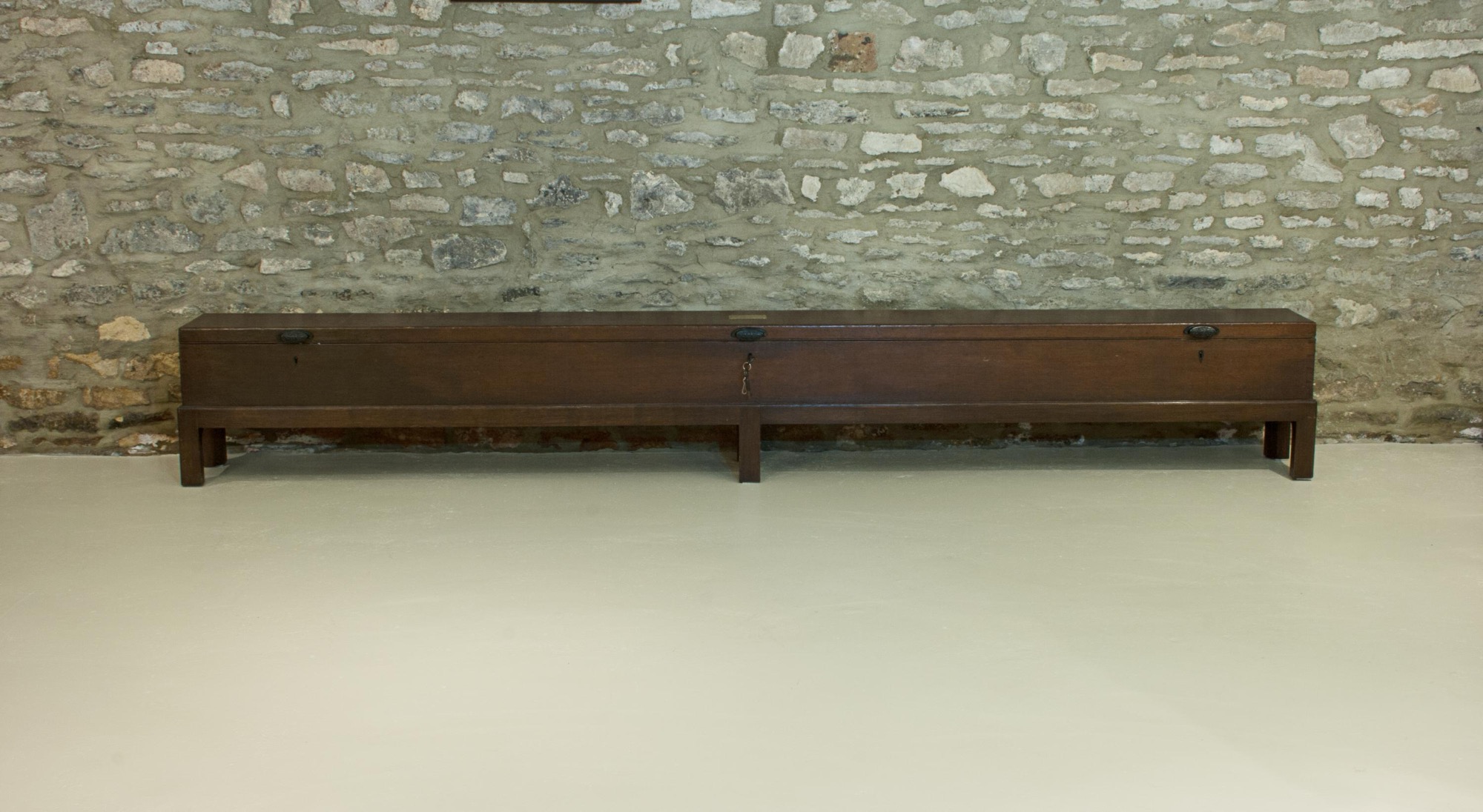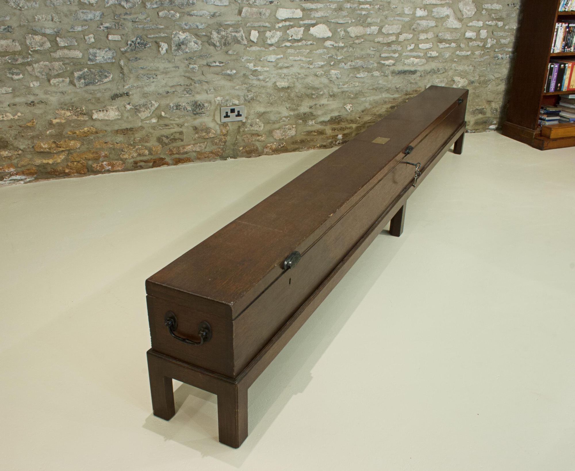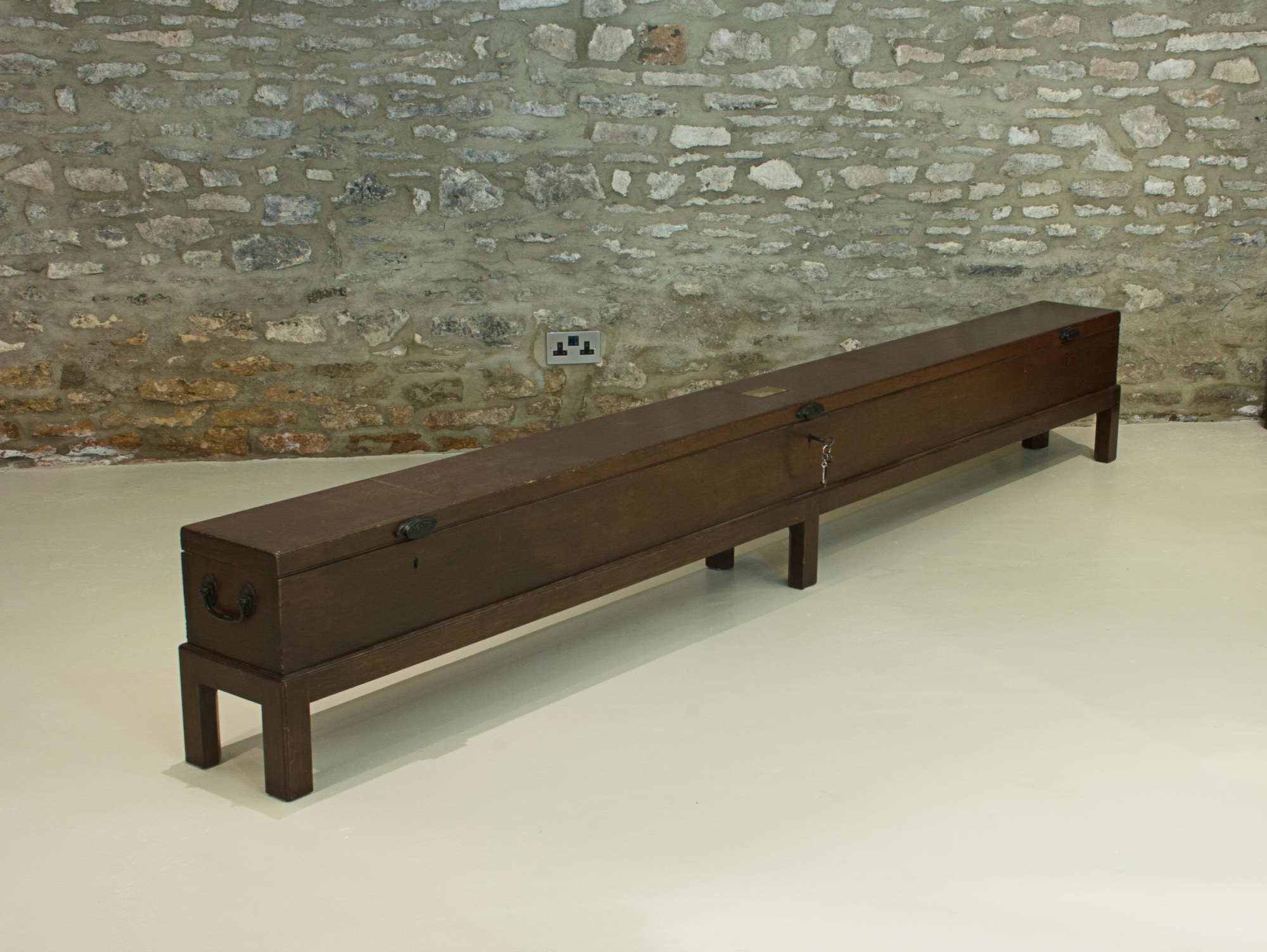 A very useful long narrow storage trunk set on six straight legs, the four end legs with moulded edges. Two large metal carry handles at either end with three locks and handles on the front, locks with working keys. Reputed to have come from The Archers Hall, Edinburgh (there is a brass plaque on the lid 'Archers Hall, Edinburgh'). Archers' Hall is the club house of the Royal Company of Archers, the Sovereign's Bodyguard in Scotland. It is located at 66 Buccleuch Street in the Southside of Edinburgh. The narrow storage trunk was used to store archery equipment, arrows and yew wood long bows. With an added cushion it would make a very useful bench with the added use of storage.