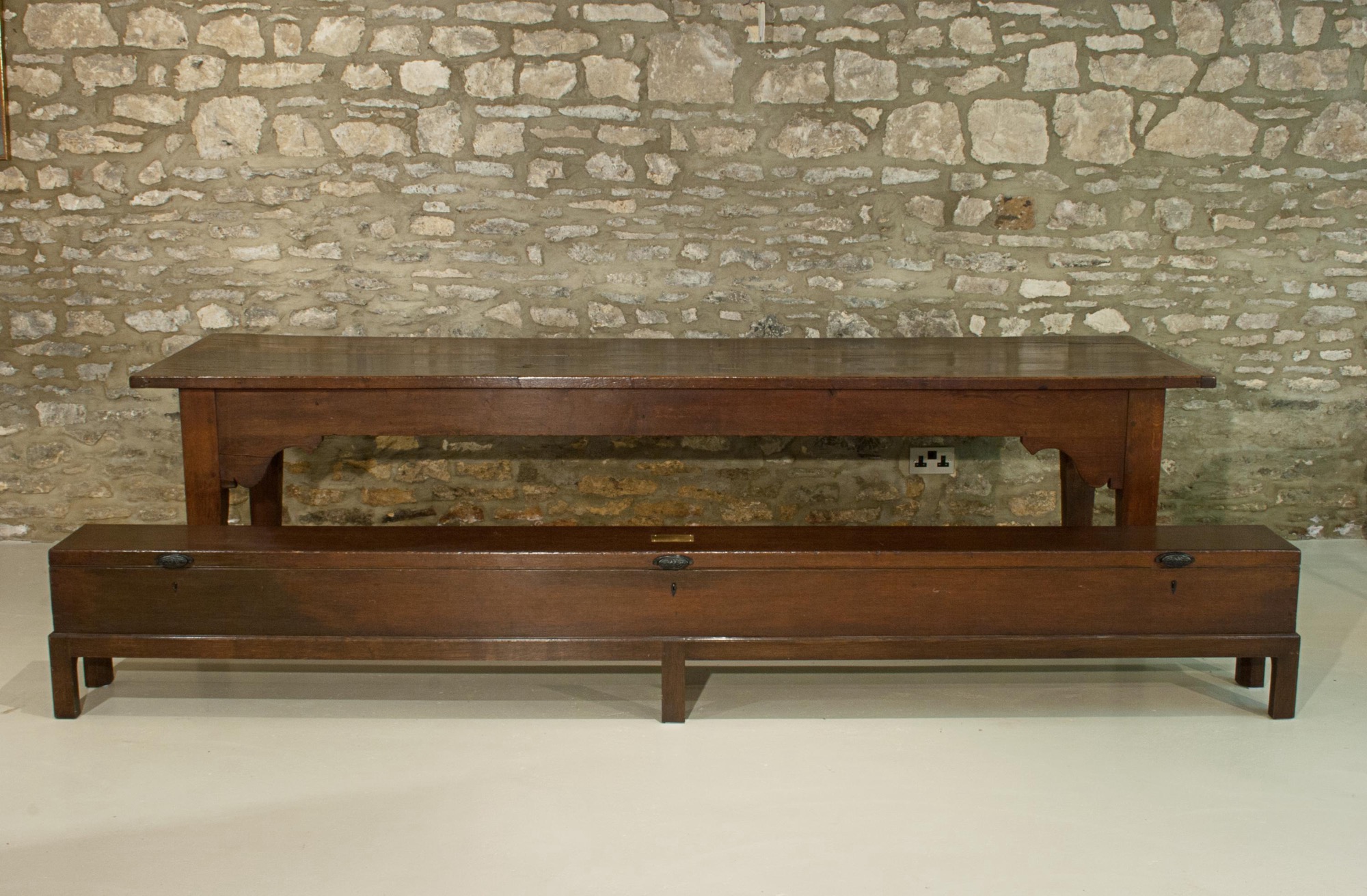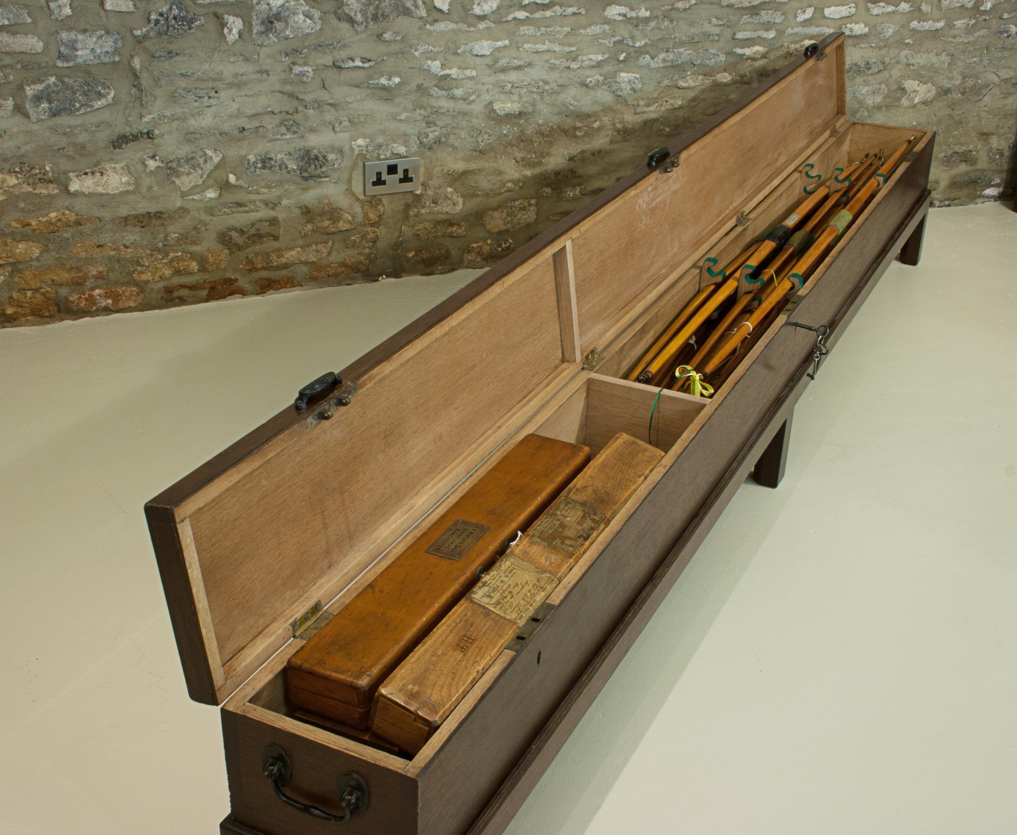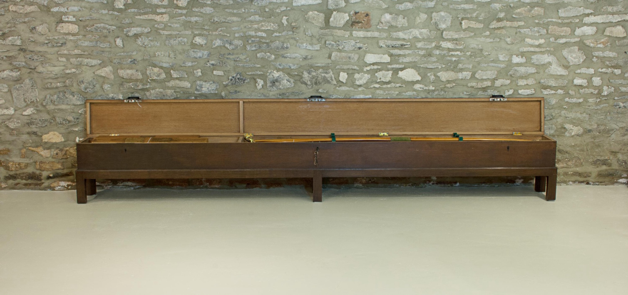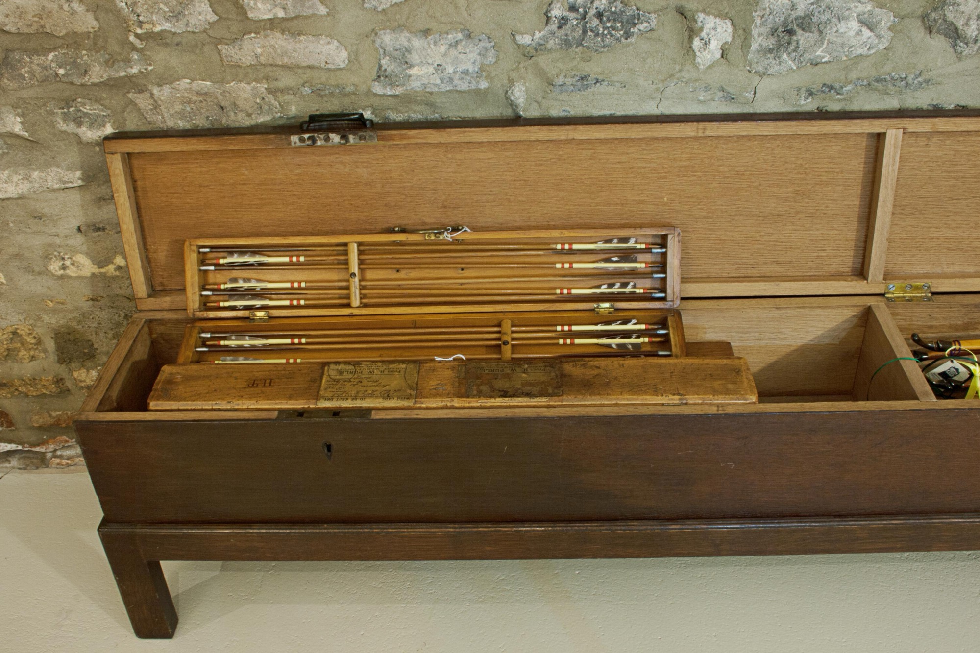 A very useful long narrow storage trunk set on six straight legs, the four end legs with moulded edges. Two large metal carry handles at either end with three locks and handles on the front, locks with working keys. Reputed to have come from The Archers Hall, Edinburgh (there is a brass plaque on the lid 'Archers Hall, Edinburgh'). Archers' Hall is the club house of the Royal Company of Archers, the Sovereign's Bodyguard in Scotland. It is located at 66 Buccleuch Street in the Southside of Edinburgh. The narrow storage trunk was used to store archery equipment, arrows and yew wood long bows. With an added cushion it would make a very useful bench with the added use of storage.