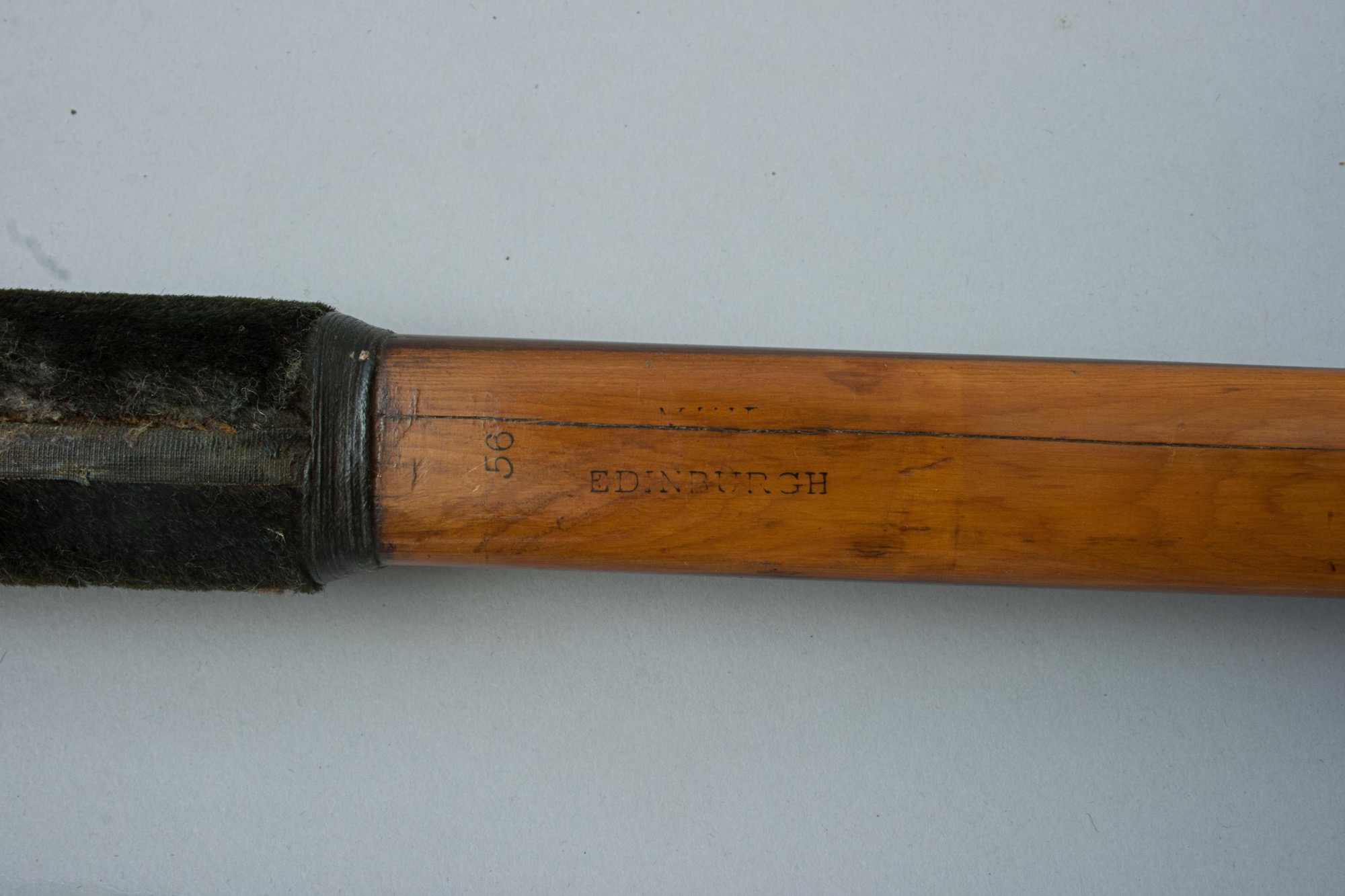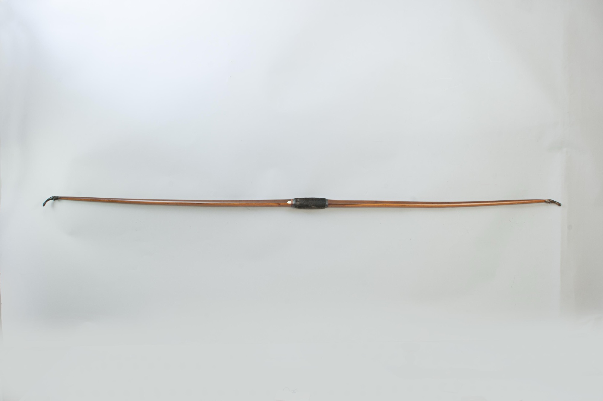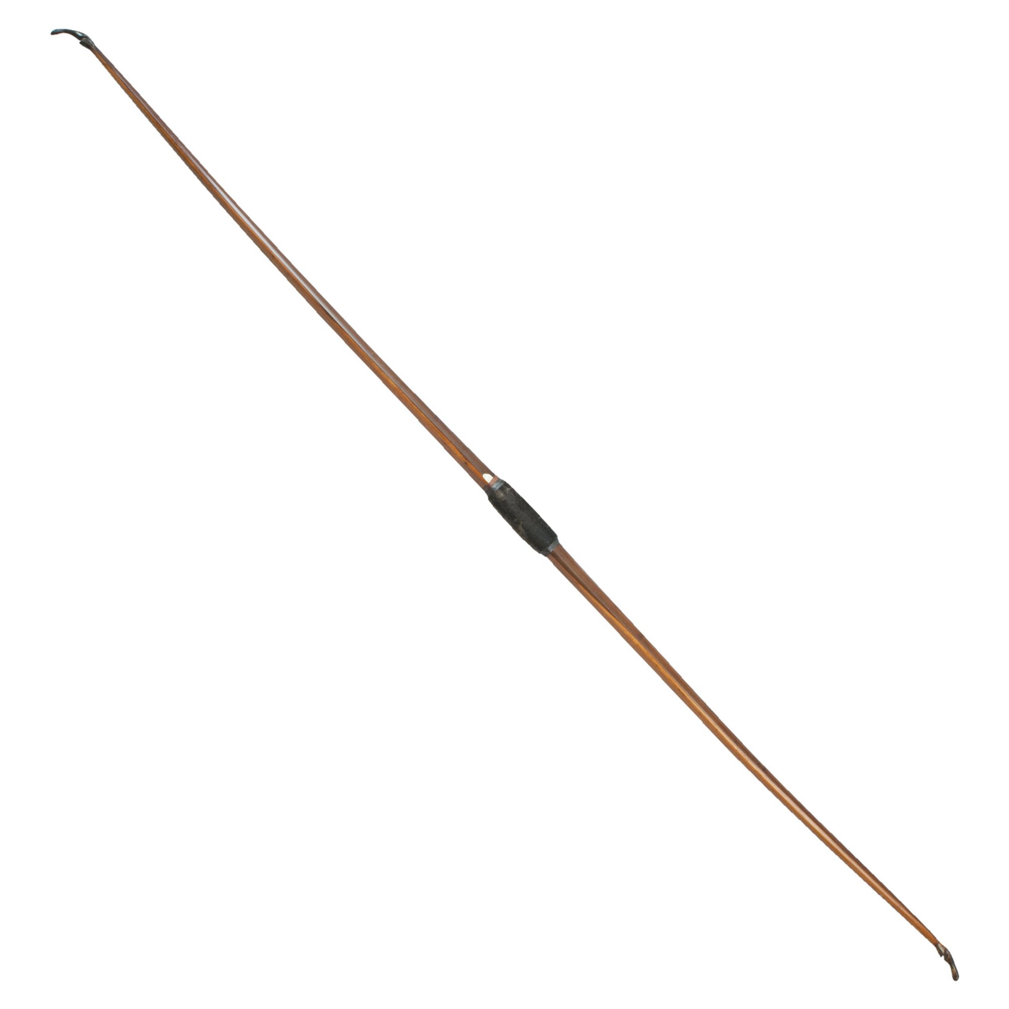 A very good archery long bow, produced by Peter Muir, the Scottish bowyer (bow-maker) from Edinburgh. The bow is fitted with two horn nocks, a mother - of - pearl arrow plate (sometimes called an Arrow Pass) and a handle covering of green velvet. Just above the grip is the makers name 'Muir Edinburgh' and the number 56, indicating the draw weight of this bow in lbs. A nice self-bow, most probably Continental yew, as Muir was well known for choosing his wood from the Continent as it was better quality. Bow in good original condition.