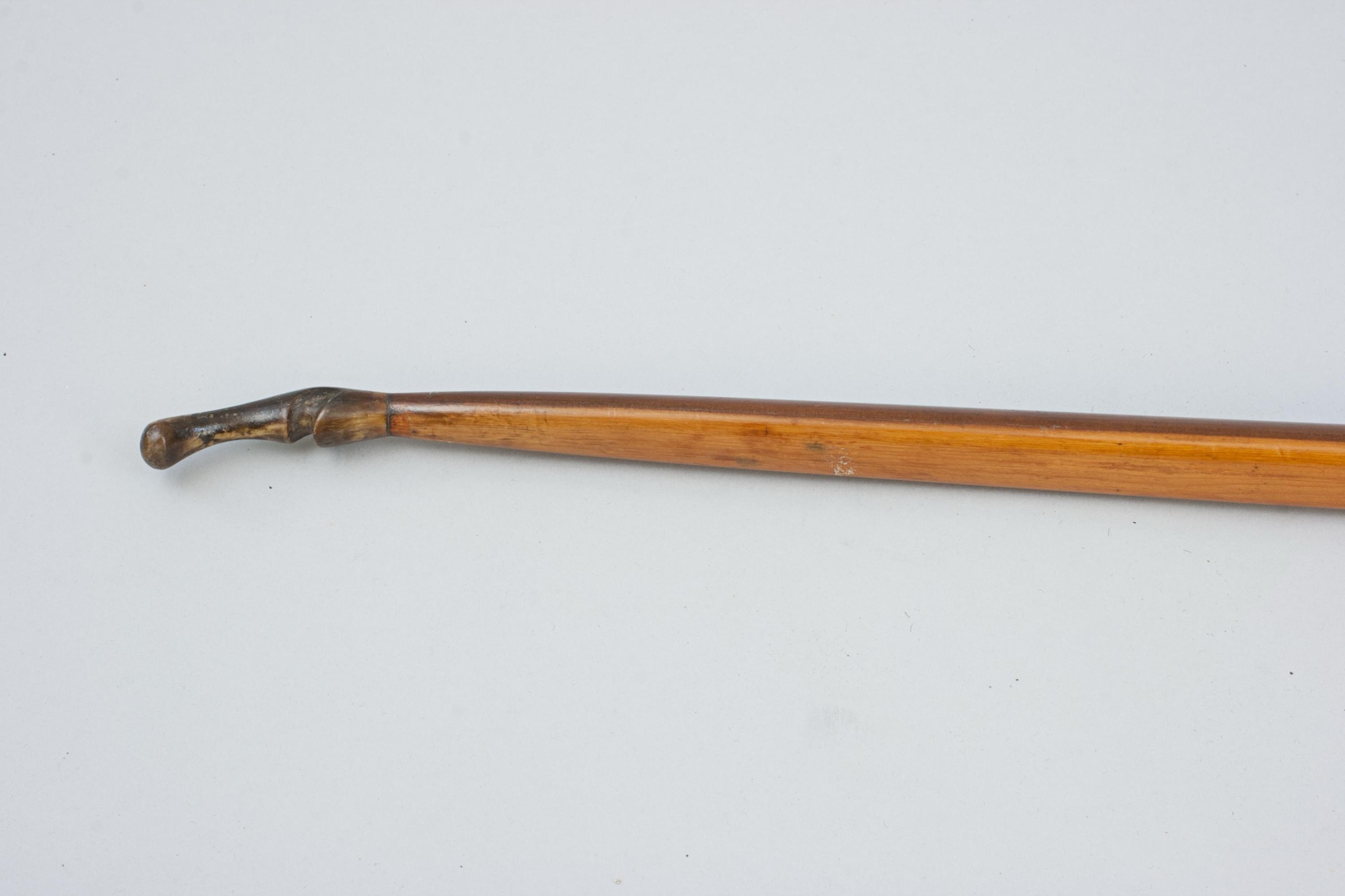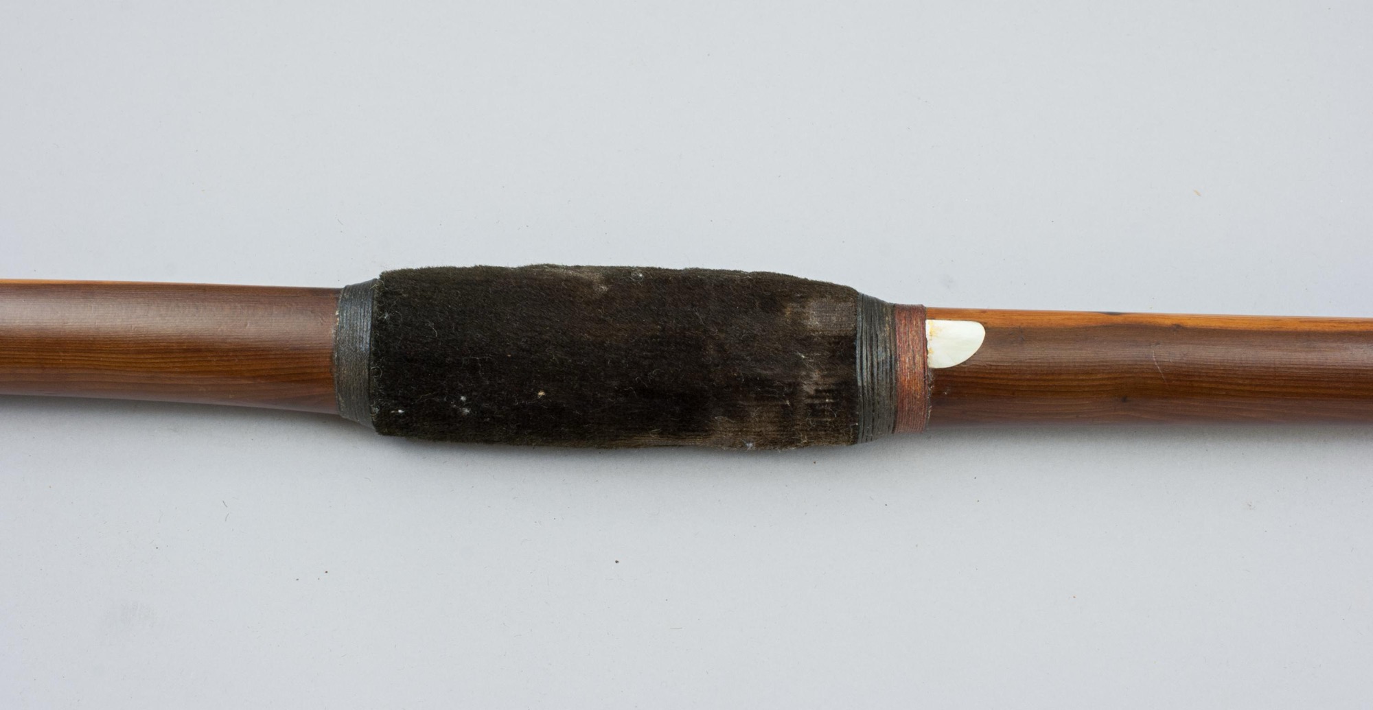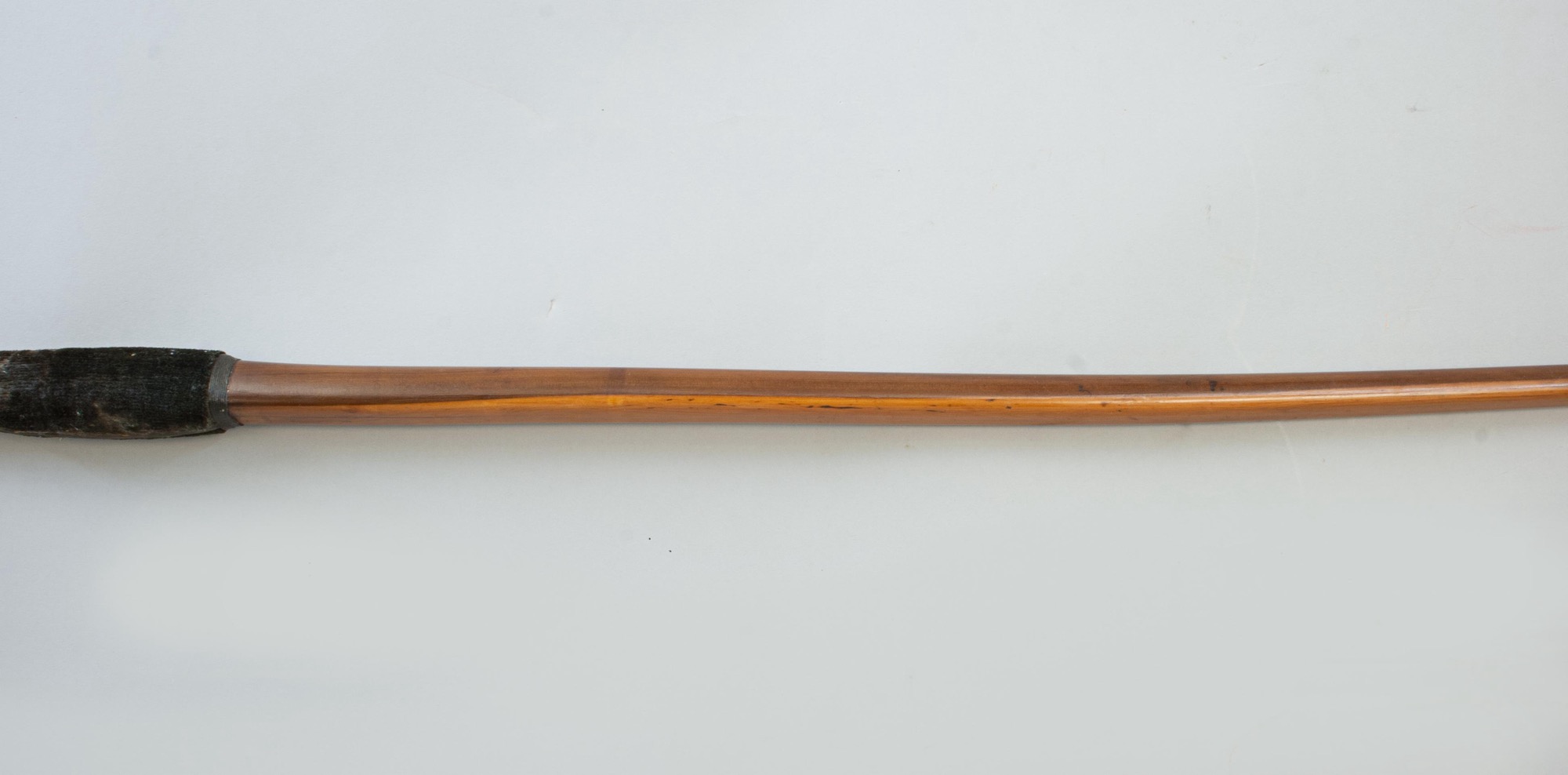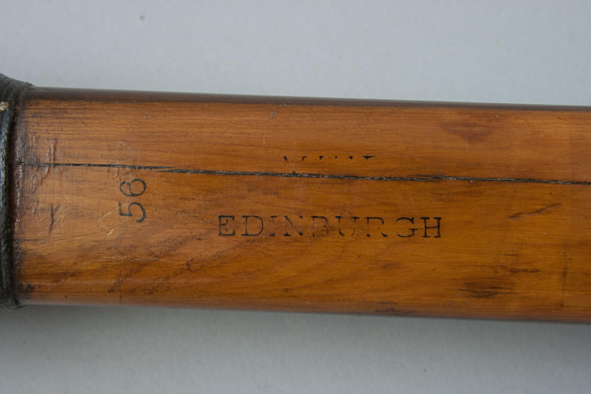 A very good archery long bow, produced by Peter Muir, the Scottish bowyer (bow-maker) from Edinburgh. The bow is fitted with two horn nocks, a mother - of - pearl arrow plate (sometimes called an Arrow Pass) and a handle covering of green velvet. Just above the grip is the makers name 'Muir Edinburgh' and the number 56, indicating the draw weight of this bow in lbs. A nice self-bow, most probably Continental yew, as Muir was well known for choosing his wood from the Continent as it was better quality. Bow in good original condition.