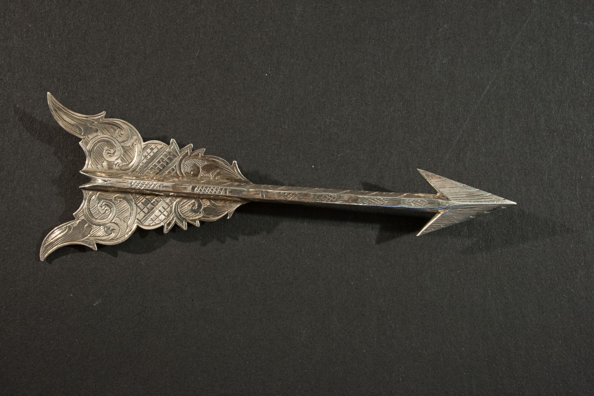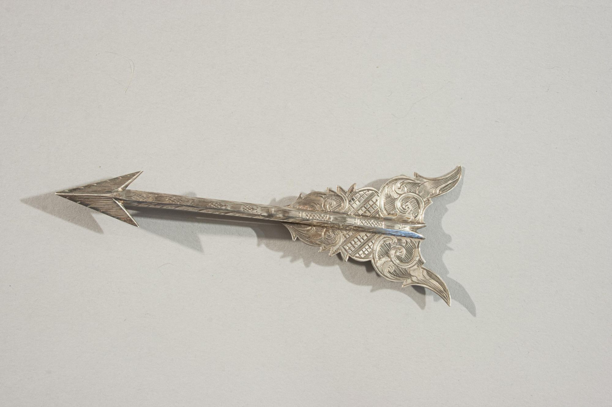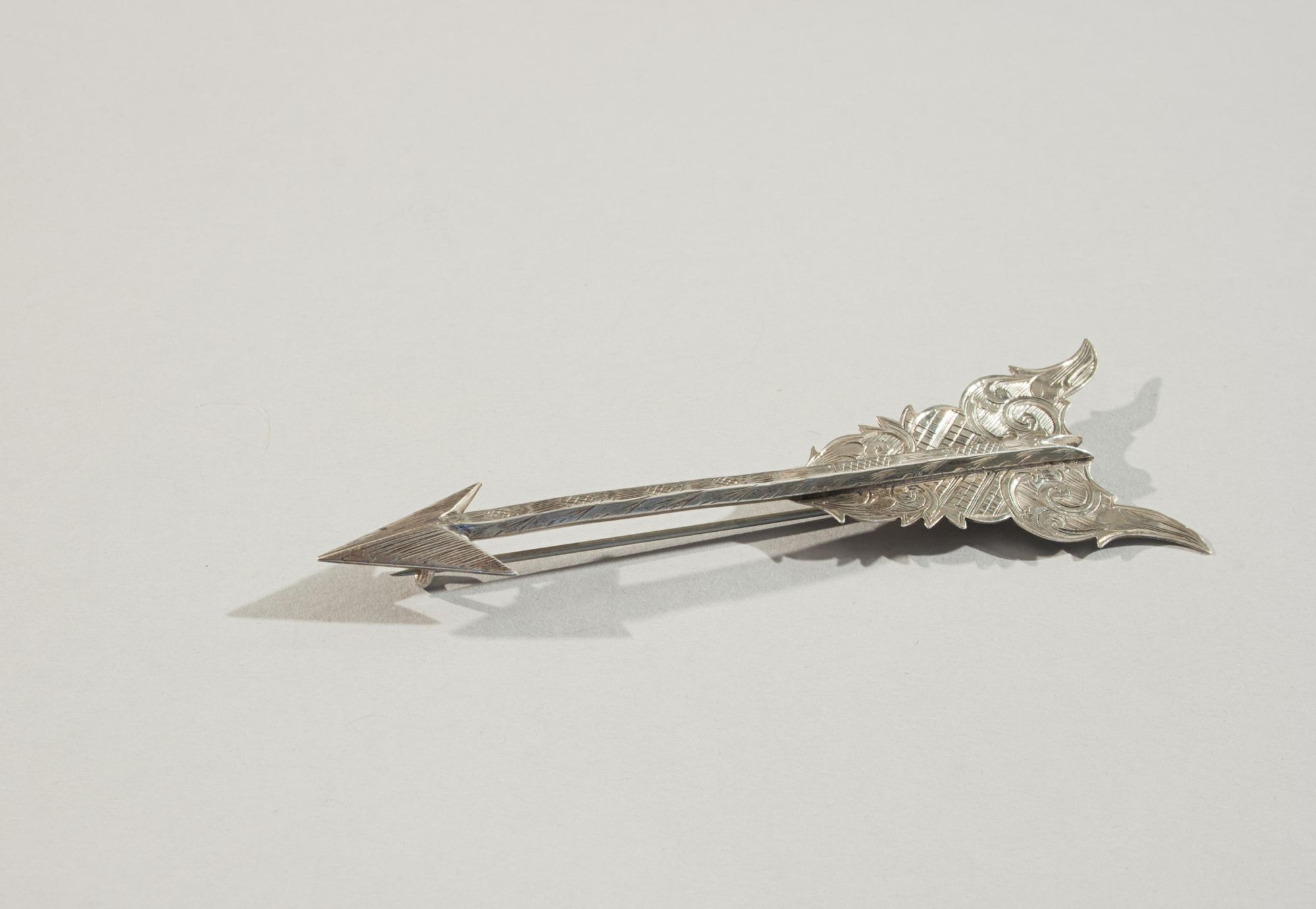 A nice single archery arrow with original brooch pin. This antique Scottish kilt pin, brooch, label pin is ornately decorated on the arrowhead, fletching and shaft.