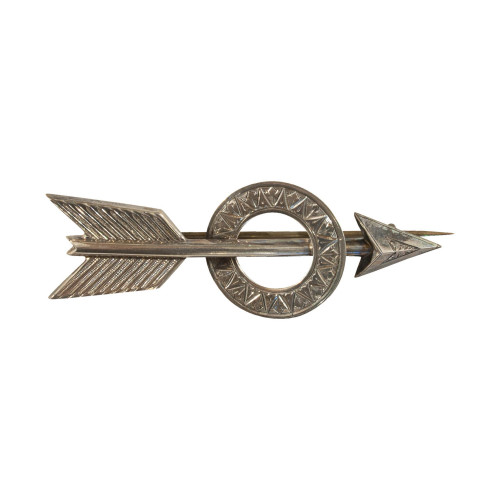 Archery quiver made of tin containing a selection of 10 arrows. The arrows are made of pitch pine with metal tips. The name 'F. LL. OSWELL' can be found written in pen on some of the arrows.