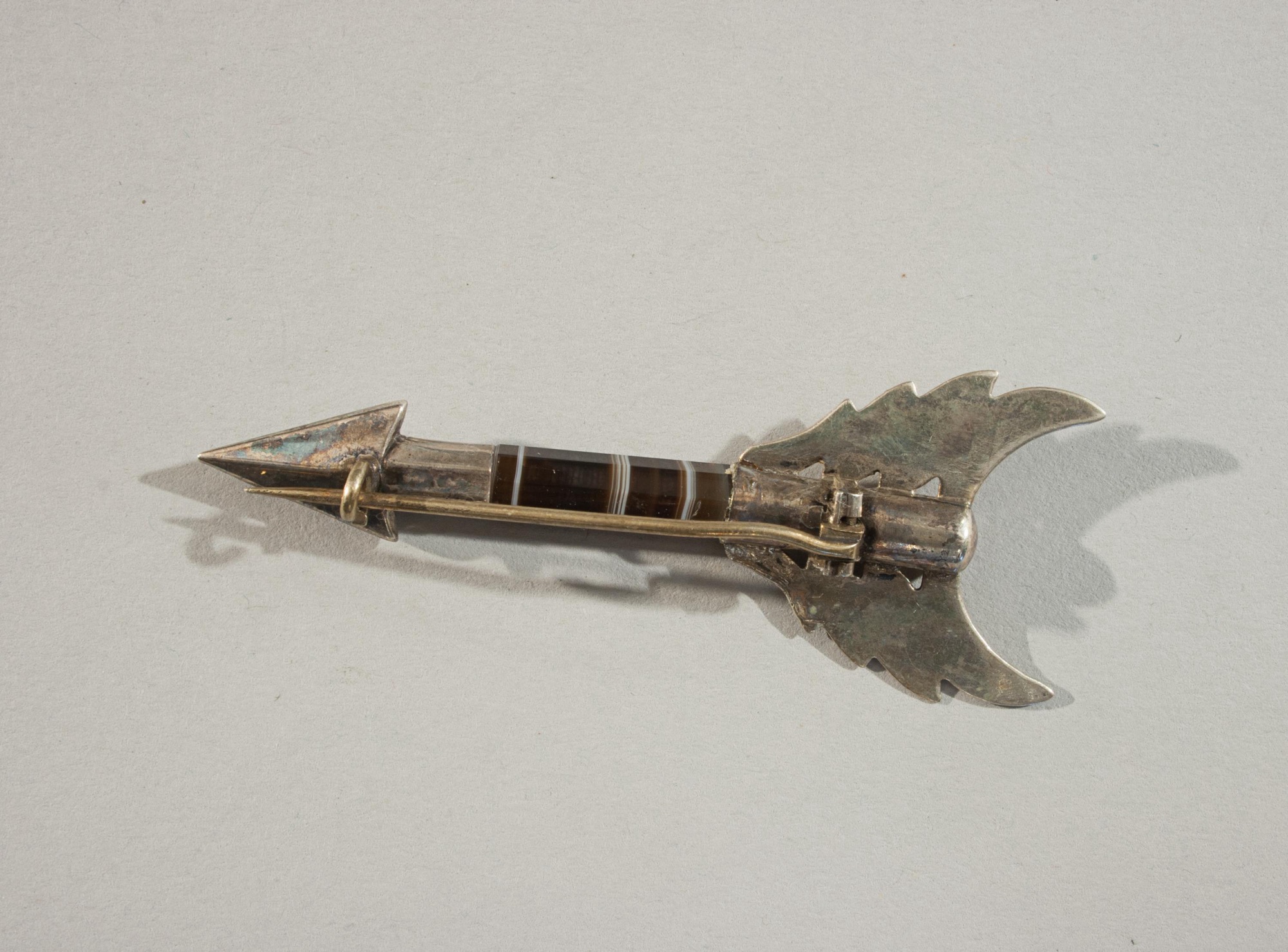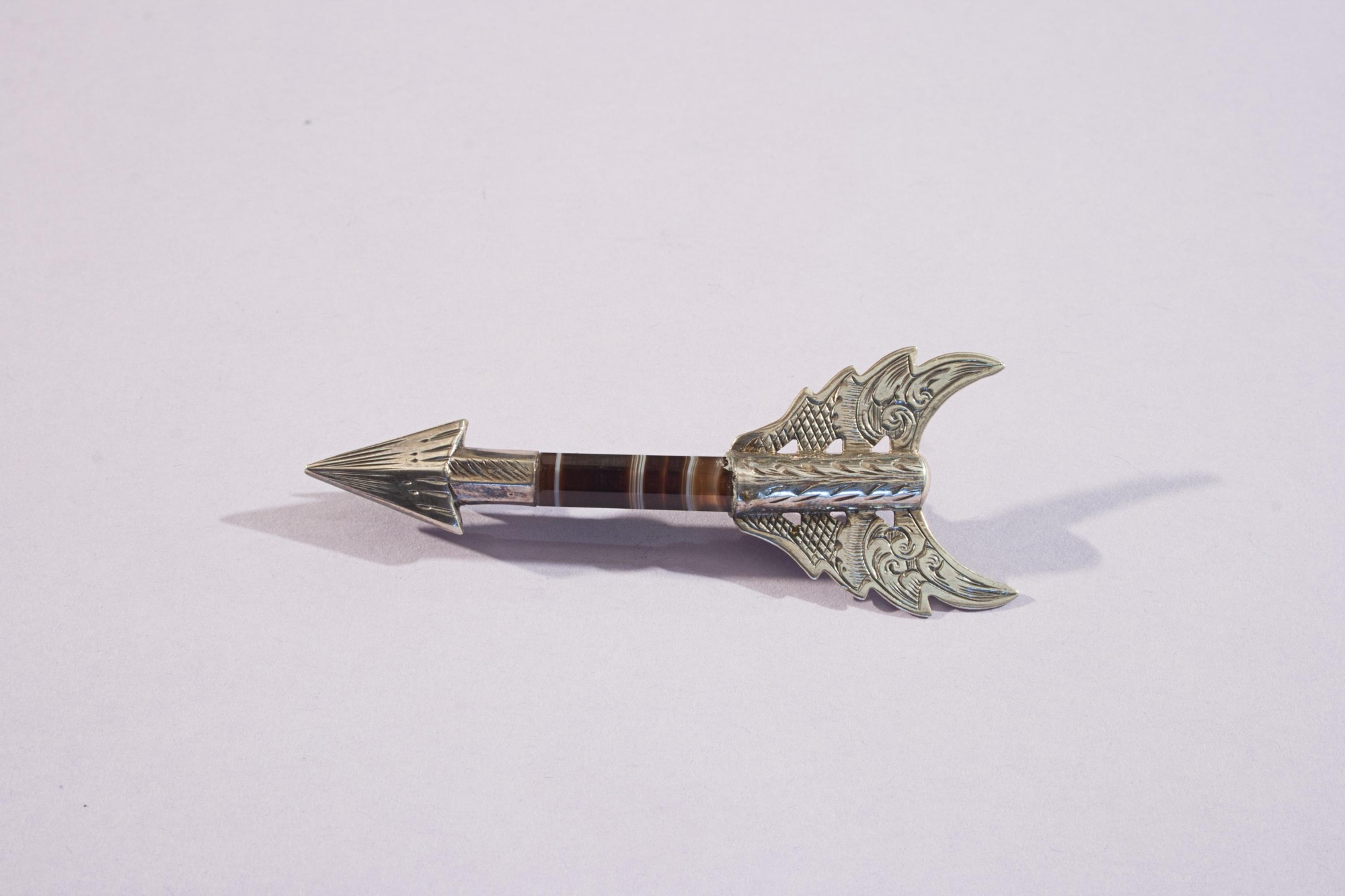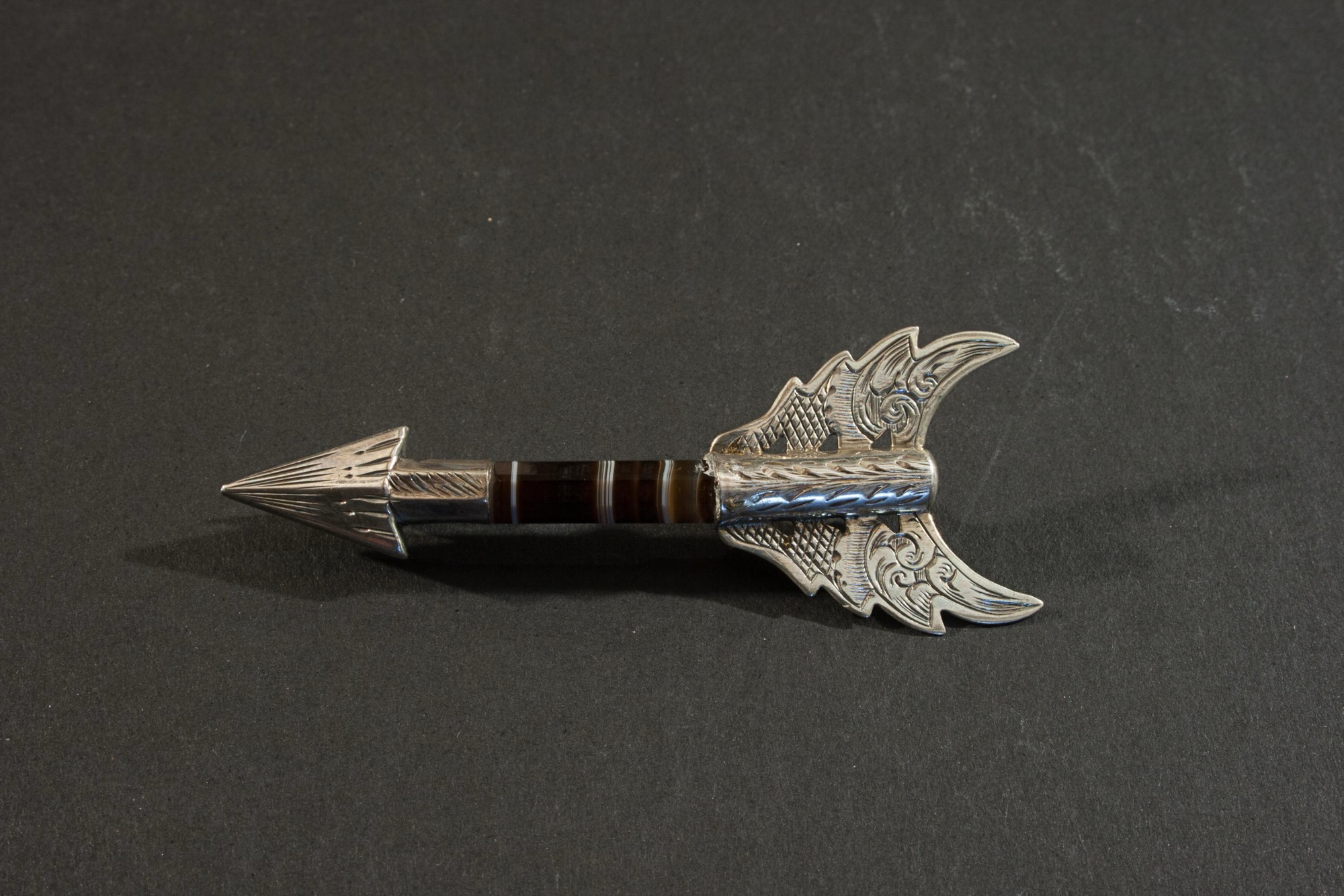 A striking example of 19th-century Scottish jewellery, this antique arrow-shaped brooch showcases exquisite craftsmanship and attention to detail. The arrowhead and fletching are finely engraved in sterling silver, while the shaft features polished natural octagonal banded carnelian, agate, highlighting its unique patterns and warm, earthy tones.