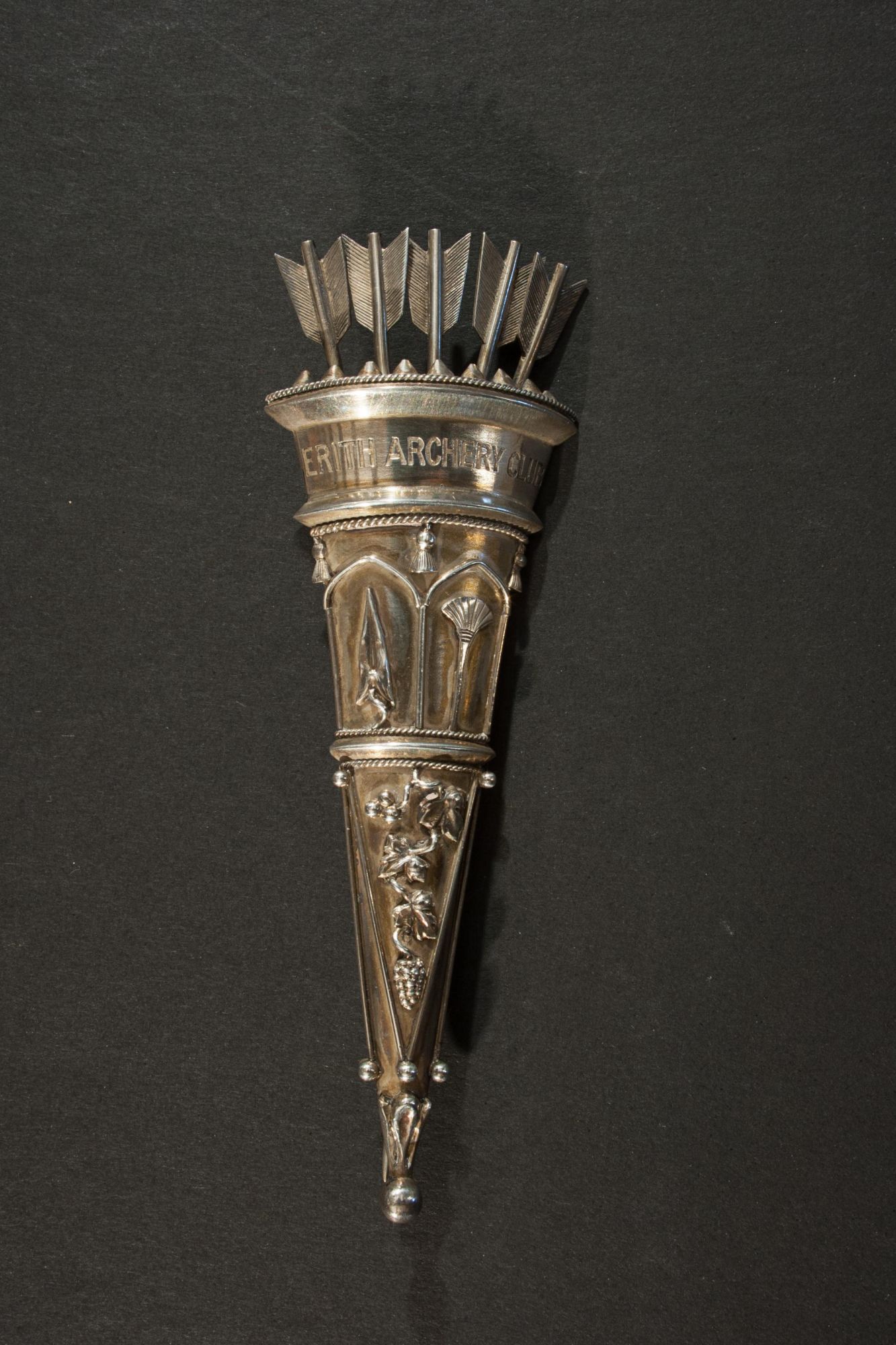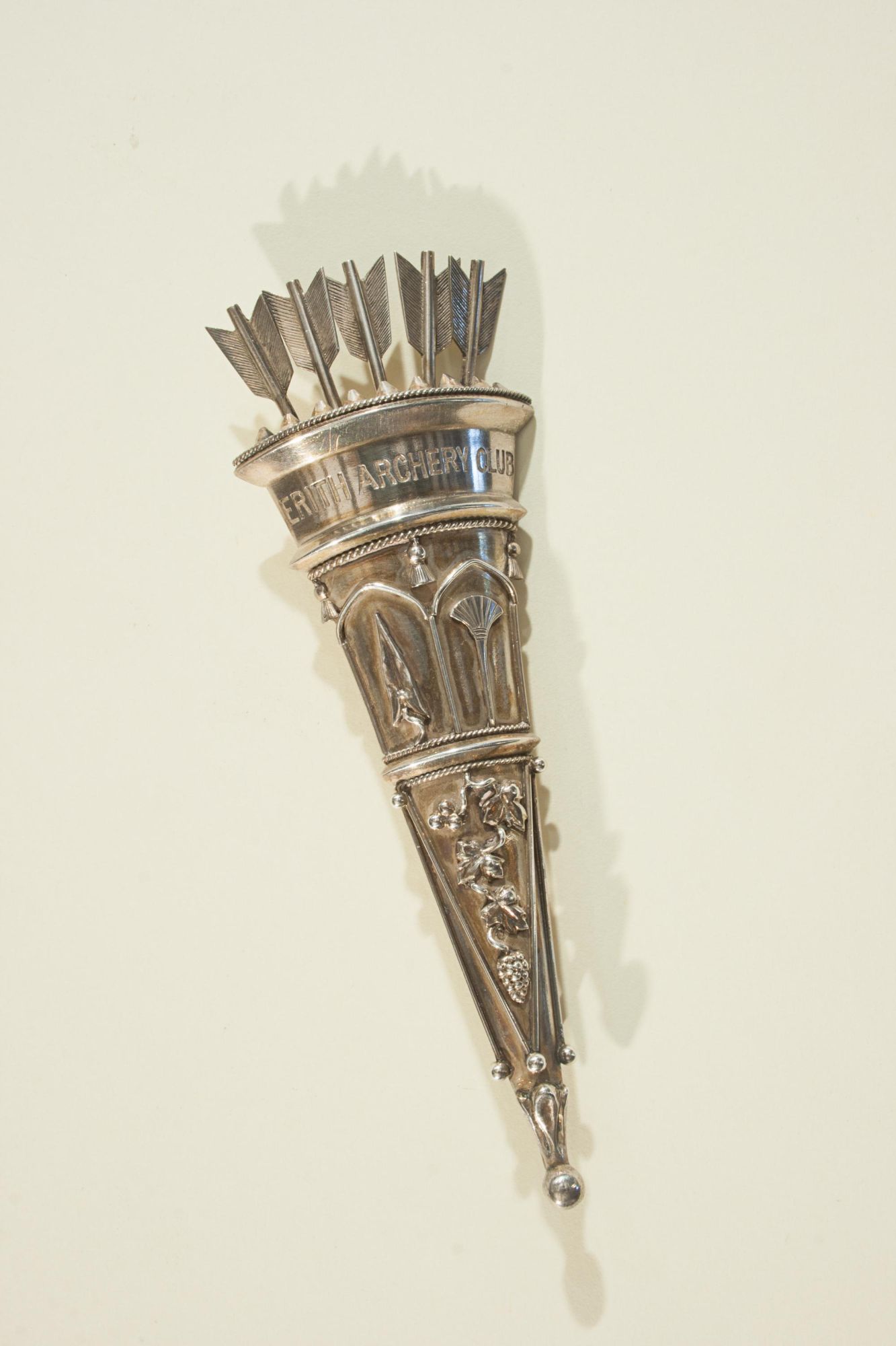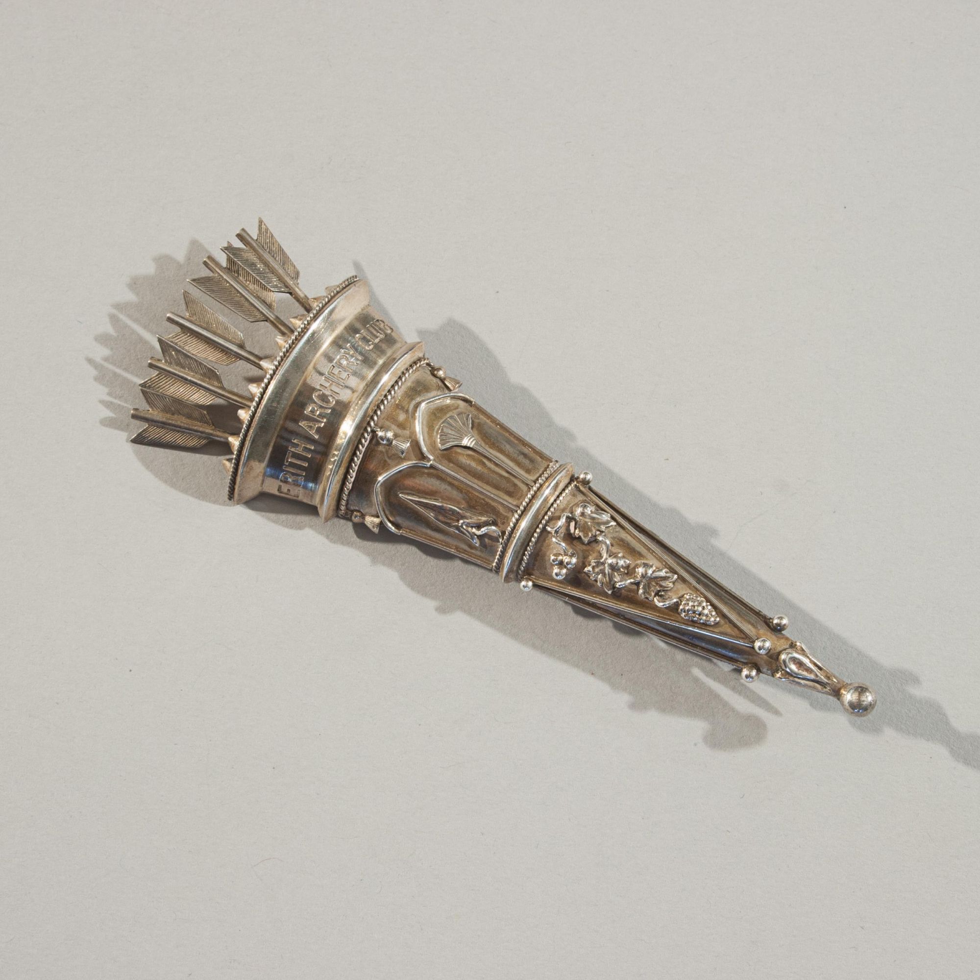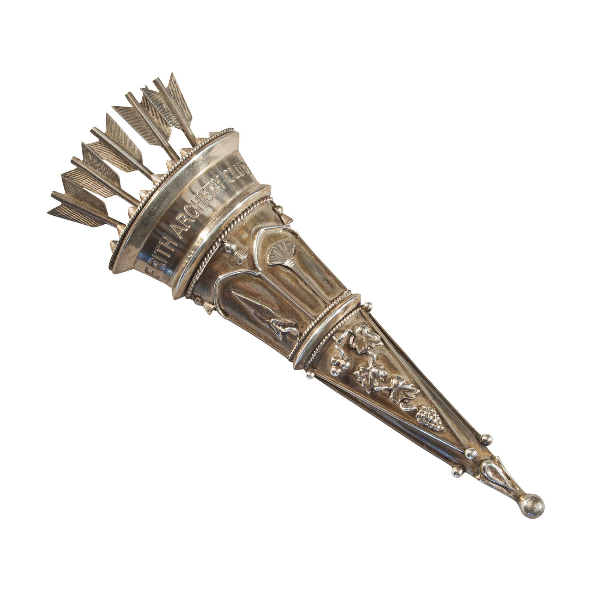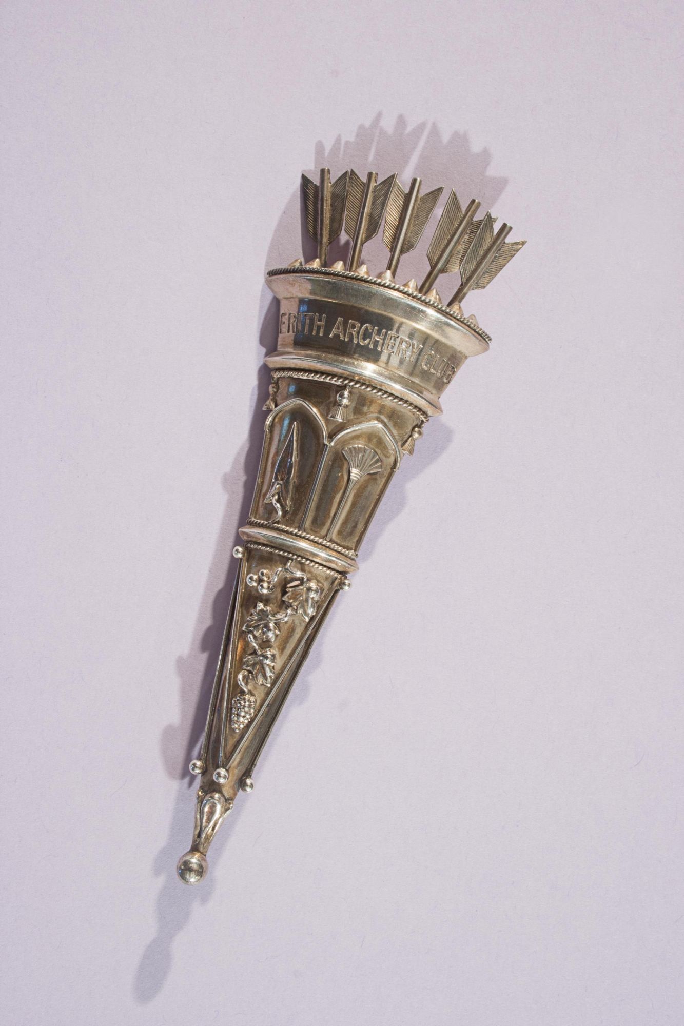 An attractive antique archery brooch, designed in the form of a quiver filled with arrows. The quiver is exquisitely detailed, with five arrow fletchings emerging from the top, and is finely engraved with the inscription 'Erith Archery Club'. The brooch retains its original pin fastening.