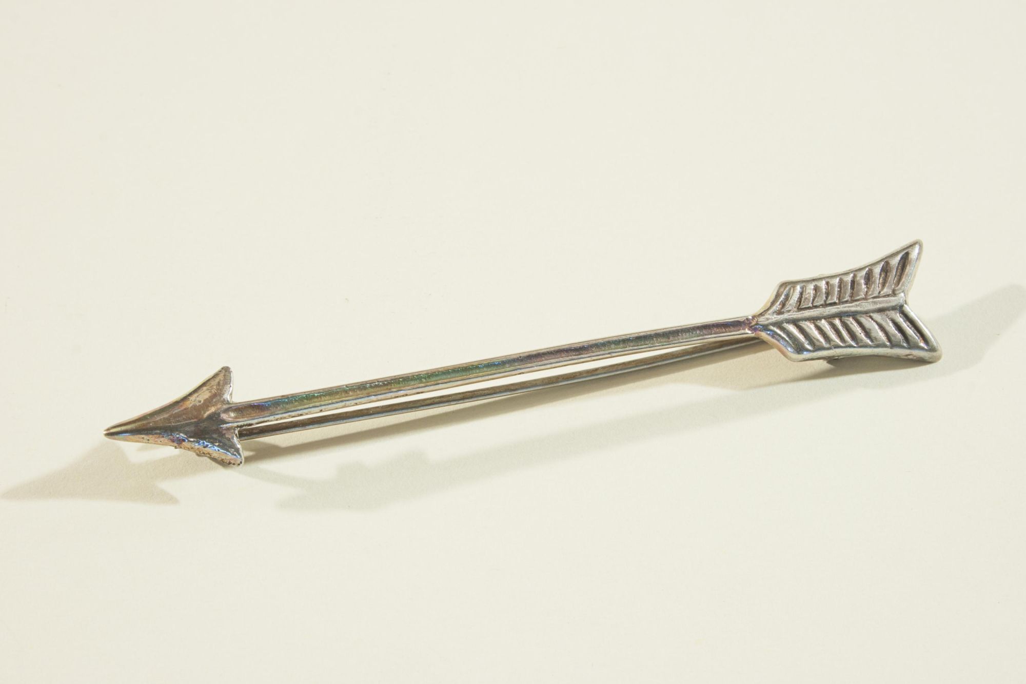 A nice single silver archery arrow pin with original brooch pin. The arrow is fully hallmarked on the rear of the flight, displaying the lion passant for sterling silver, the tree assay mark for Glasgow, The Thistle mark to indicate the silver is of sterling quality (92.5% pure) and the date letter "Y" corresponding to 1921. Along with the maker's mark "G & W" for Gilmour & Watson, Mitchell Street, Glasgow. This is a lovely brooch, lapel pin or kilt pin for the archery enthusiast.