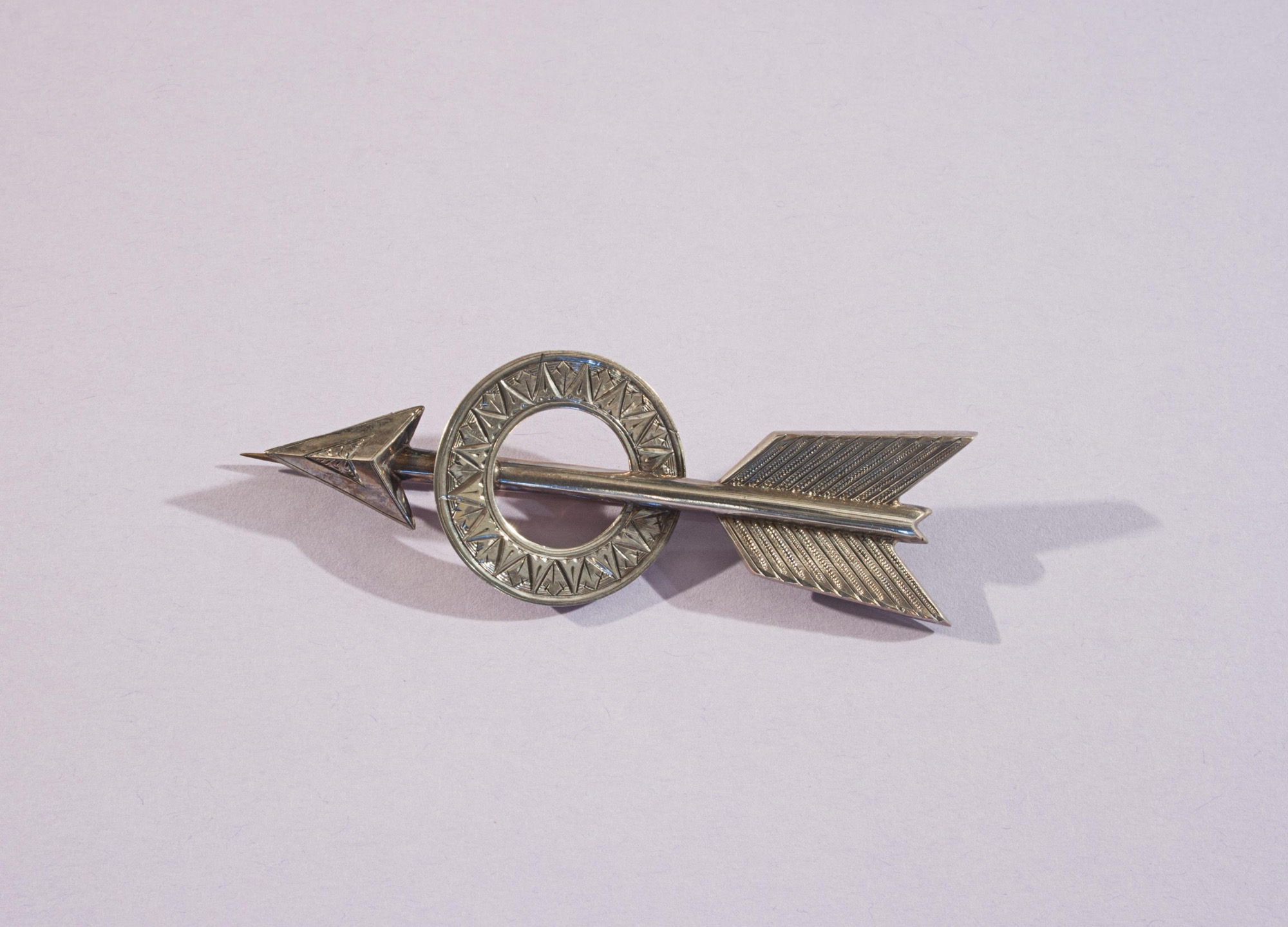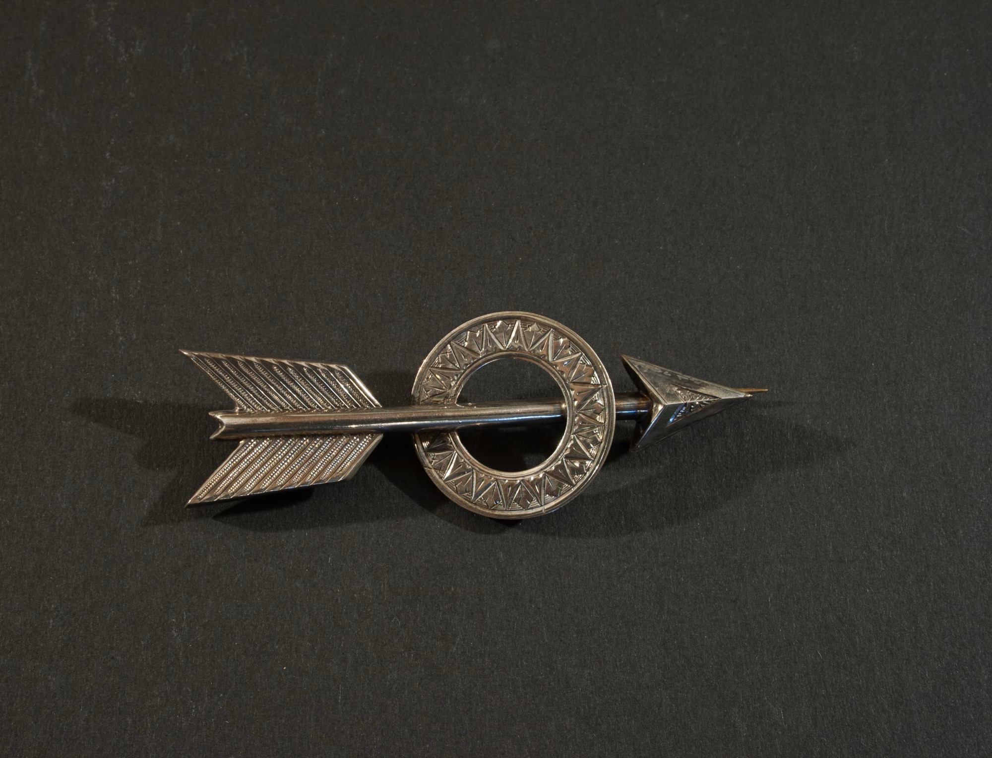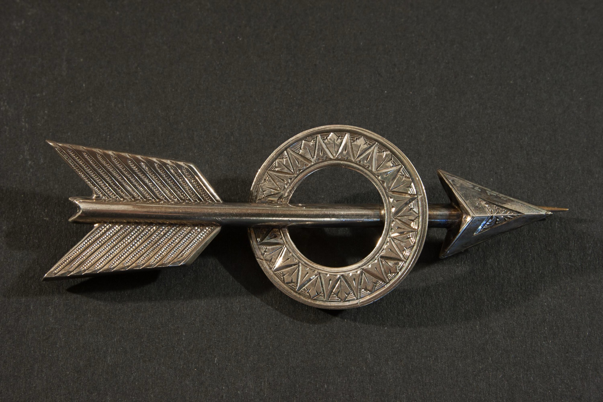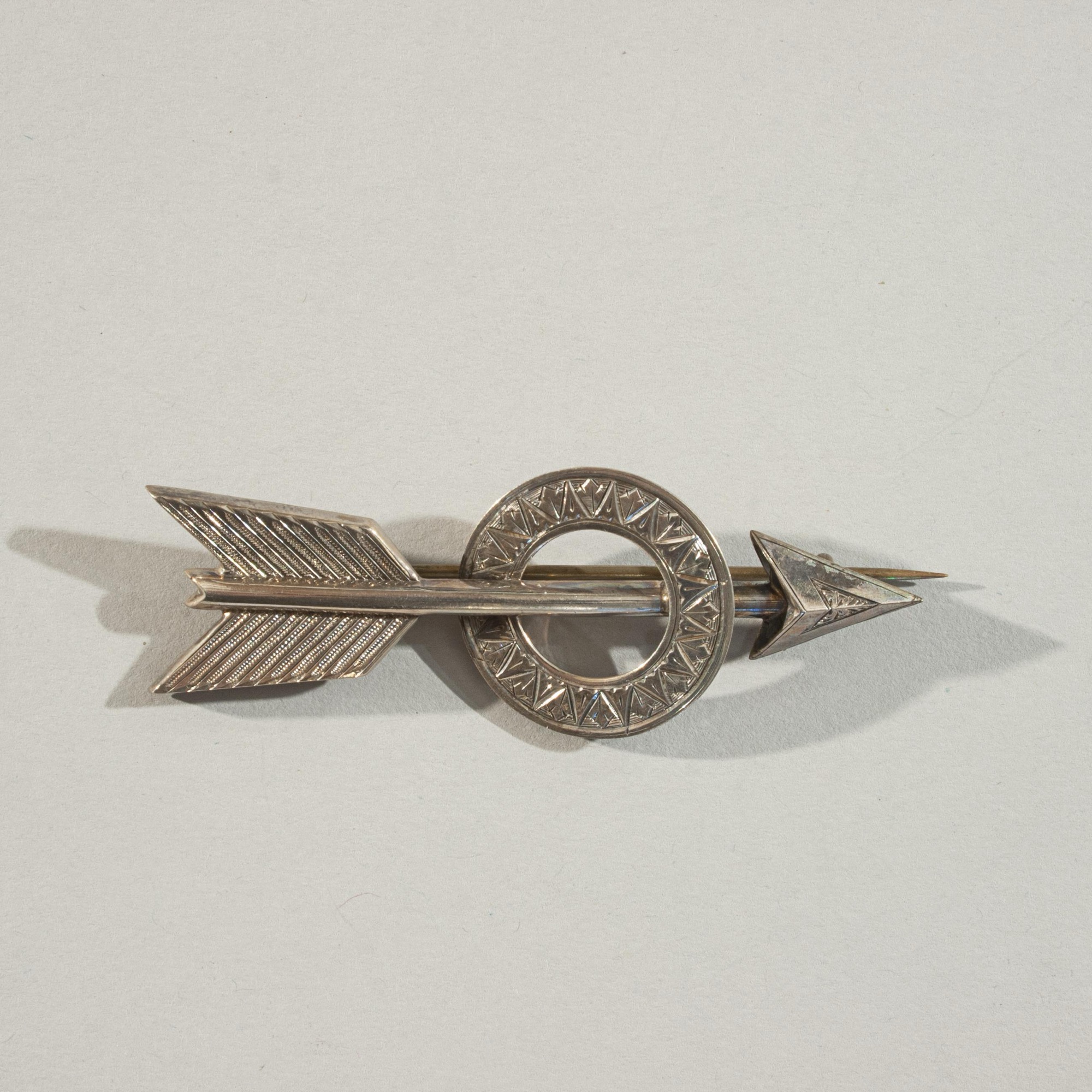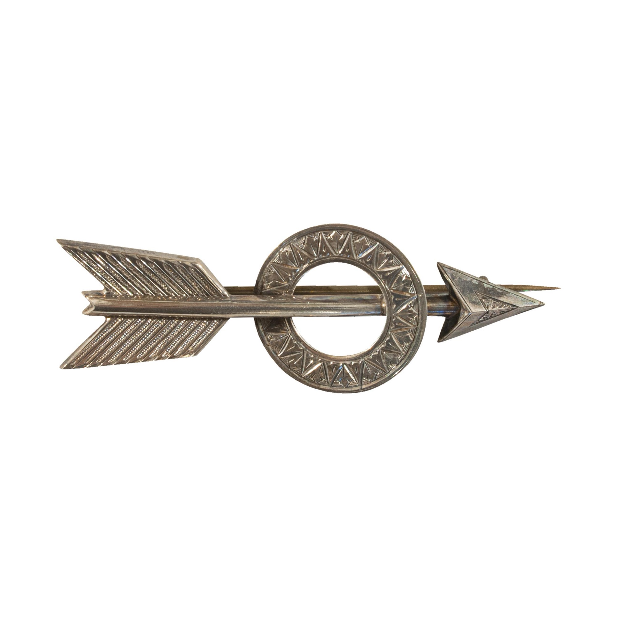 A vintage archery brooch depicting an arrow penetrating a circle. The circle band with embossed pattern, arrow tip with fine detailing as are the arrow flights. The Brooch, lapel pin with original pin clasp.