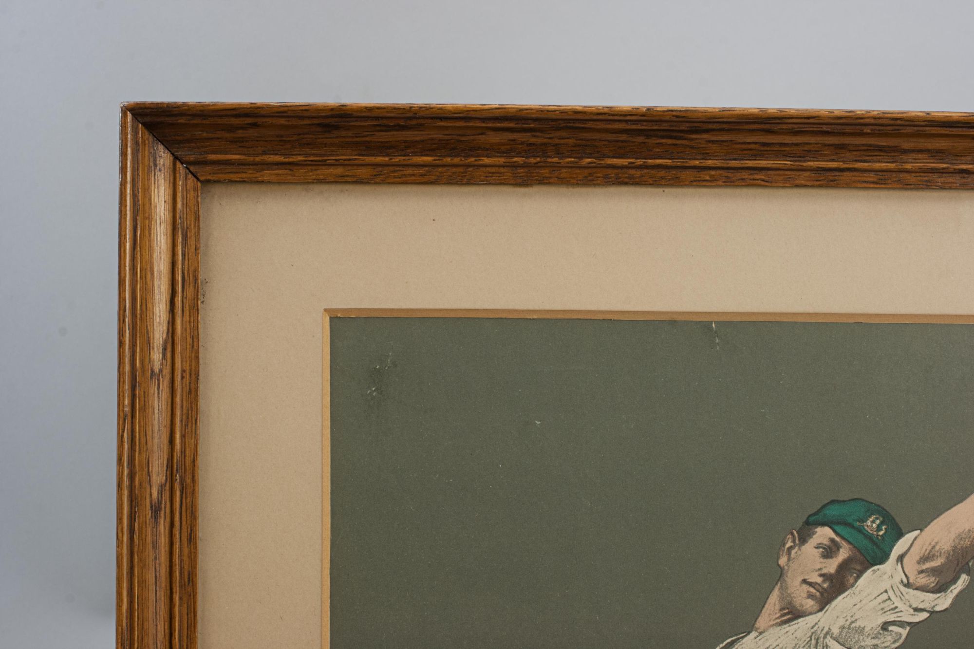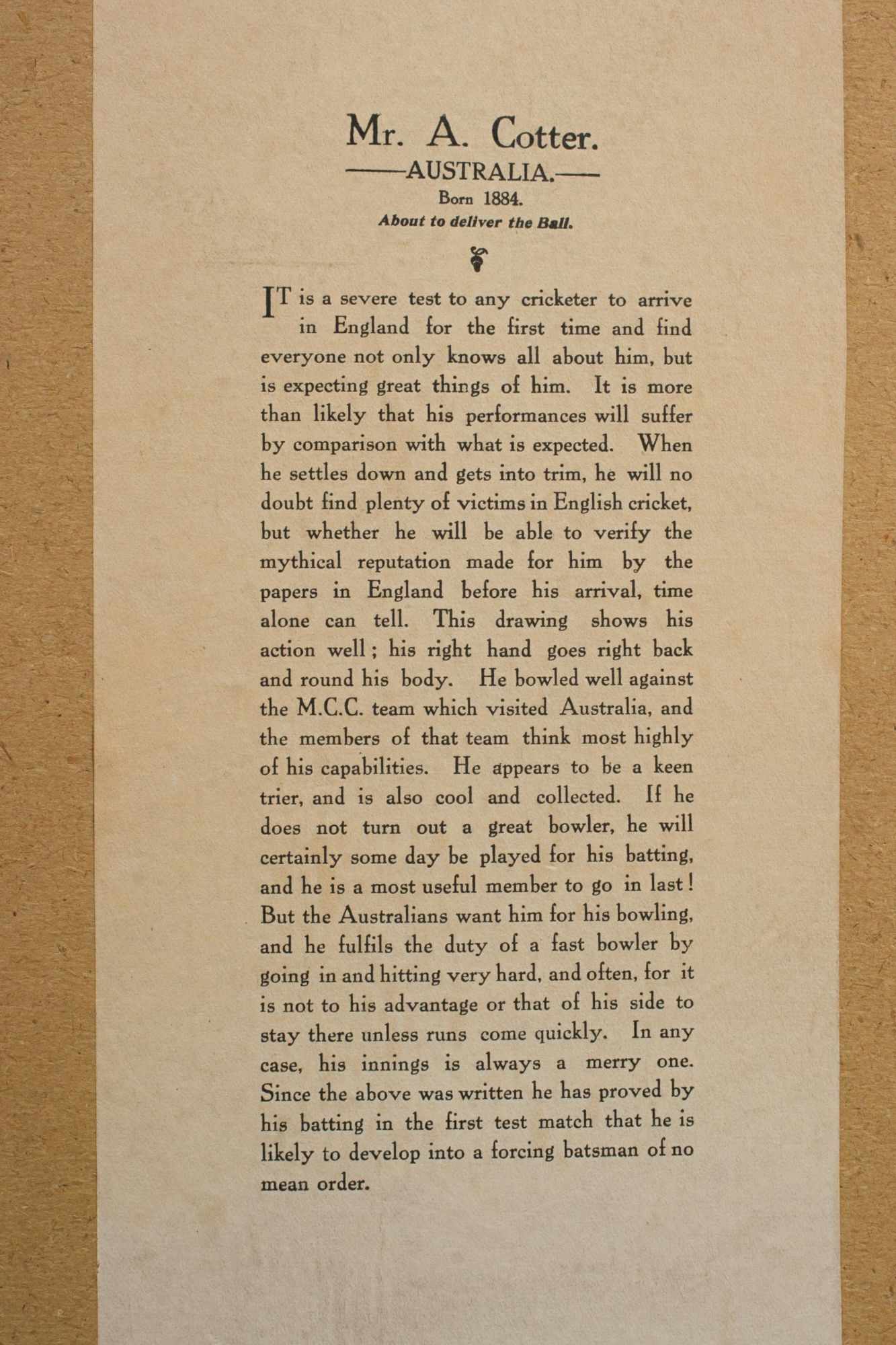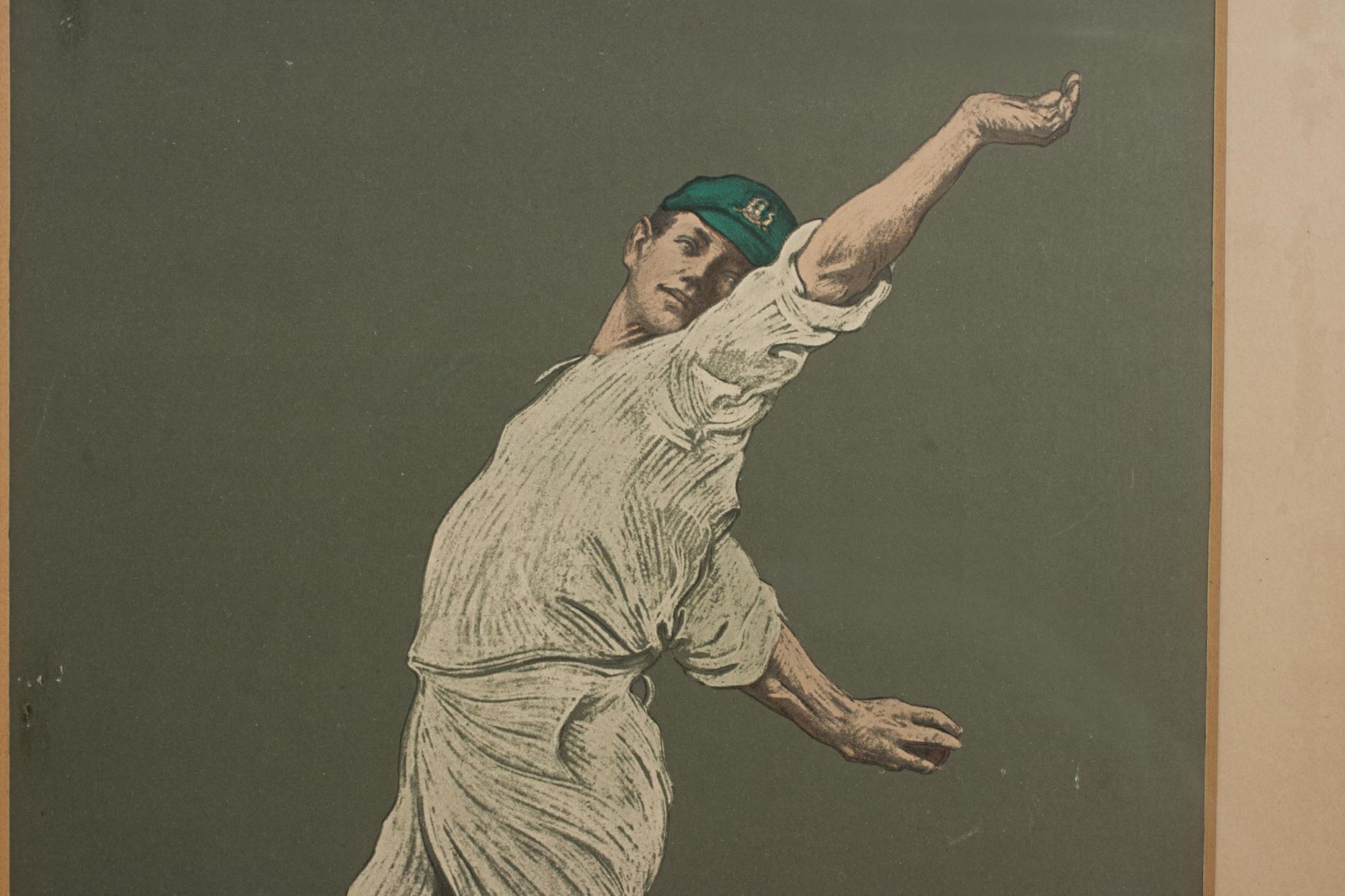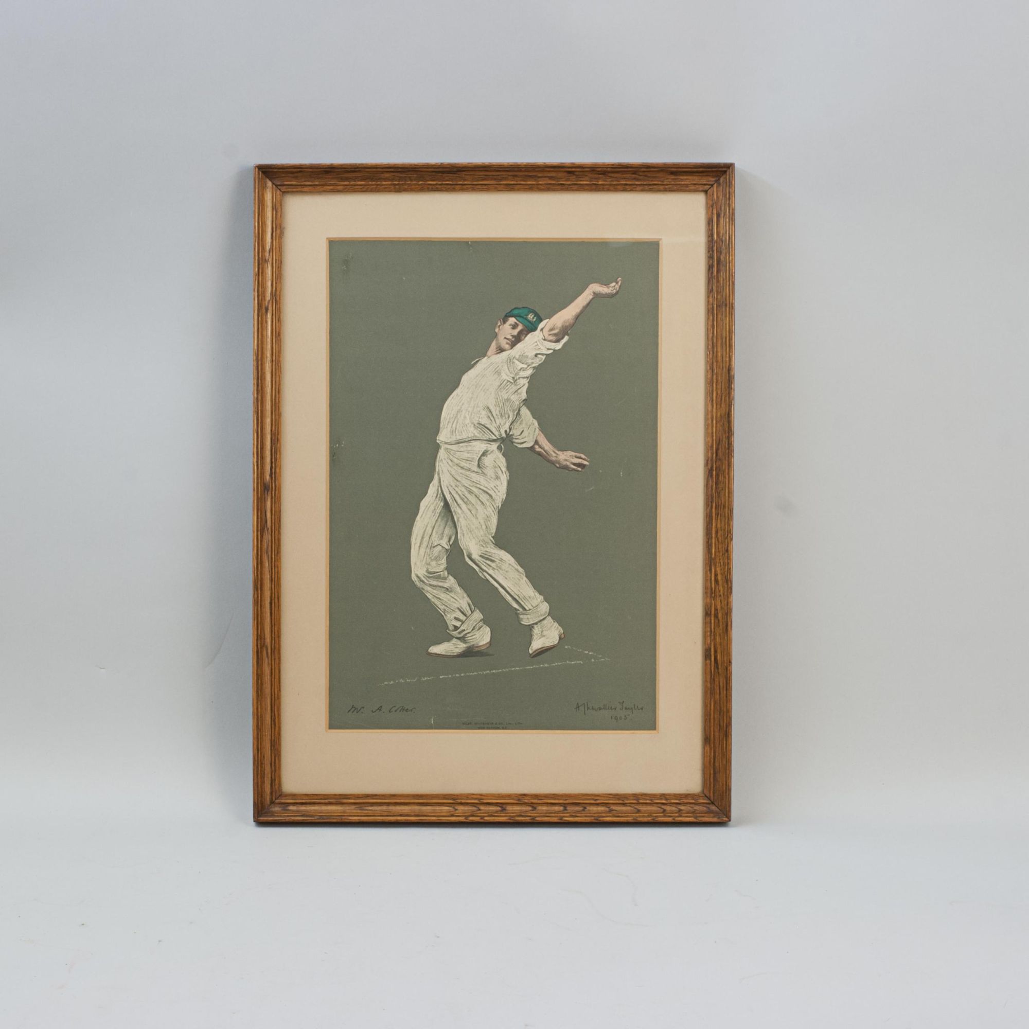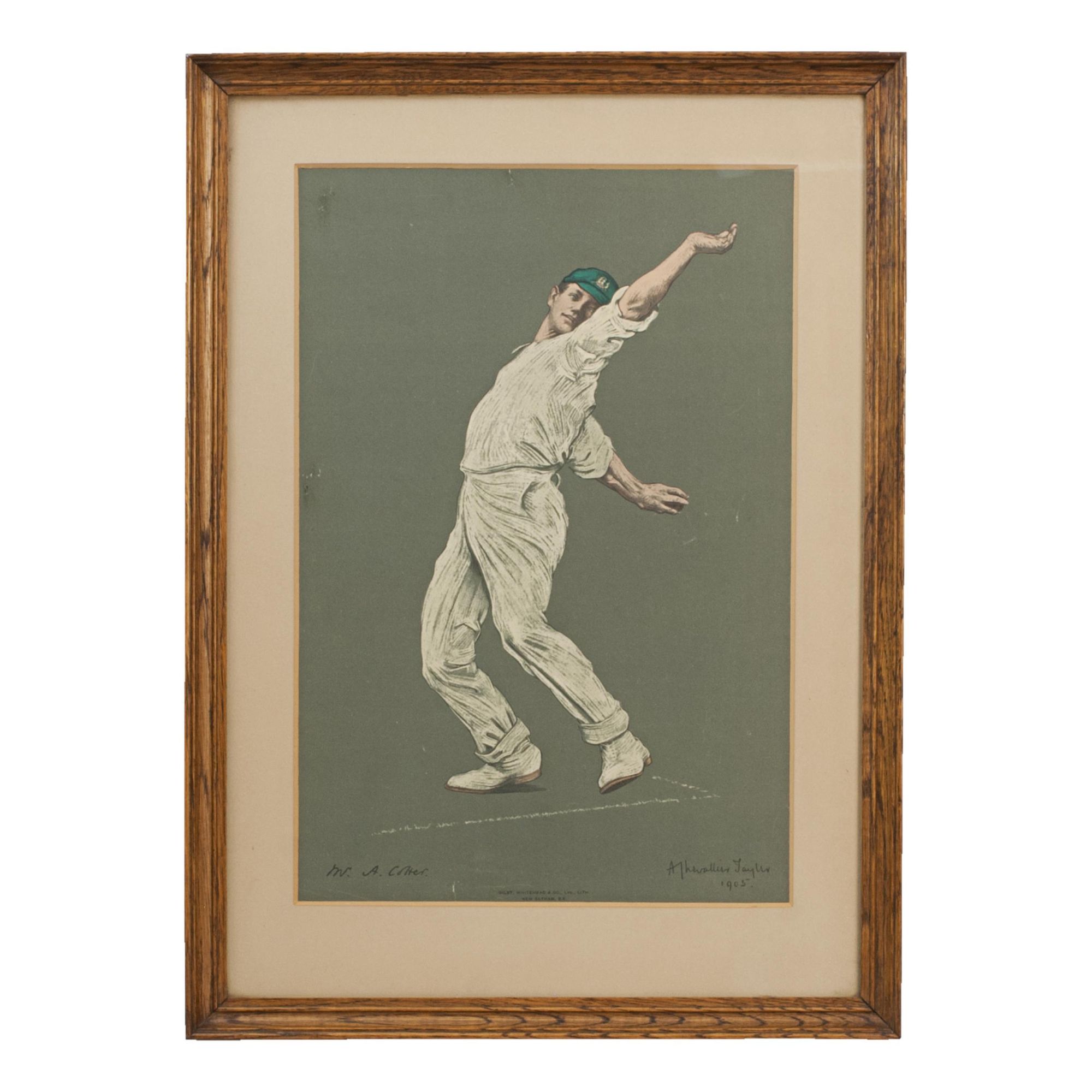 A wonderful coloured cricket lithograph after Albert Chevallier Tayler depicting Mr A. Cotter. The Australian cricketer is shown just about to deliver the ball. The print is presented in a period oak frame with glass. To the reverse is the original descriptive text:- Mr. A. Cotter. AUSTRALIA. Born 1884. About to deliver the Ball. It is a severe test to any cricketer to arrive in England for the first time and find everyone not only knows all about him, but is expecting great things of him. It is more than likely that his performances will suffer by comparison with what is expected. When he settles down and gets into trim, he will no doubt find plenty of victims in English cricket, but whether he will be able to verify the mythical reputation made for him by the papers in England before his arrival, time alone can tell. This drawing shows his action well; his right hand goes right back and round his body. He bowled well against the M.C.C. team which visited Australia, and the members of that team think most highly of his capabilities. He appears to be a keen trier, and is also cool and collected. If he does not turn out a great bowler, he will certainly some day be played for his batting, and he is a most useful member to go in last! But the Australians want him for his bowling, and he fulfils the duty of a fast bowler by going in and hitting very hard, and often, for it is not to his advantage or that of his side to stay there unless runs come quickly. In any case, his innings is always a merry one. Since the above was written he has proved by his batting in the first test match that he is likely to develop into a forcing batsman of no mean order.