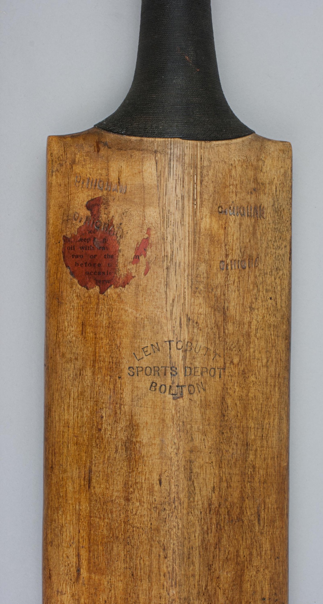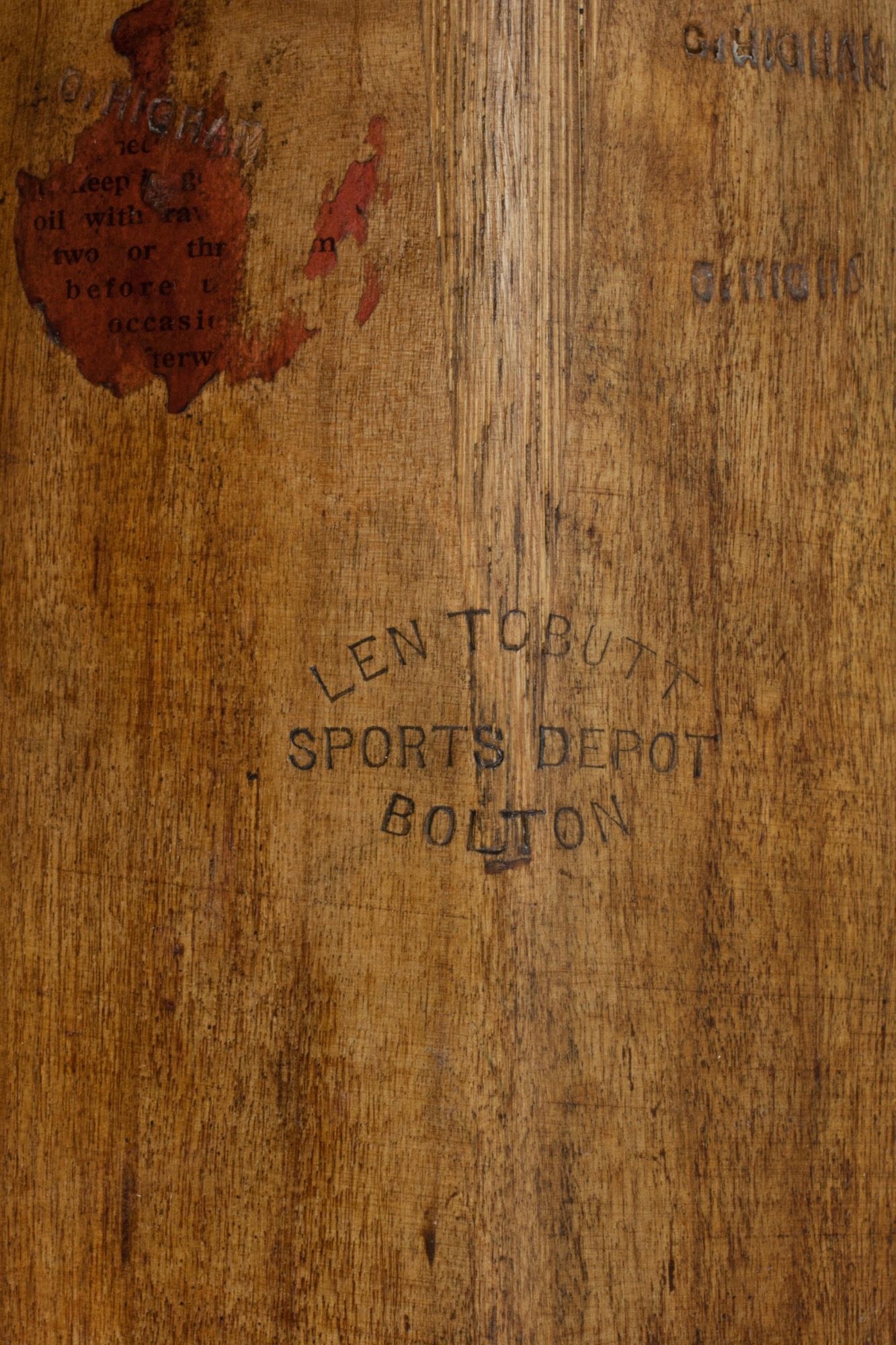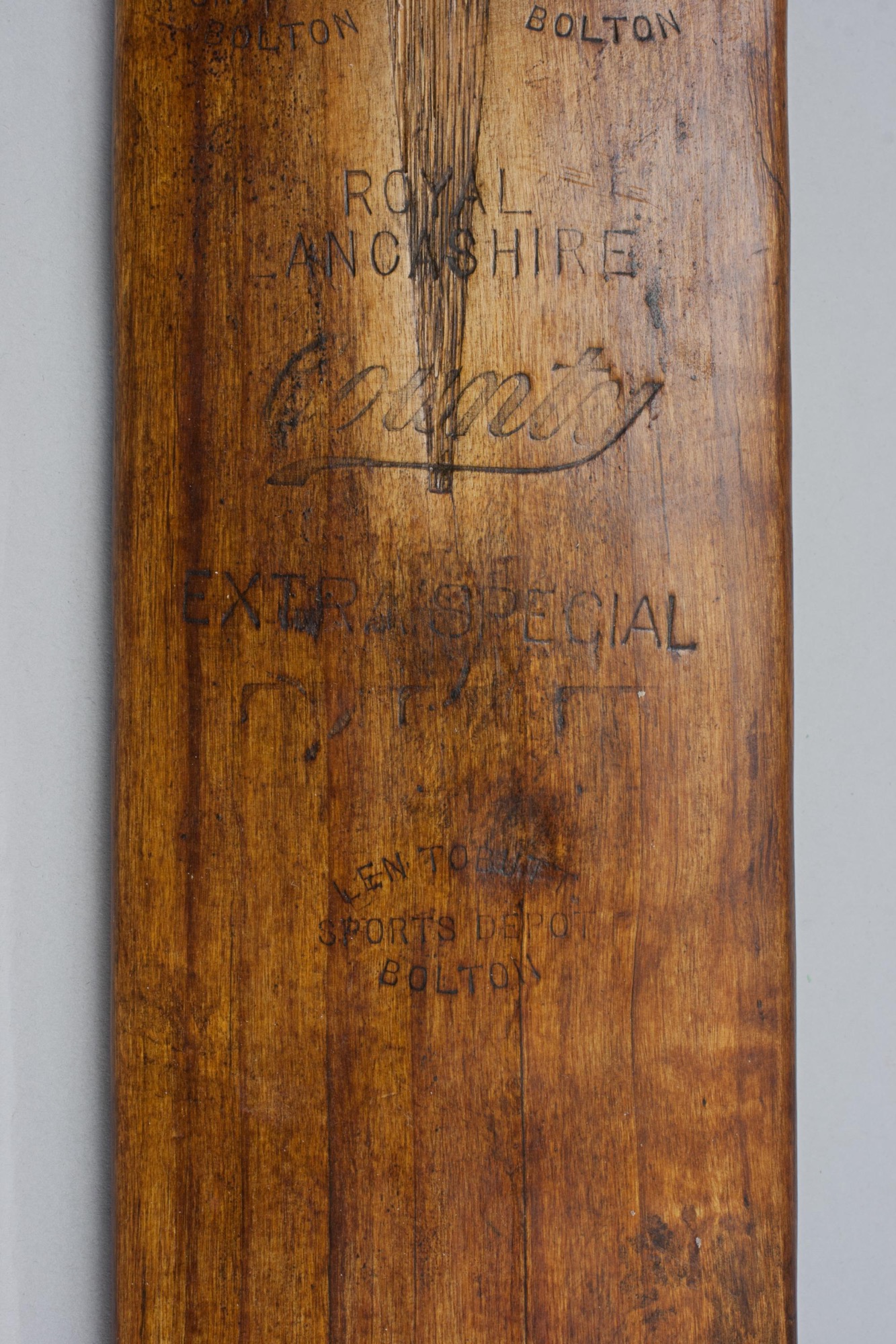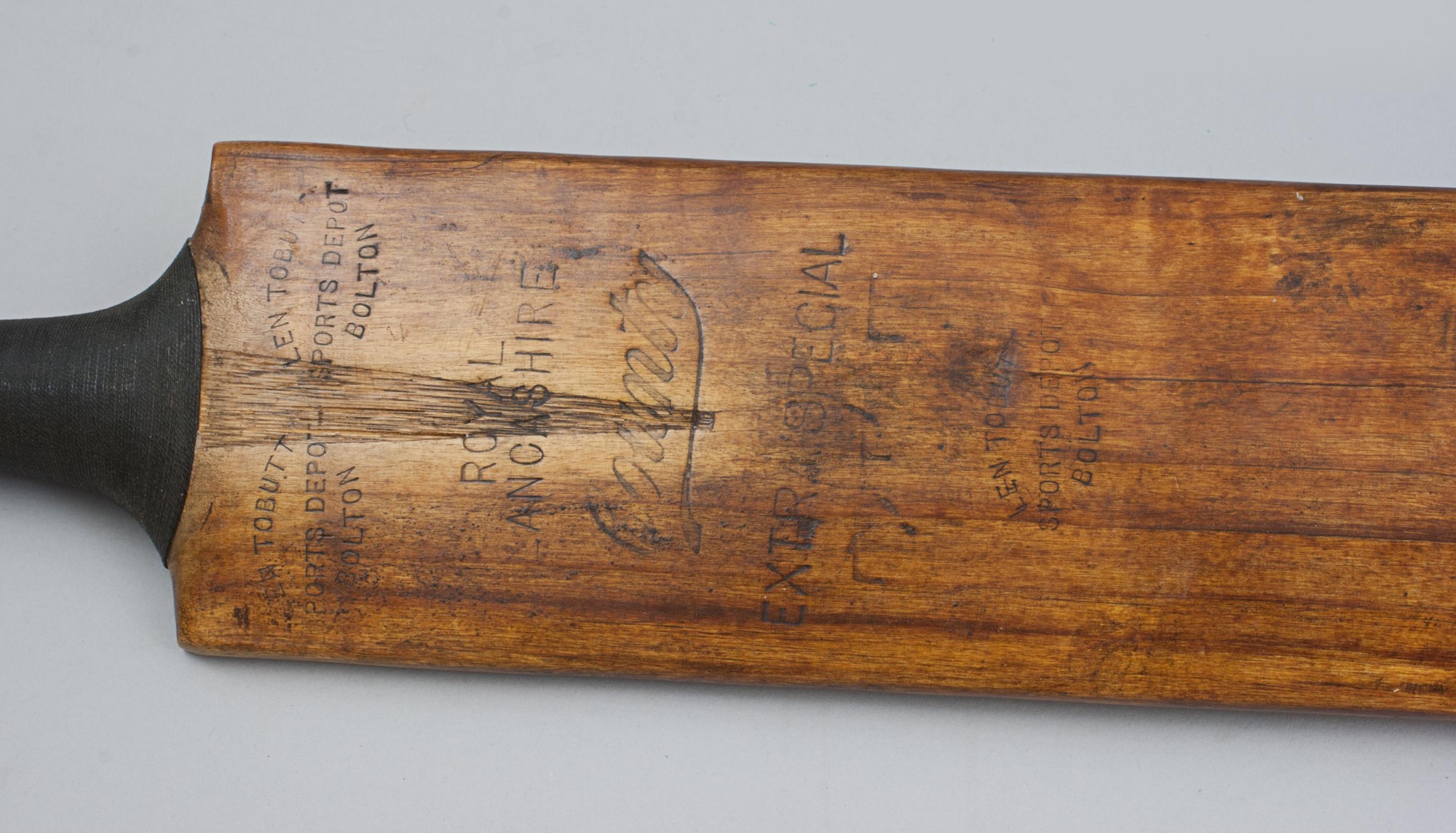 A good willow cricket bat stamped on the face 'Royal Lancashire County, Extra Special', with 'Len Tobutt, Sports Depot, Bolton' on the two shoulders of the bat and one on the center of the blade. The bat with a strung handle. Len Tobutt was a professional cricketer from Middlesex. A good decorative piece with nice patina.