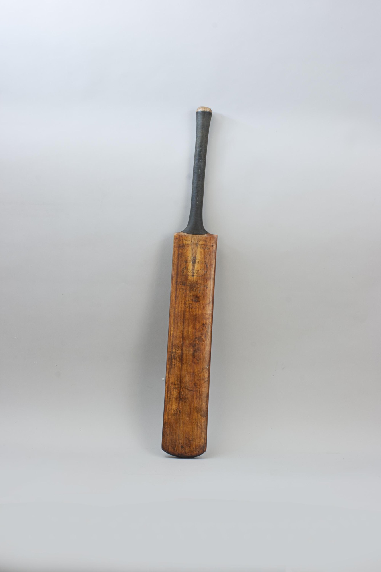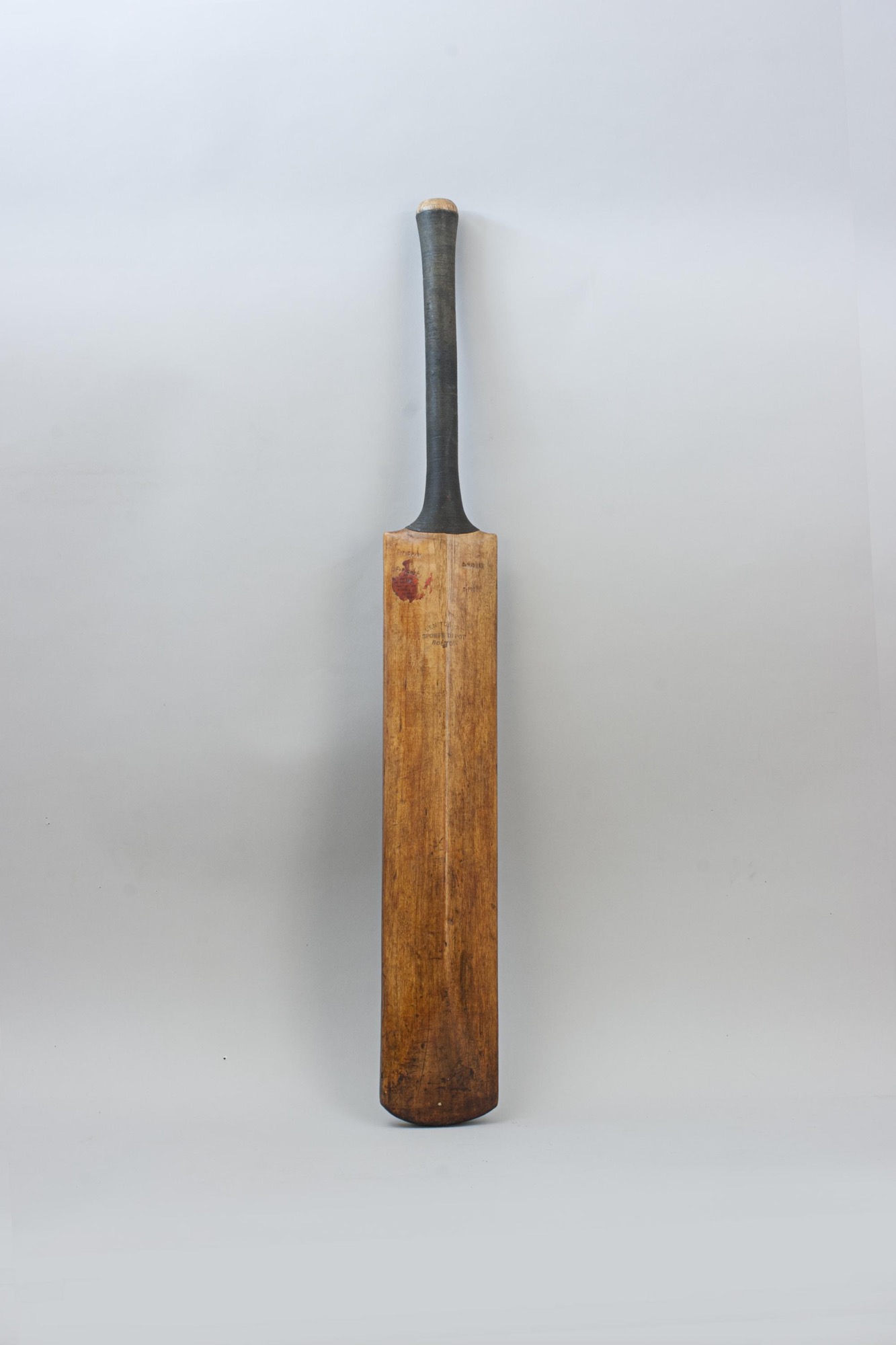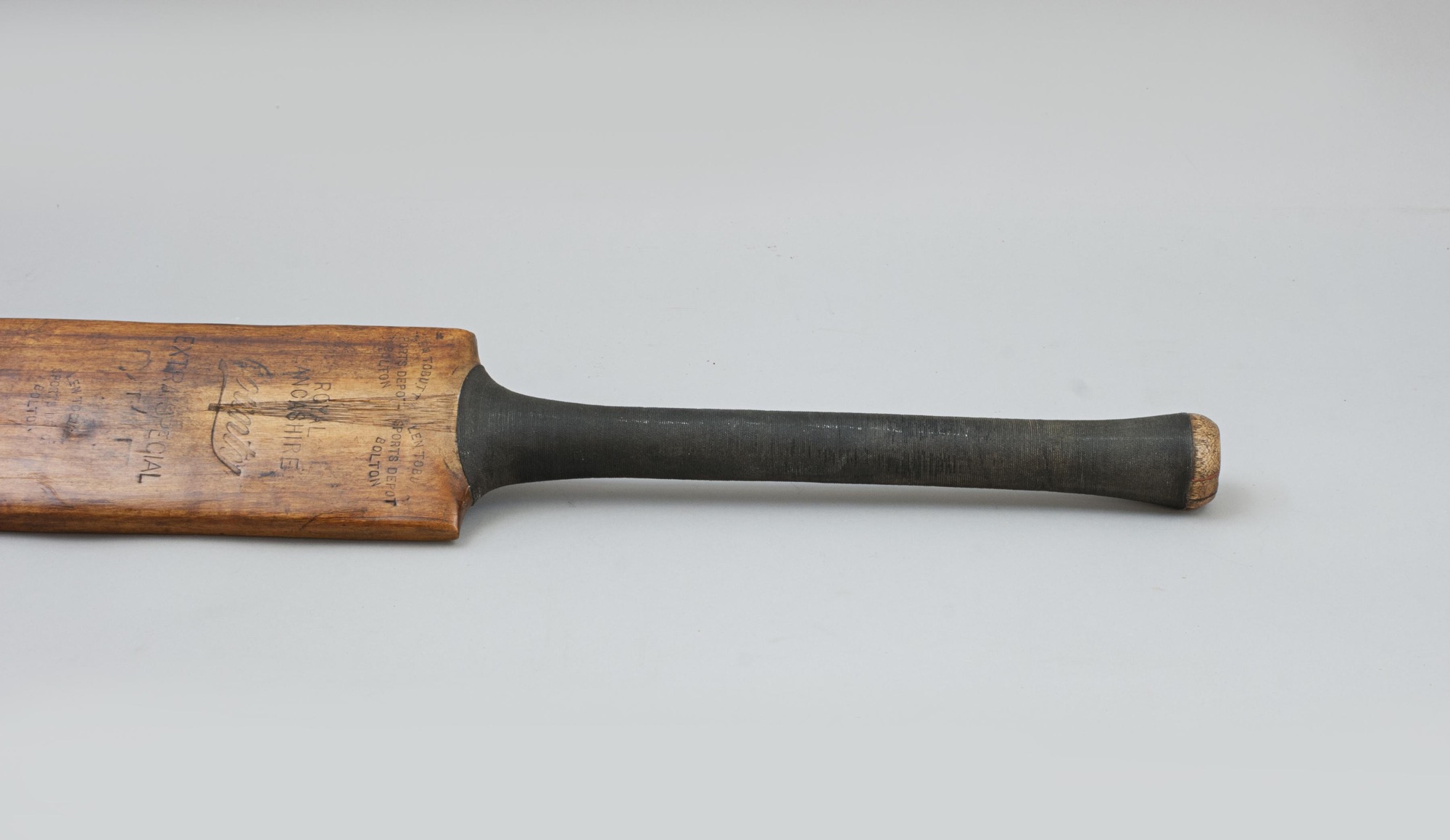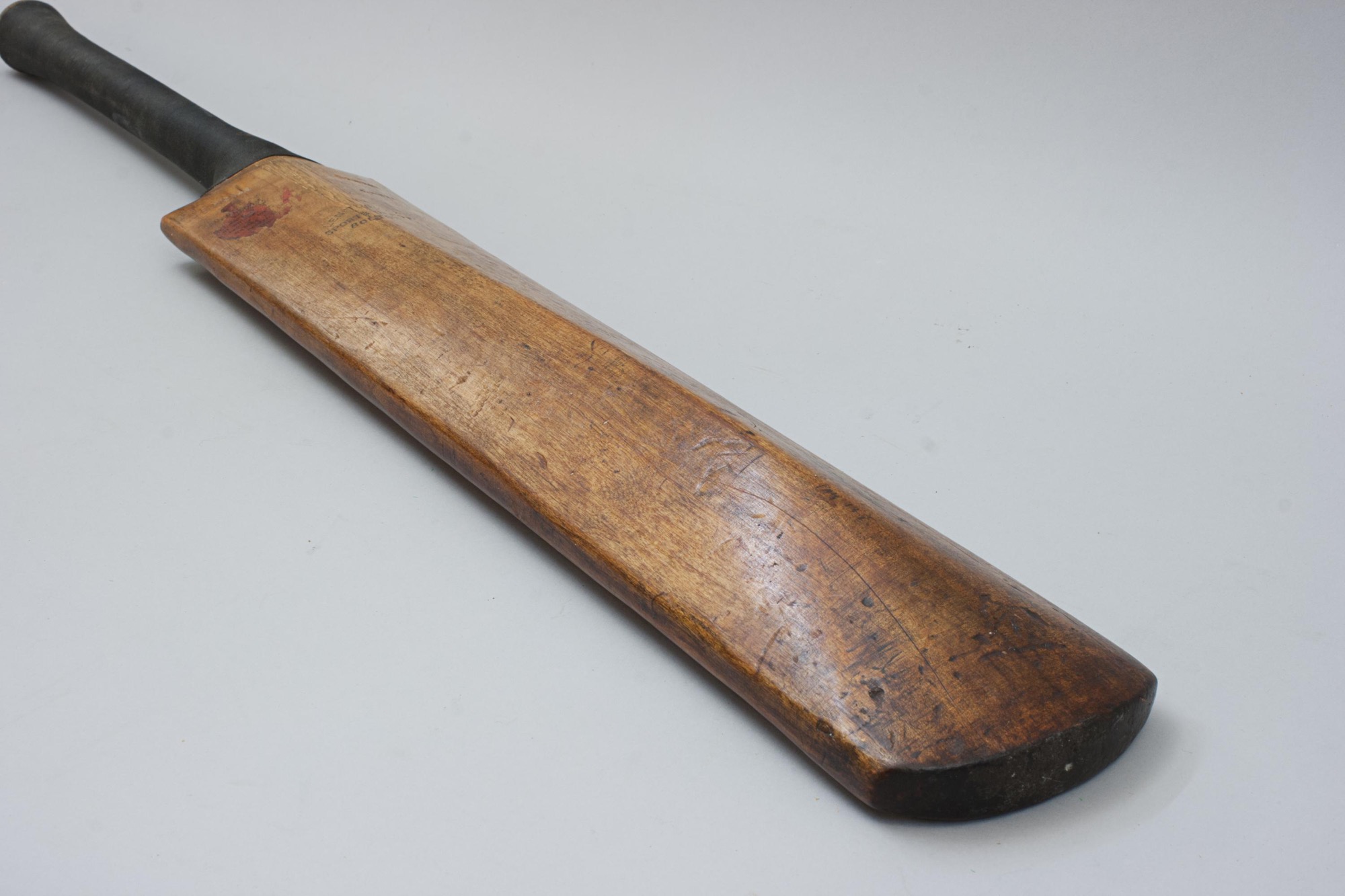 A good willow cricket bat stamped on the face 'Royal Lancashire County, Extra Special', with 'Len Tobutt, Sports Depot, Bolton' on the two shoulders of the bat and one on the center of the blade. The bat with a strung handle. Len Tobutt was a professional cricketer from Middlesex. A good decorative piece with nice patina.