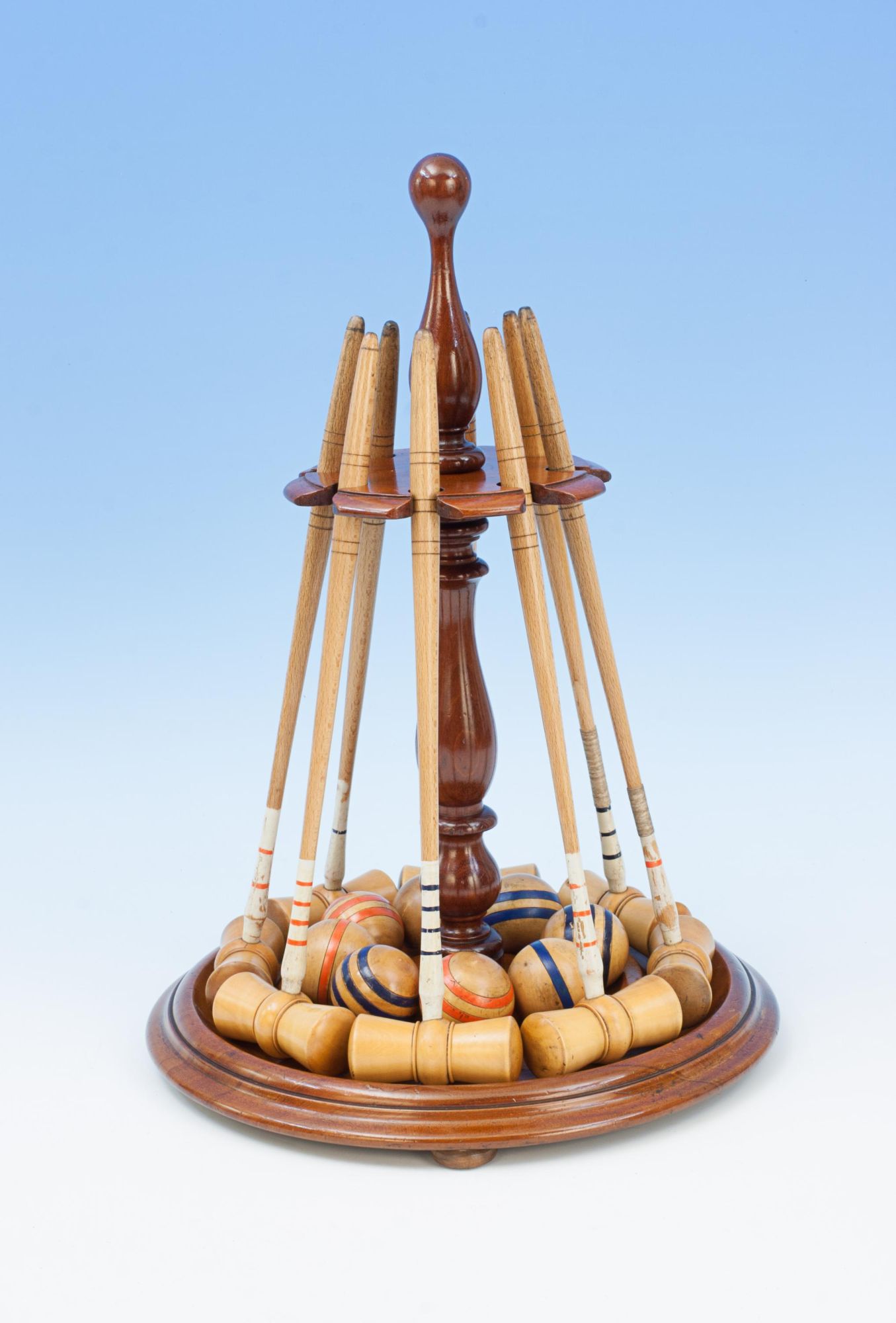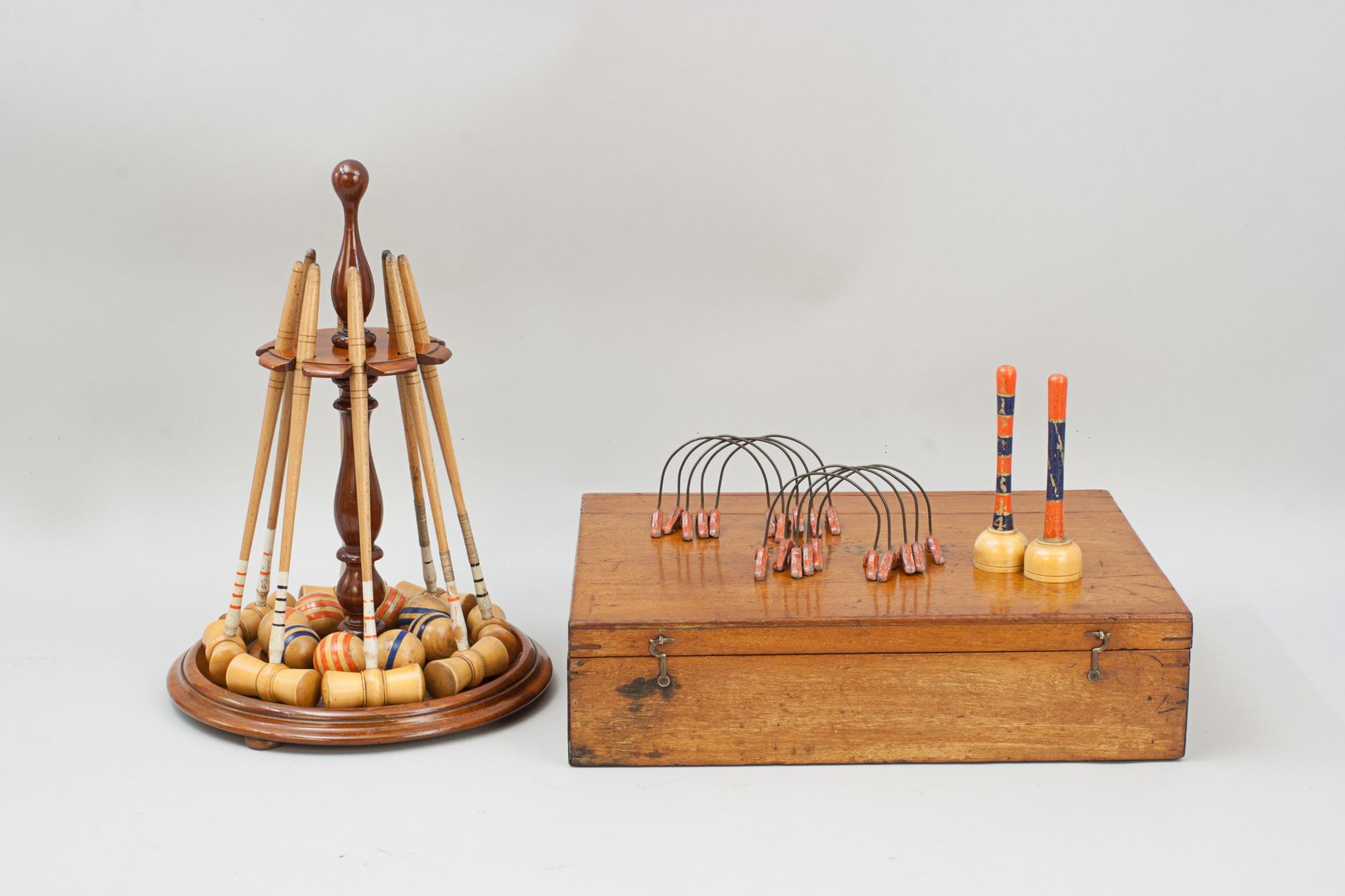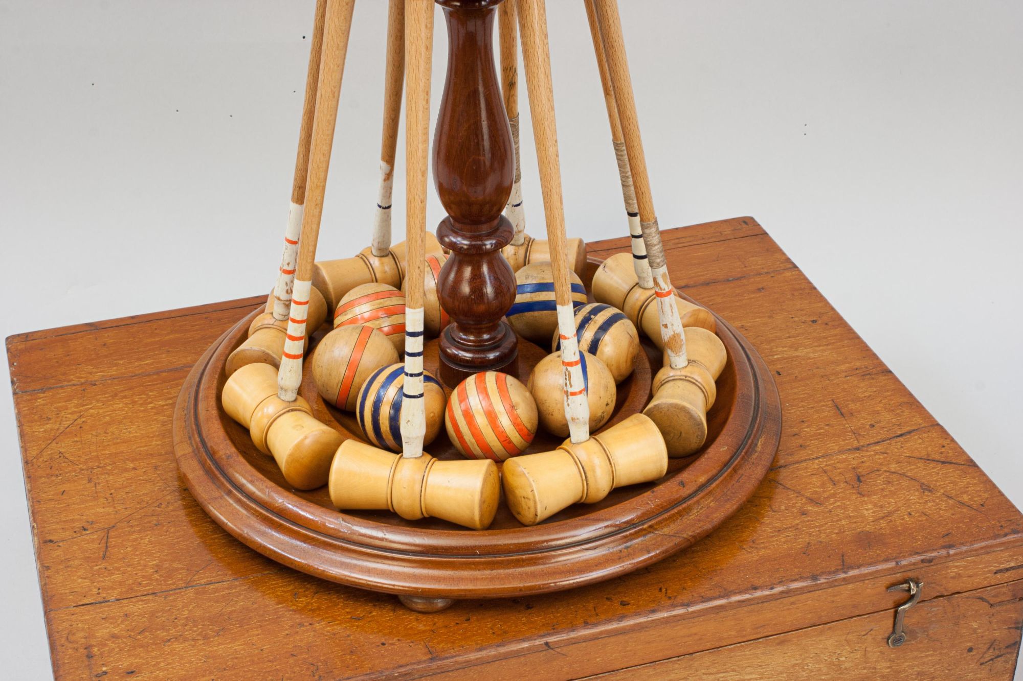 An original parlour game of miniature croquet displayed on its original mahogany stand and complete with its original storage box. The set contains 8 boxwood mallets, each having a coloured band of red 1,2,3 & 4 and the same in blue, 8 balls with the same colour banding and two posts with corresponding coloured bands and 10 hoops with lead weighted feet. To complete the set there are all the fittings for a table to attach a cloth band to stop the balls from rolling off the table. The stand will unscrew and everything can be stored in the box, lid painted with the word 'Croquet', inside the lid written in pencil 'From Mr. Lekebusch, Xmas 1889'.