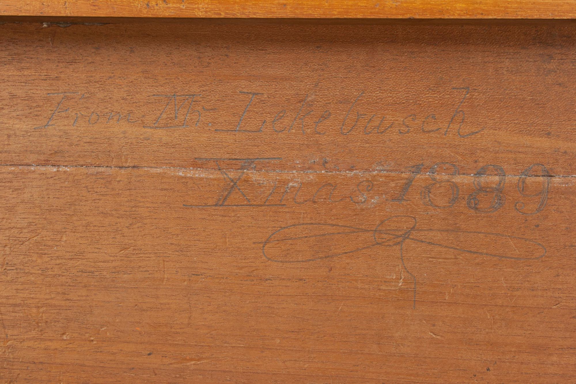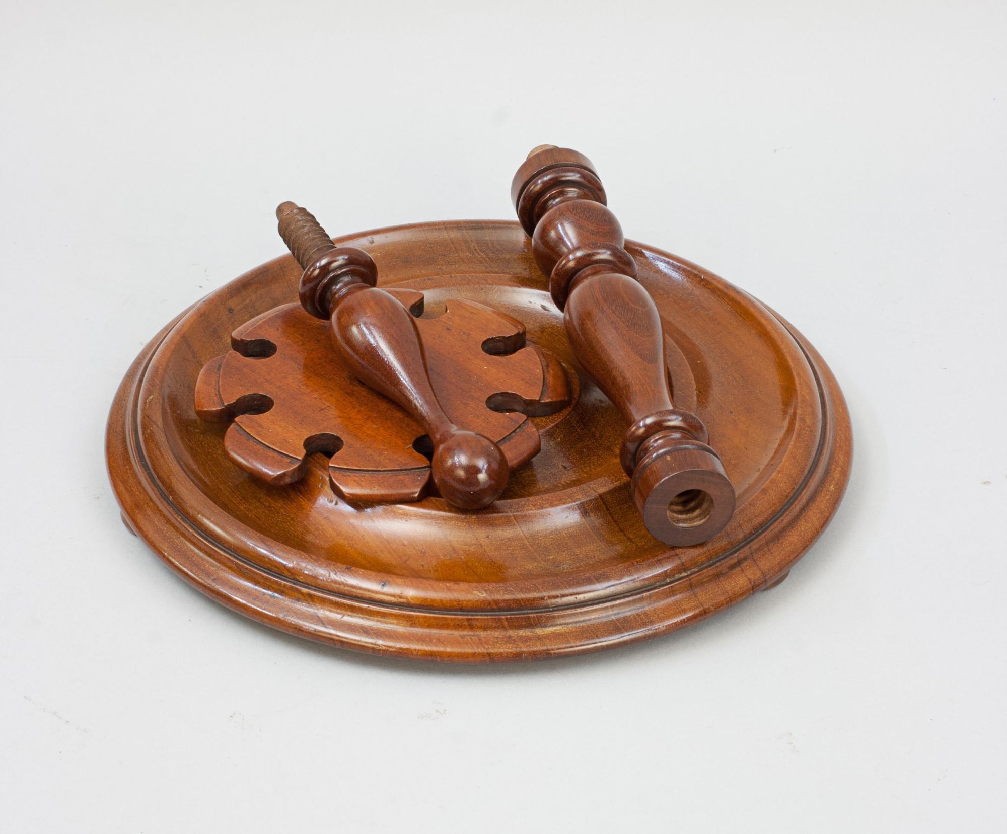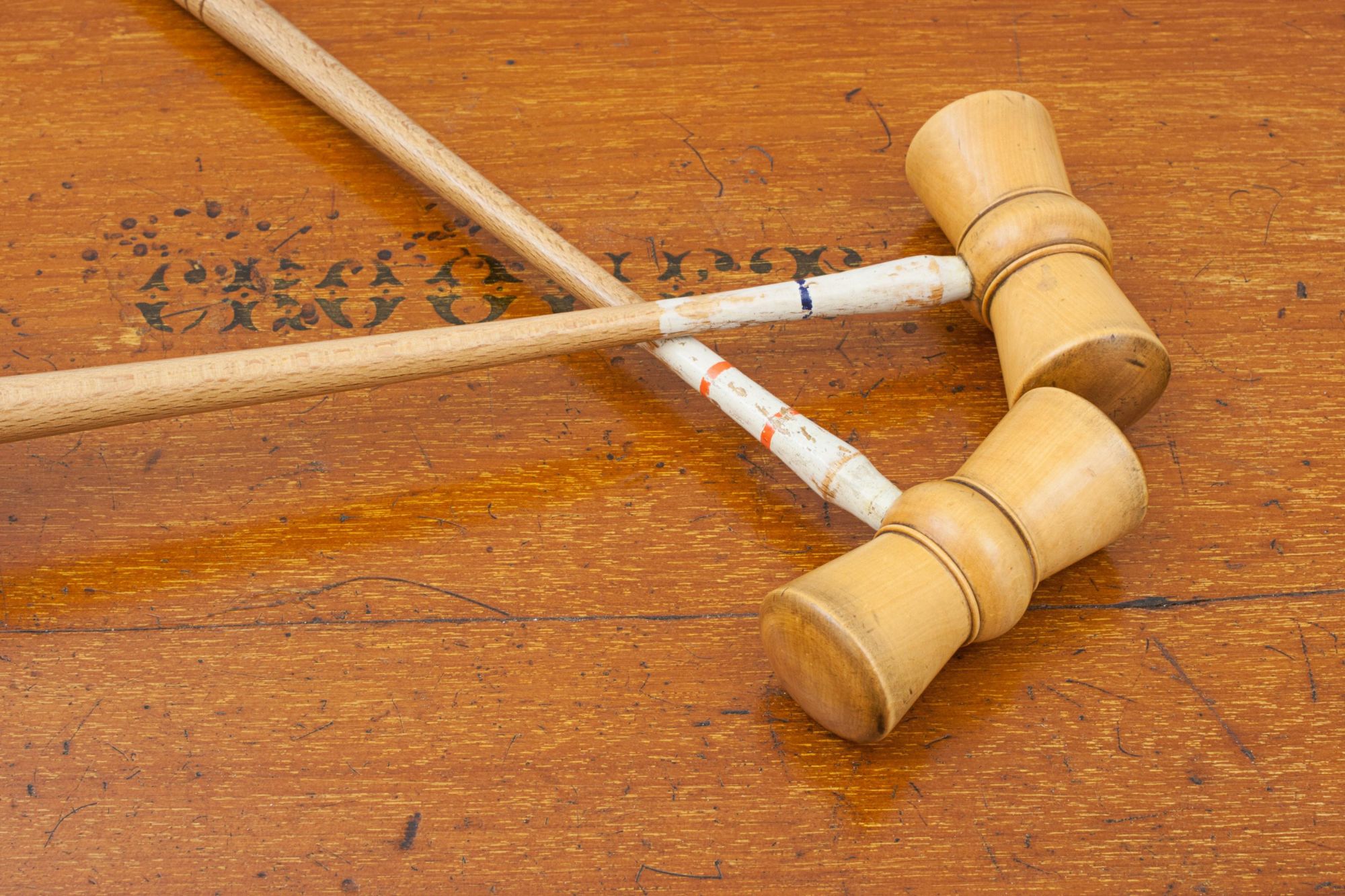 An original parlour game of miniature croquet displayed on its original mahogany stand and complete with its original storage box. The set contains 8 boxwood mallets, each having a coloured band of red 1,2,3 & 4 and the same in blue, 8 balls with the same colour banding and two posts with corresponding coloured bands and 10 hoops with lead weighted feet. To complete the set there are all the fittings for a table to attach a cloth band to stop the balls from rolling off the table. The stand will unscrew and everything can be stored in the box, lid painted with the word 'Croquet', inside the lid written in pencil 'From Mr. Lekebusch, Xmas 1889'.