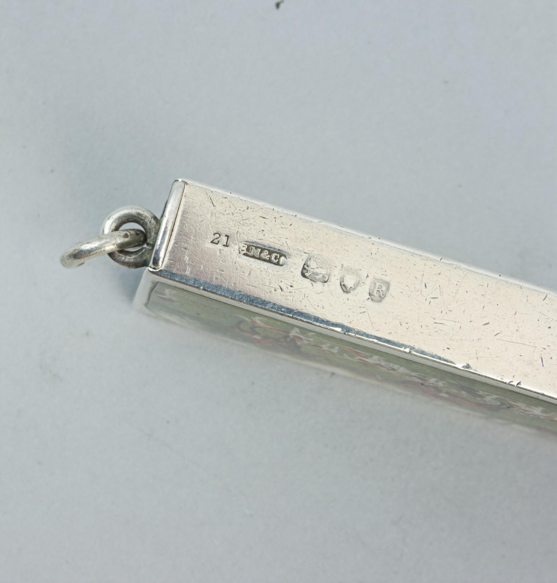 An exquisite antique silver enamelled fox hunting vesta case by the renowned maker Sampson Mordan, hallmarked London 1892 with the registered mark 'S. M. & Co.' (registered in 1890). This charming piece features a flip-top lid with chain ring and a serrated base designed for striking matches, combining practicality with refined Victorian craftsmanship. The front is beautifully decorated with an enamelled fox hunting scene, depicting three mounted huntsmen surrounded by the hounds, capturing the spirit of late 19th century fox hunting. The reverse is engraved with a lion and "Harold from Dora. May 4th 1894".