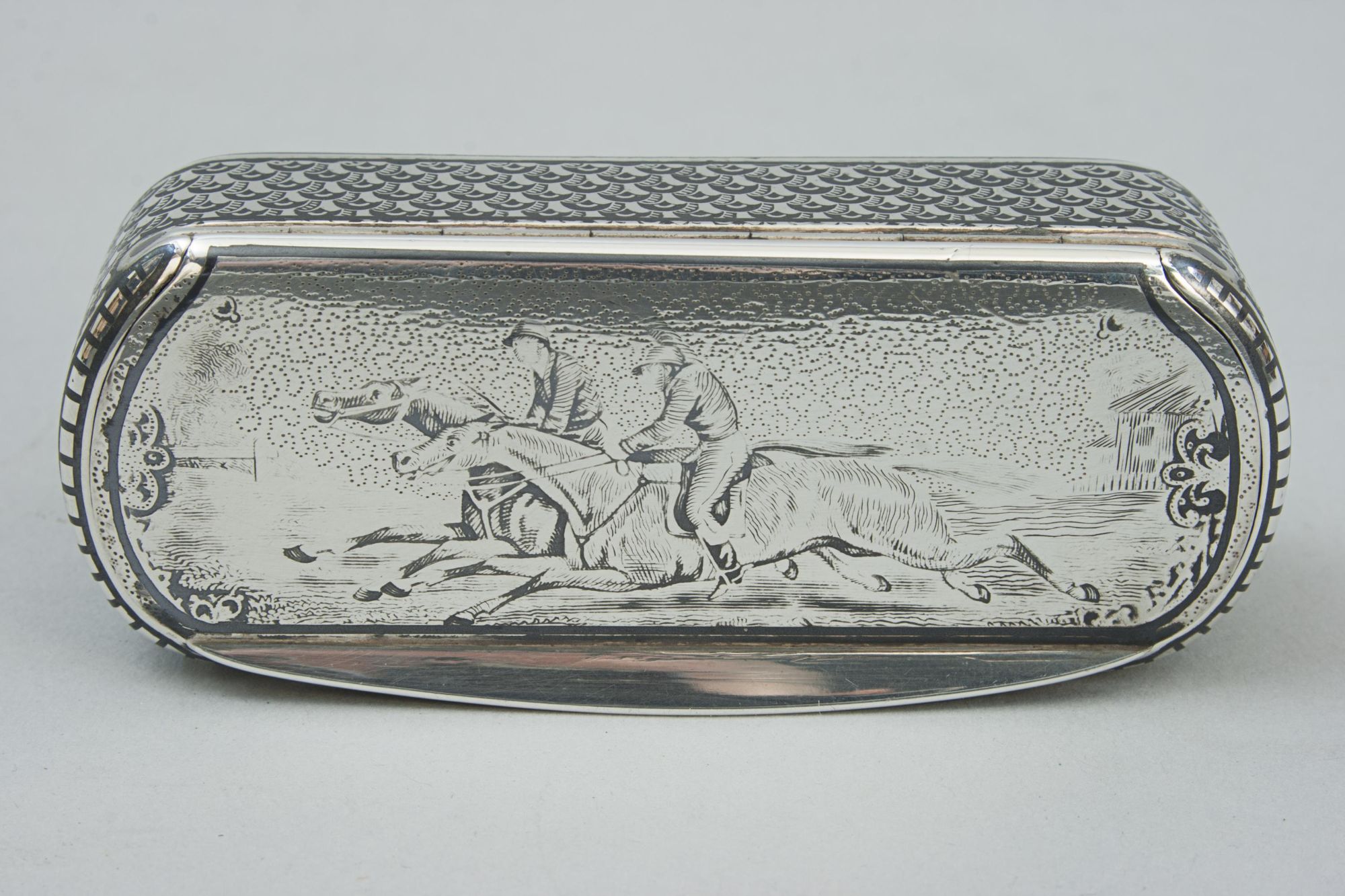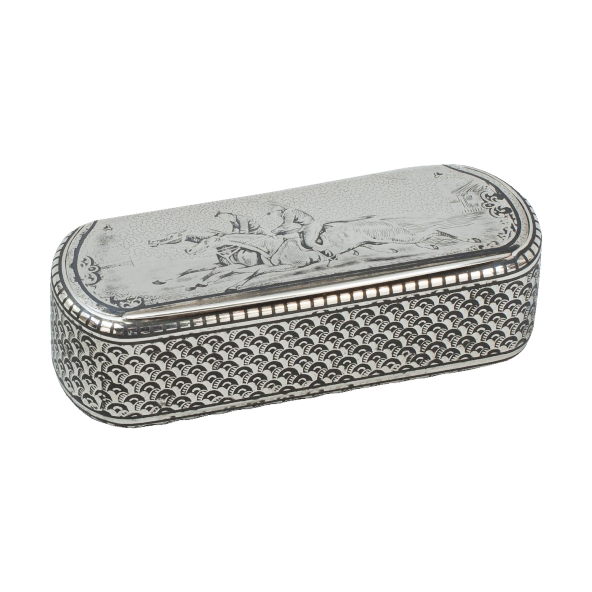 A rare and collectible item, this snuffbox combines artistic niello craftsmanship and sporting-themed decoration, making it a superb addition to a collection of antique silver or horseracing memorabilia.