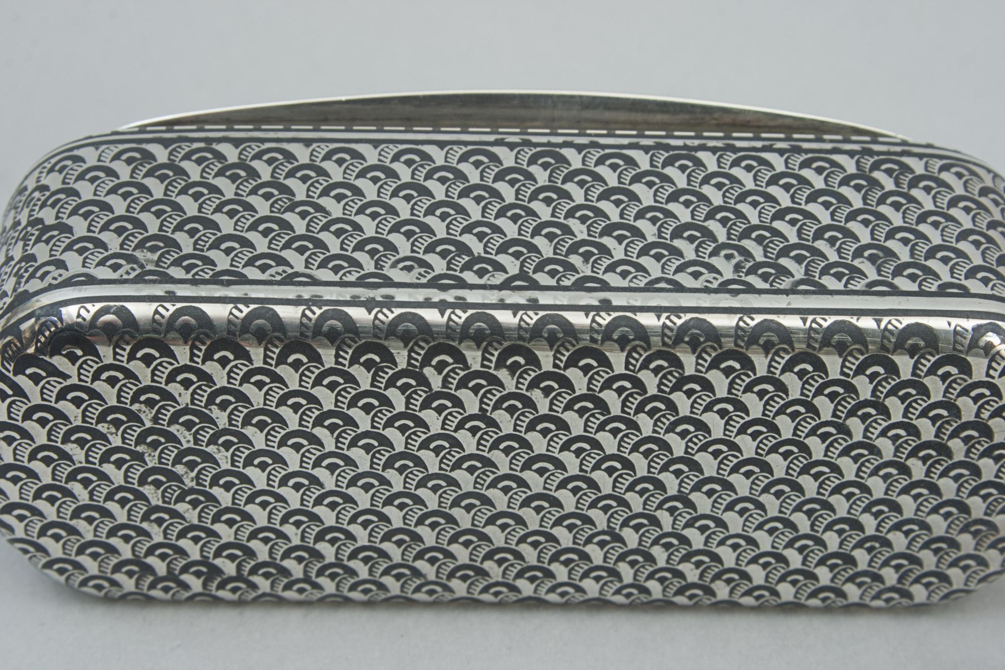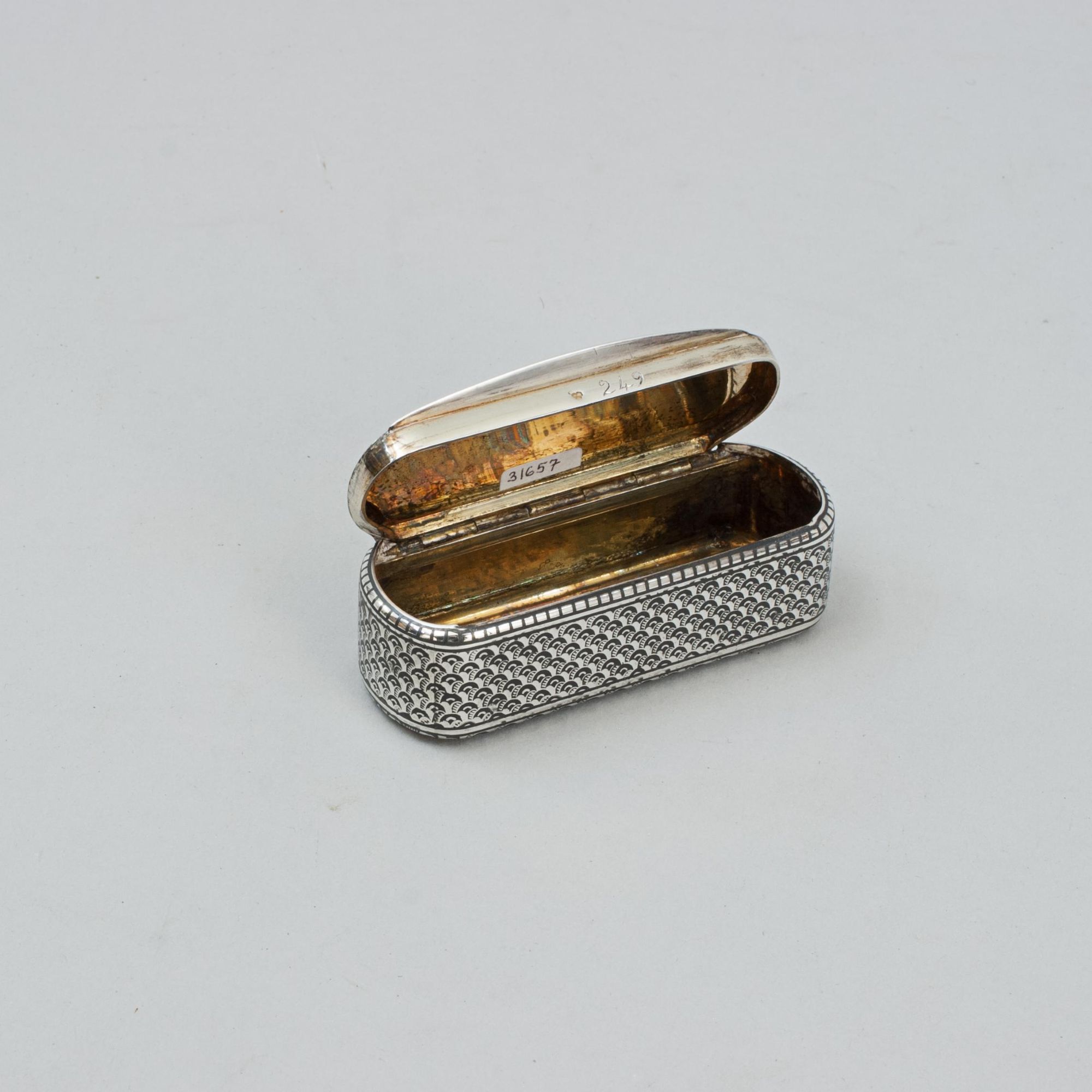 The snuffbox is crafted from Swedish silver and is adorned with niello inlay, a traditional decorative technique where a black metallic alloy (typically sulfur, silver, copper, and lead) is fused into engraved recesses. This creates a dramatic black-on-silver contrast. Niello work has a long history, popular across Renaissance Italy, Victorian England, and in Thai, Russian, and Swedish silverwork, and was frequently used for jewelry, liturgical items, and utilitarian objects.
