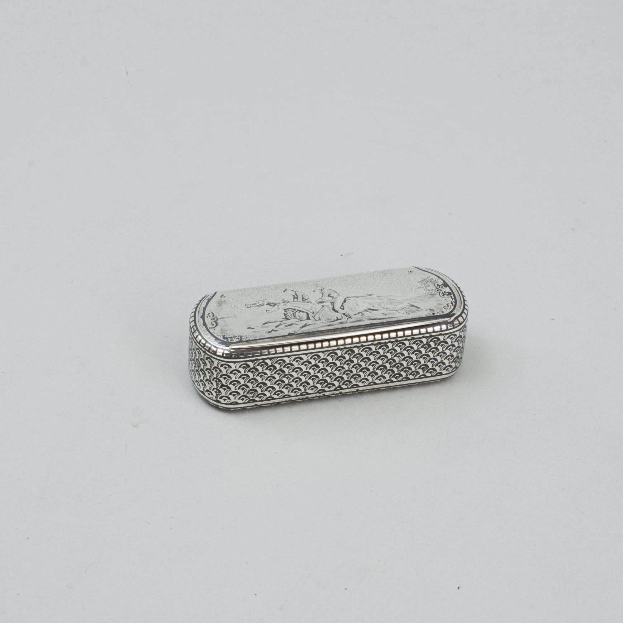 An exceptional example of Swedish silver niello work, this antique snuffbox features a striking horse racing (steeplechase) scene on its hinged cover, complete with two finely detailed jockeys in action. The rectangular form with rounded ends is beautifully executed, with side panels and the underside decorated in a subtle fish-scale pattern, highlighting the craftsmanship and decorative style of the period.