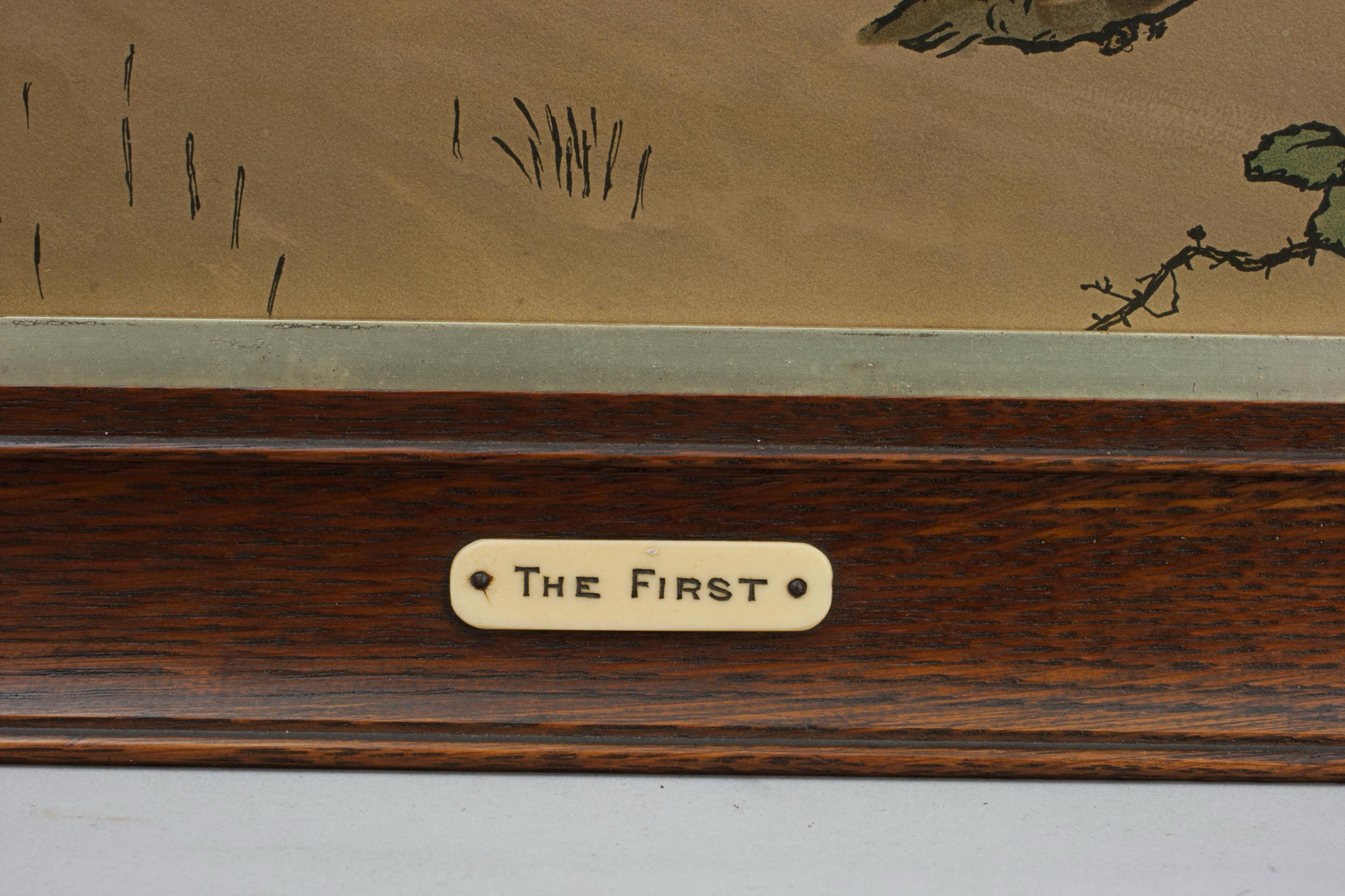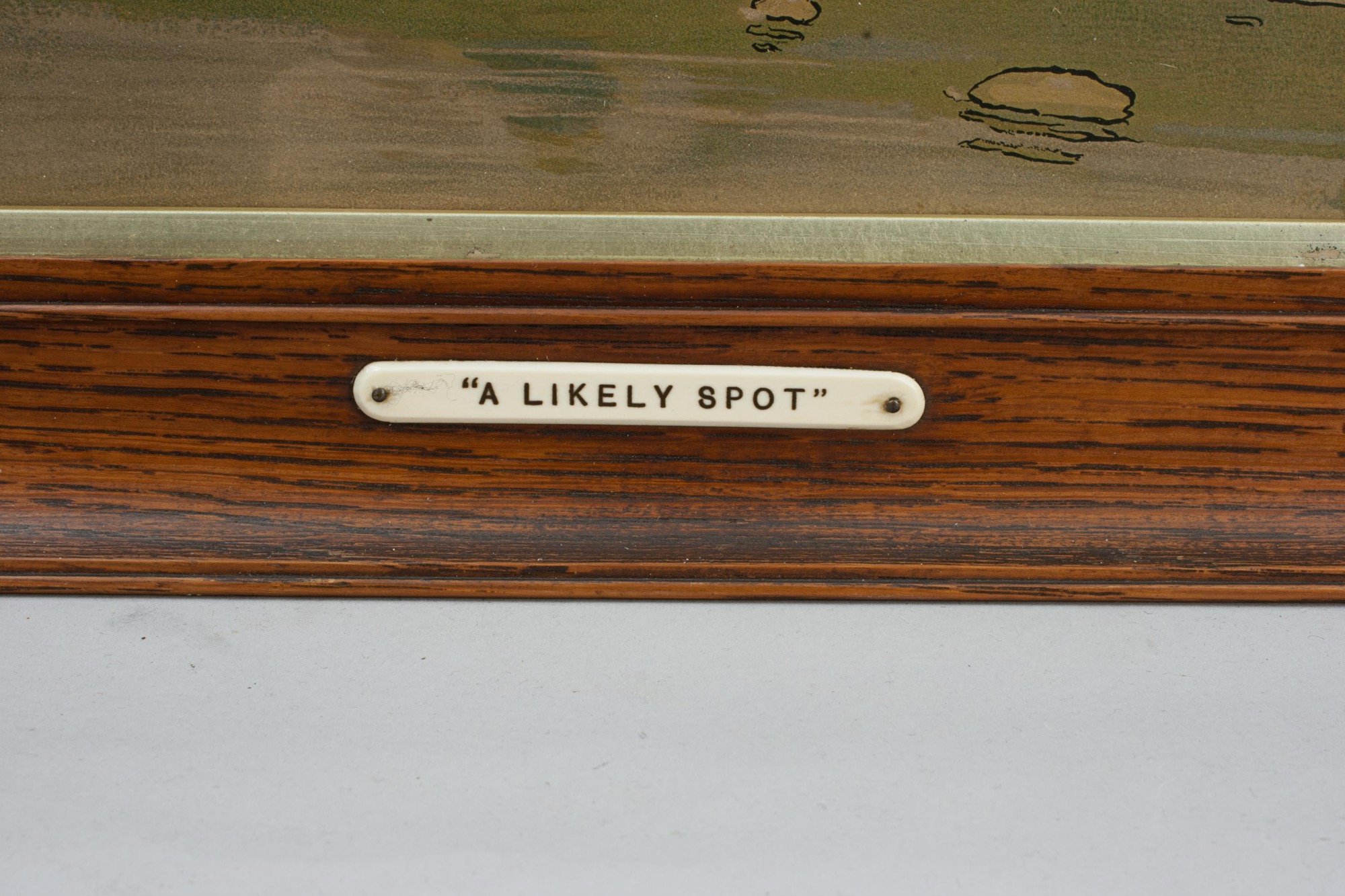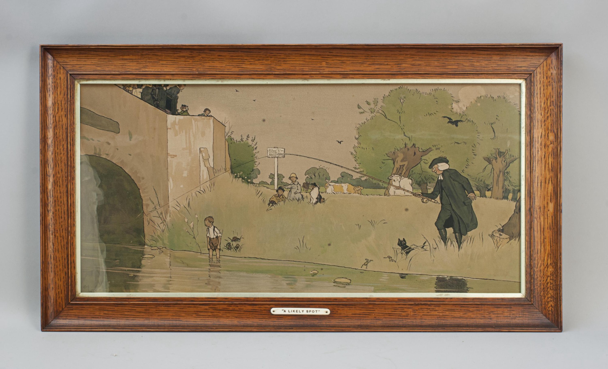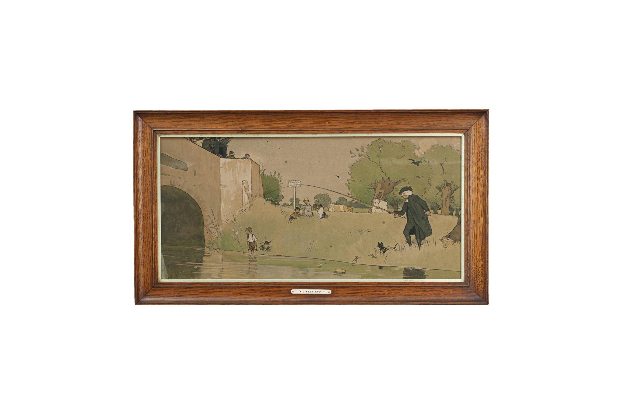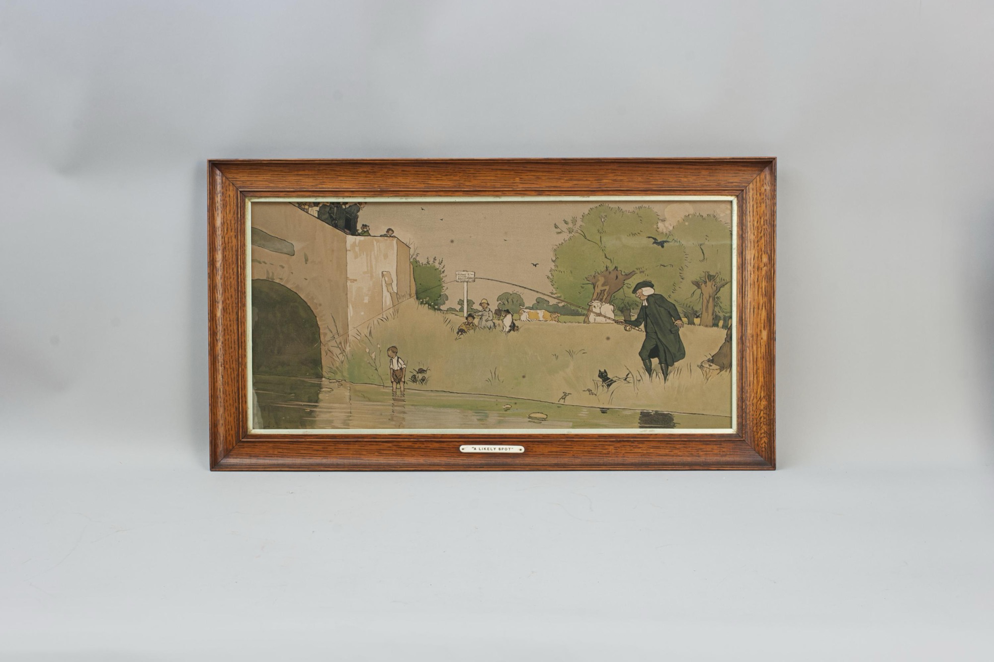 A wonderful original pair of shooting and fishing chromolithograph prints by Cecil Aldin, titled The First and A Likely Spot. Both works are presented in their original oak frames with gilt slips and applied titles.