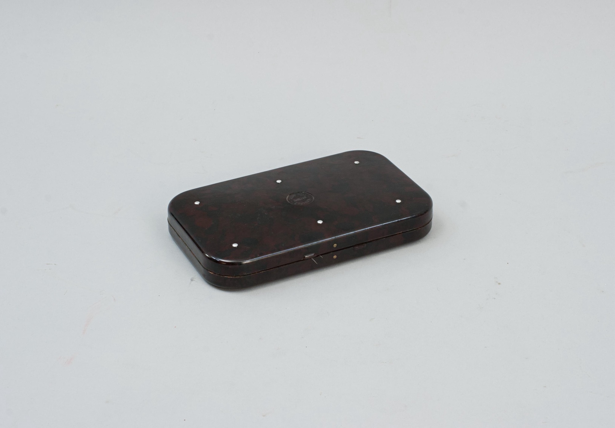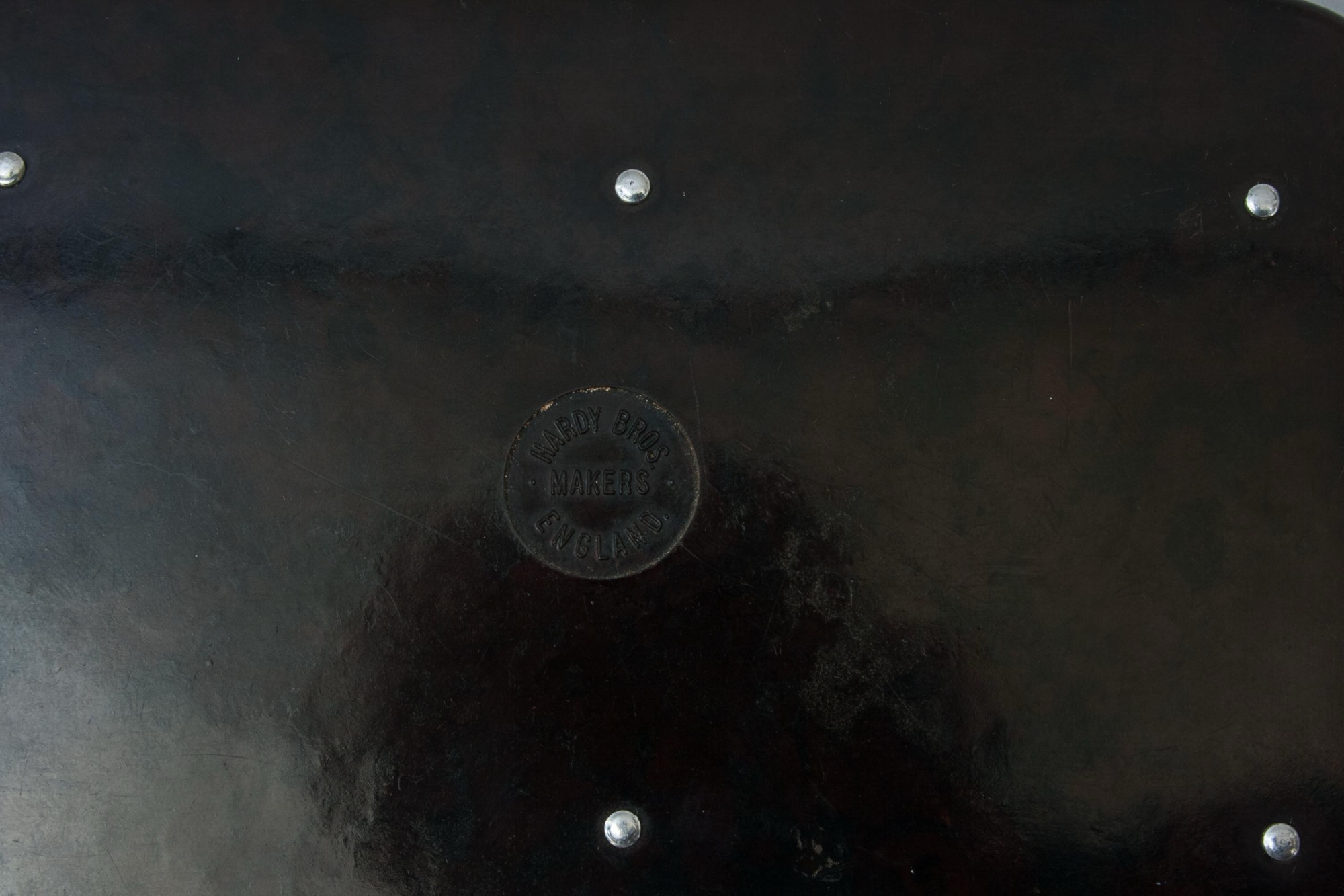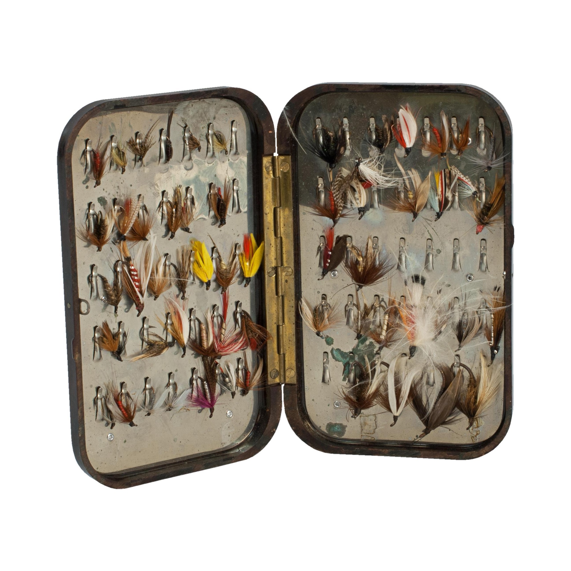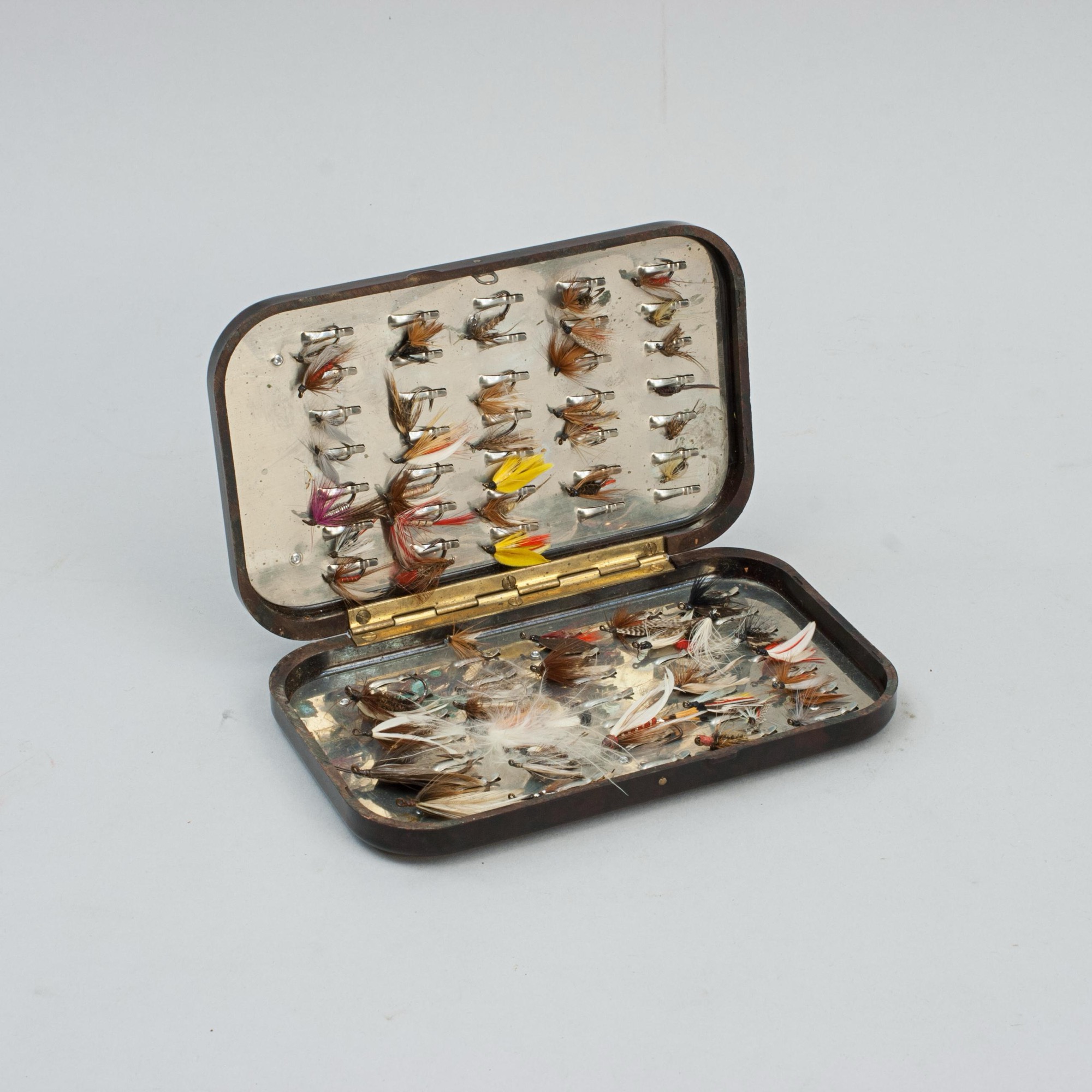 A good Neroda fly box made from bakelite with a blood red tortoiseshell finish manufactured by Hardy's of Alnwick. The lid and bottom embossed with 'HARDY BROS. MAKERS ENGLAND' and holding a small selection of fully dressed trout flies hooked over the metal fittings, Hardy's 'Holdtite' finger clips. There are 35 finger clips on both sides, making a total of 70 flies that can be stored in the Hardy fly case. In Hardy's Anglers' Guides they say about the fly boxes:- We wish to introduce to our Angling friends a long felt want in the form of a new and perfect fly box, something which entirely eclipses the japanned tin and aluminium boxes now used.