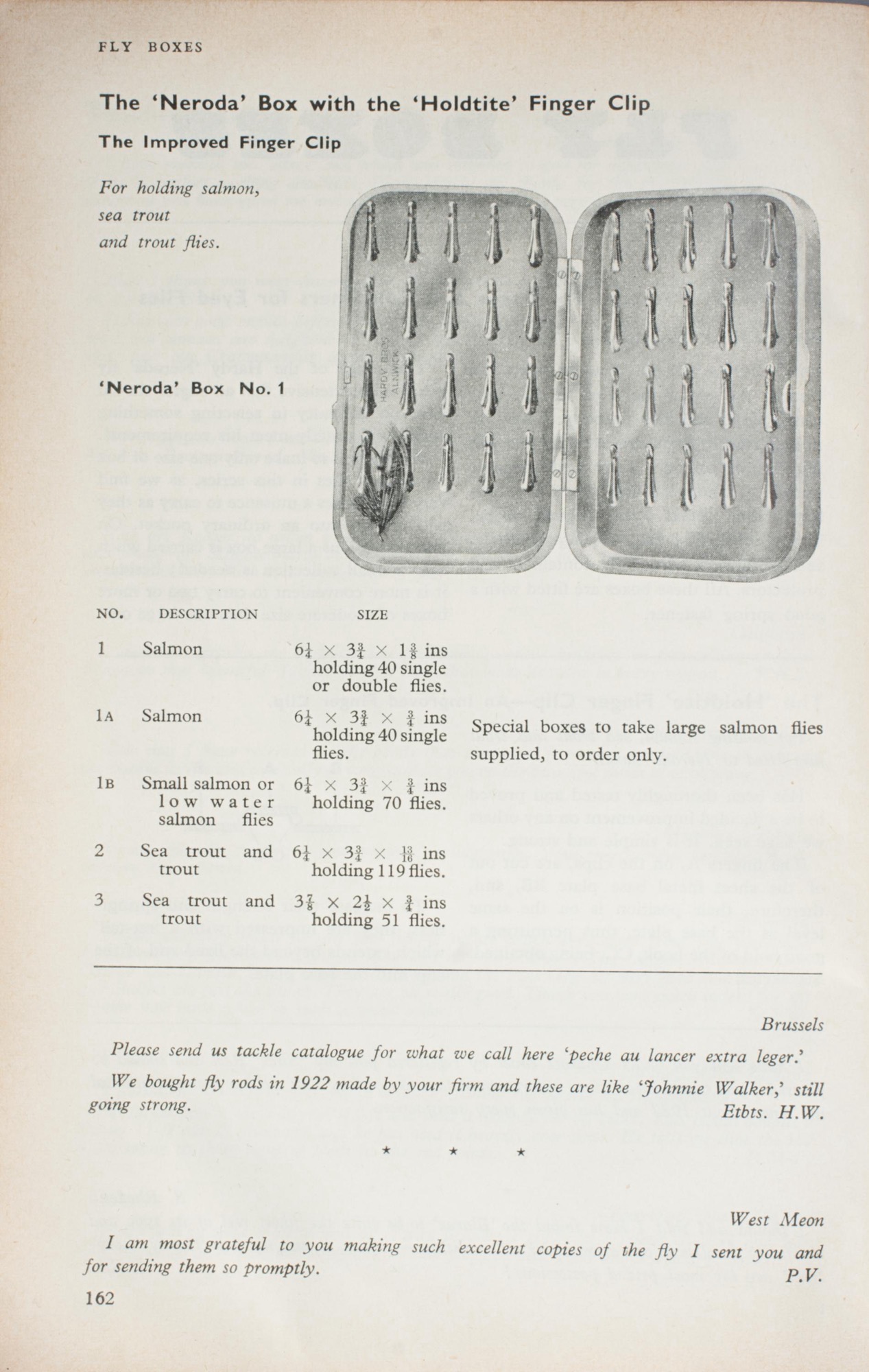 These new boxes will not bend or warp and disturb the set of the clips so that they cannot hold the flies properly. They are not affected by exposure to damp and will not rust or corrode. They never become unsightly, mutilated and practically useless; they retain their original shape, highly polished finish, closing properly, and are always perfect fly containers and protectors. All these boxes are fitted with a good spring fastener.