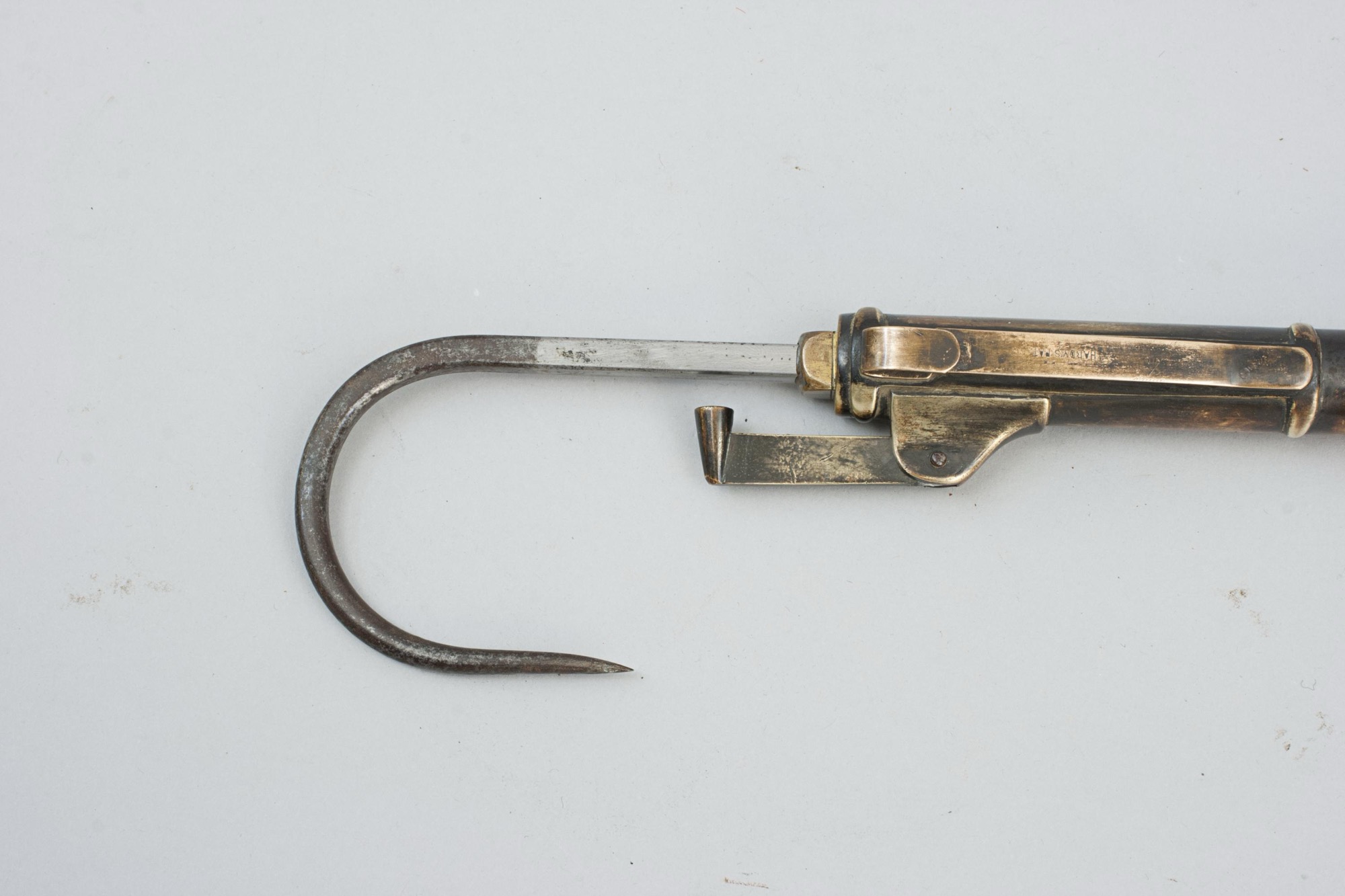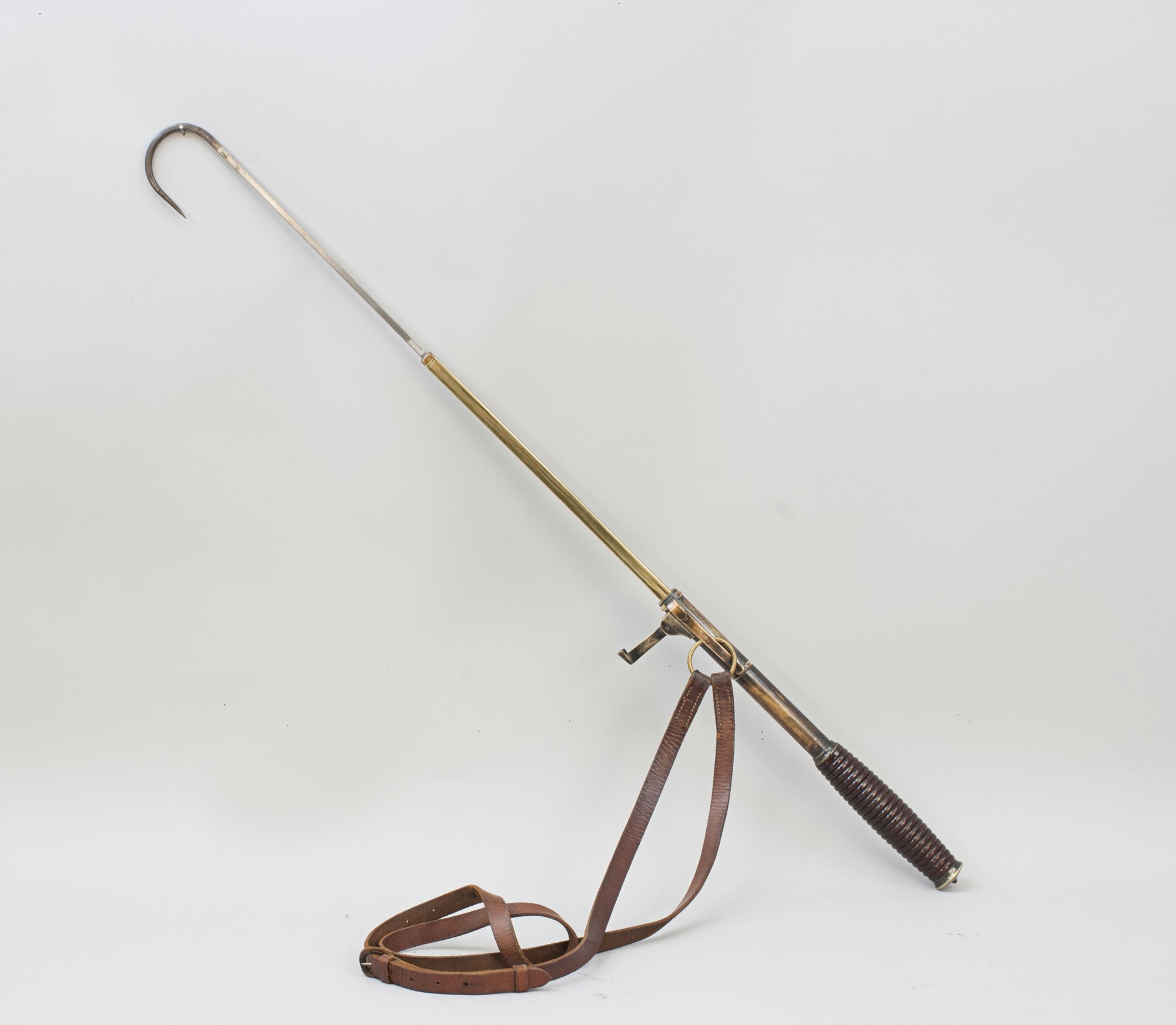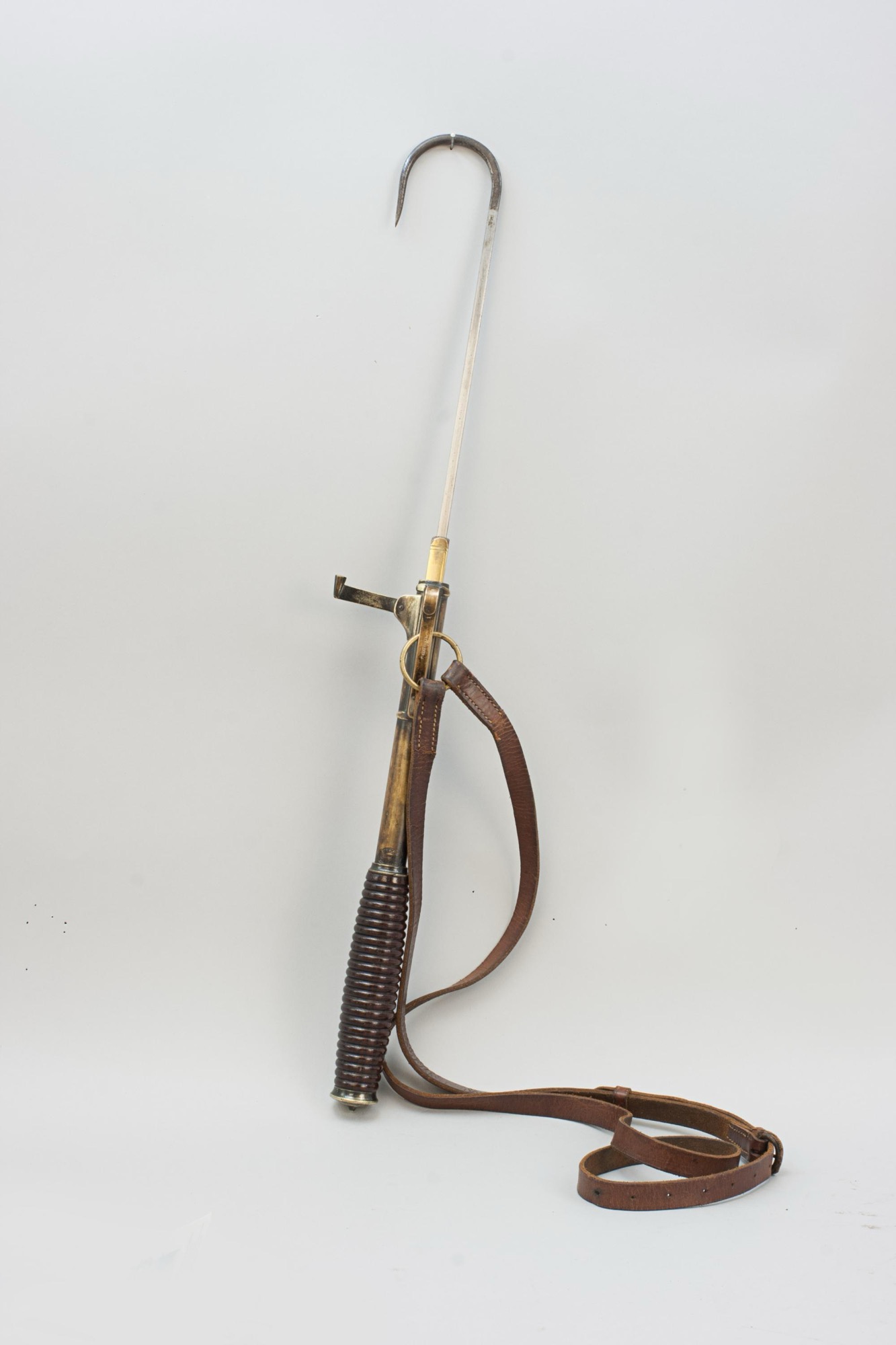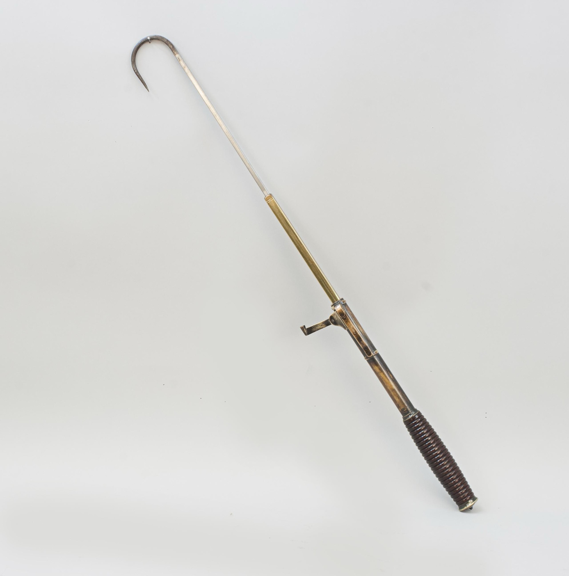 A very nice three piece telescopic fishing gaff made by the renowned fishing tackle manufacturer, Hardy Brothers, Alnwick with leather shoulder strap. The high quality piece has a round outer body, the telescopic pieces with a square shape, the hook being made of steel. The main body is brass and incorporates a brass folding safety guard for the hook and a shoulder strap clip. The clip is stamped 'Hardy's Pat'. The wooden handle is made of lignum vitae and finished off with a brass finial.