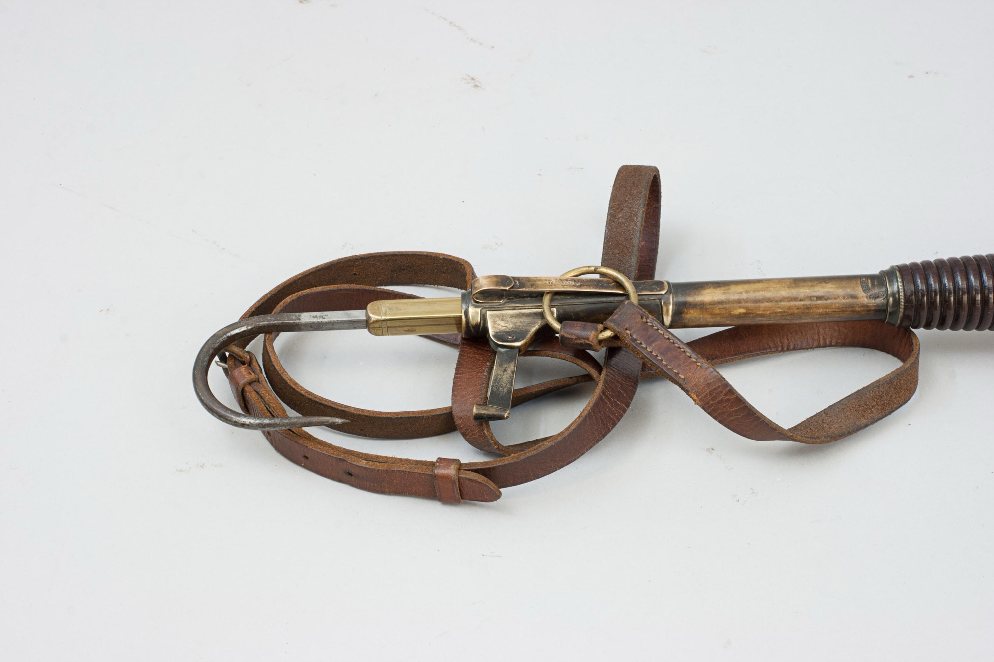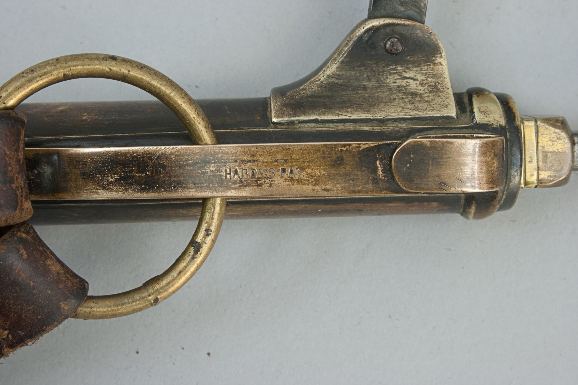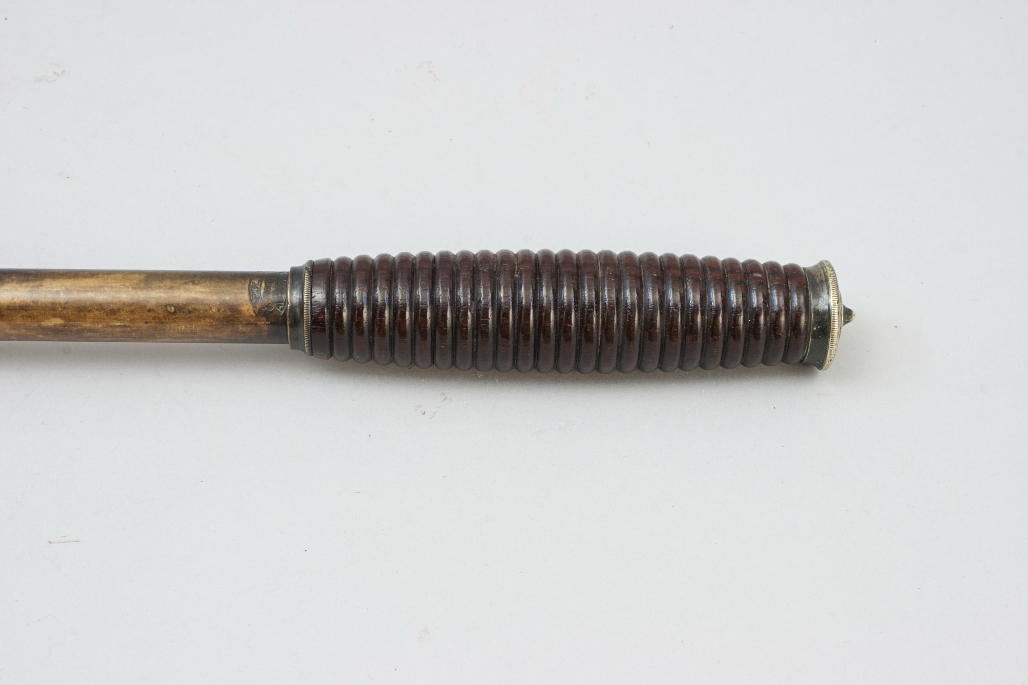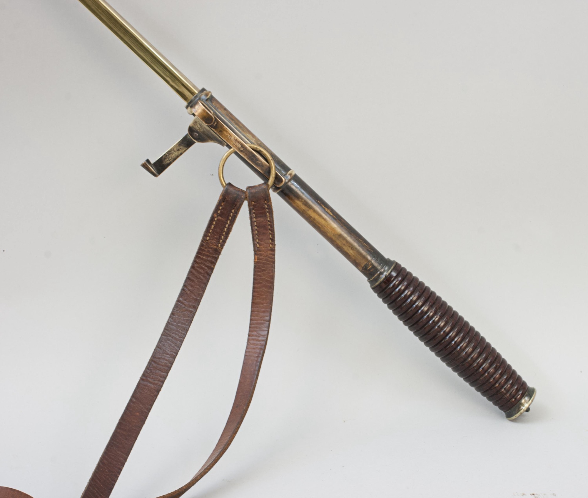 A very nice three piece telescopic fishing gaff made by the renowned fishing tackle manufacturer, Hardy Brothers, Alnwick with leather shoulder strap. The high quality piece has a round outer body, the telescopic pieces with a square shape, the hook being made of steel. The main body is brass and incorporates a brass folding safety guard for the hook and a shoulder strap clip. The clip is stamped 'Hardy's Pat'. The wooden handle is made of lignum vitae and finished off with a brass finial.