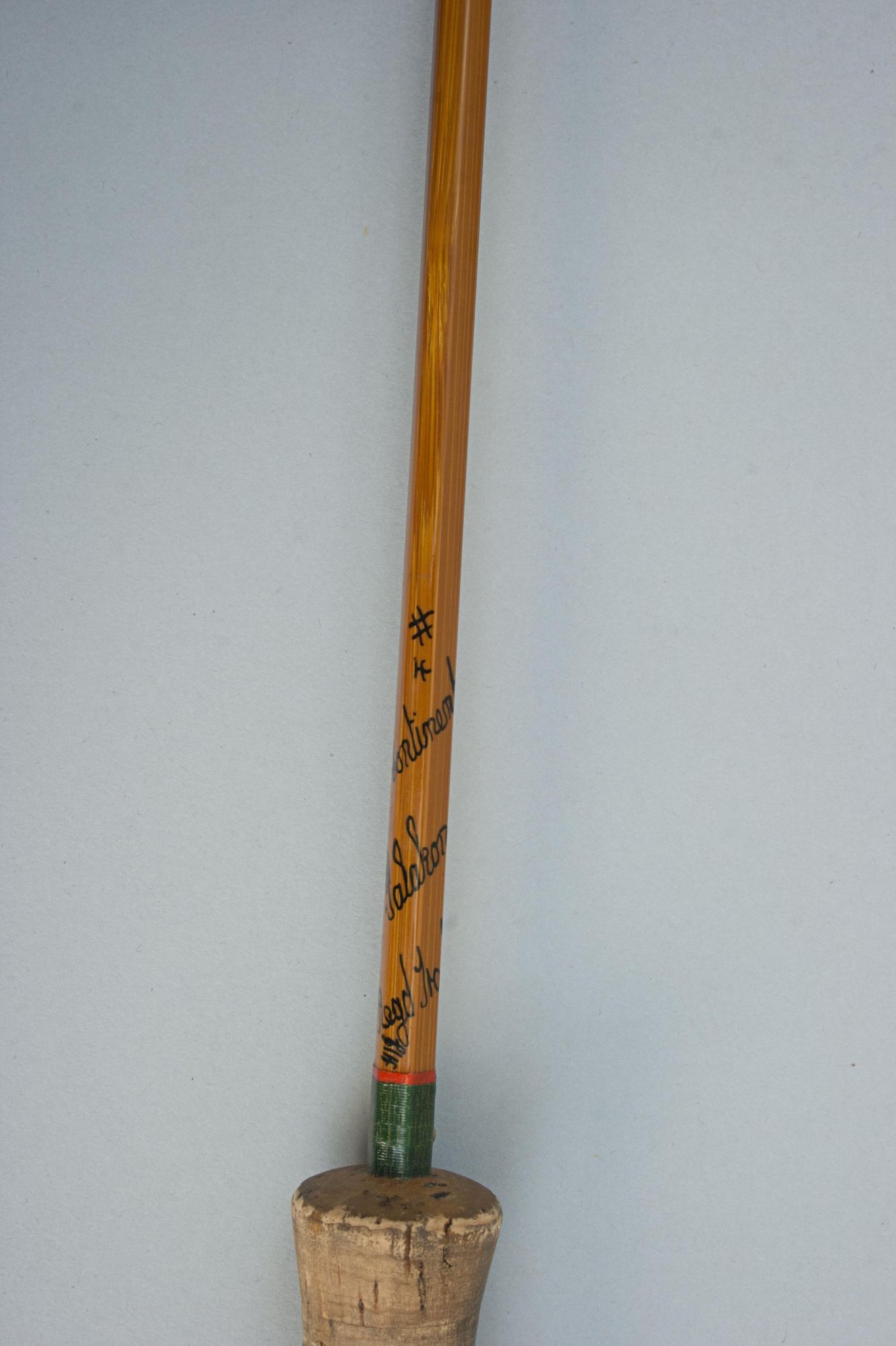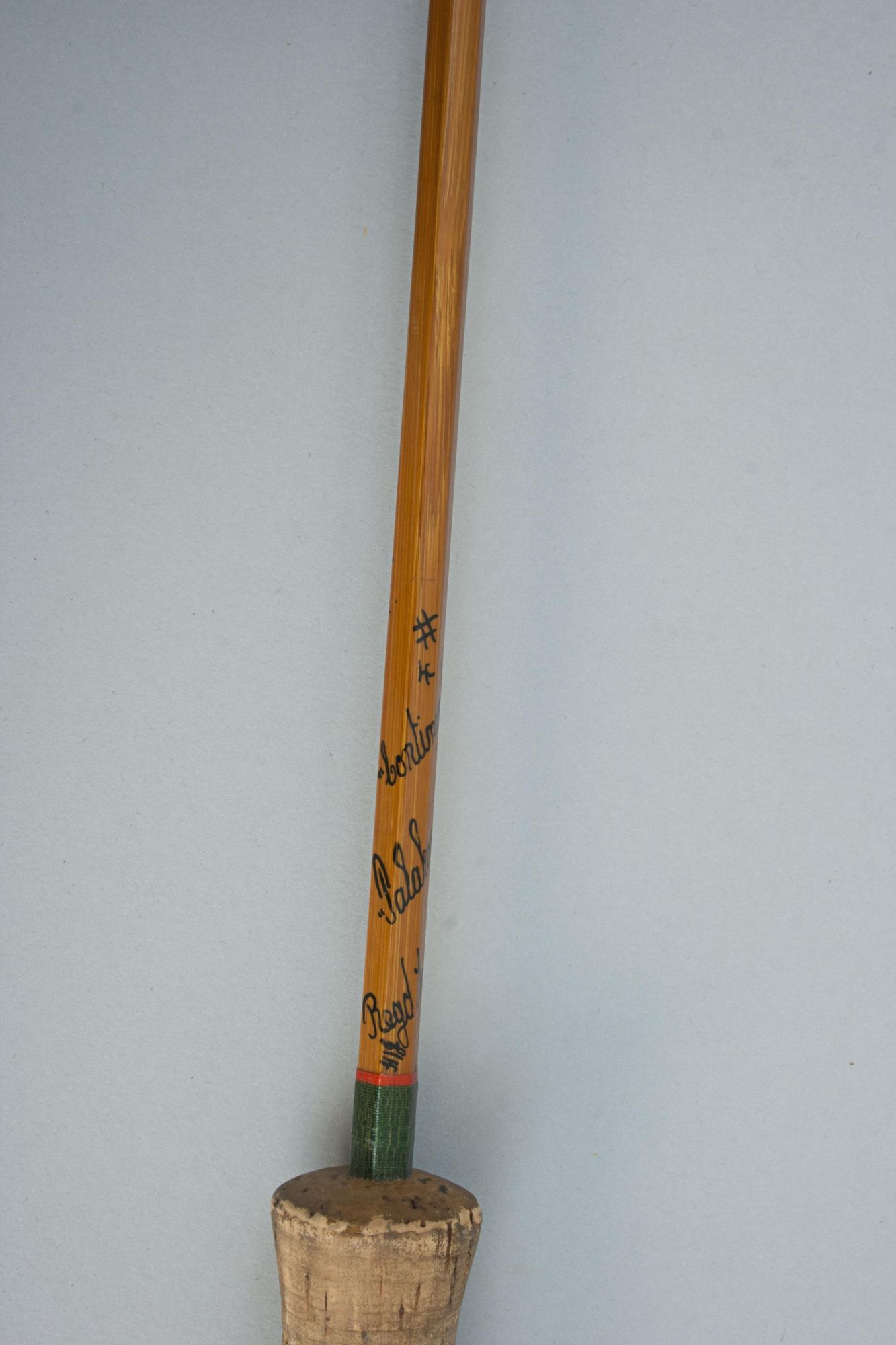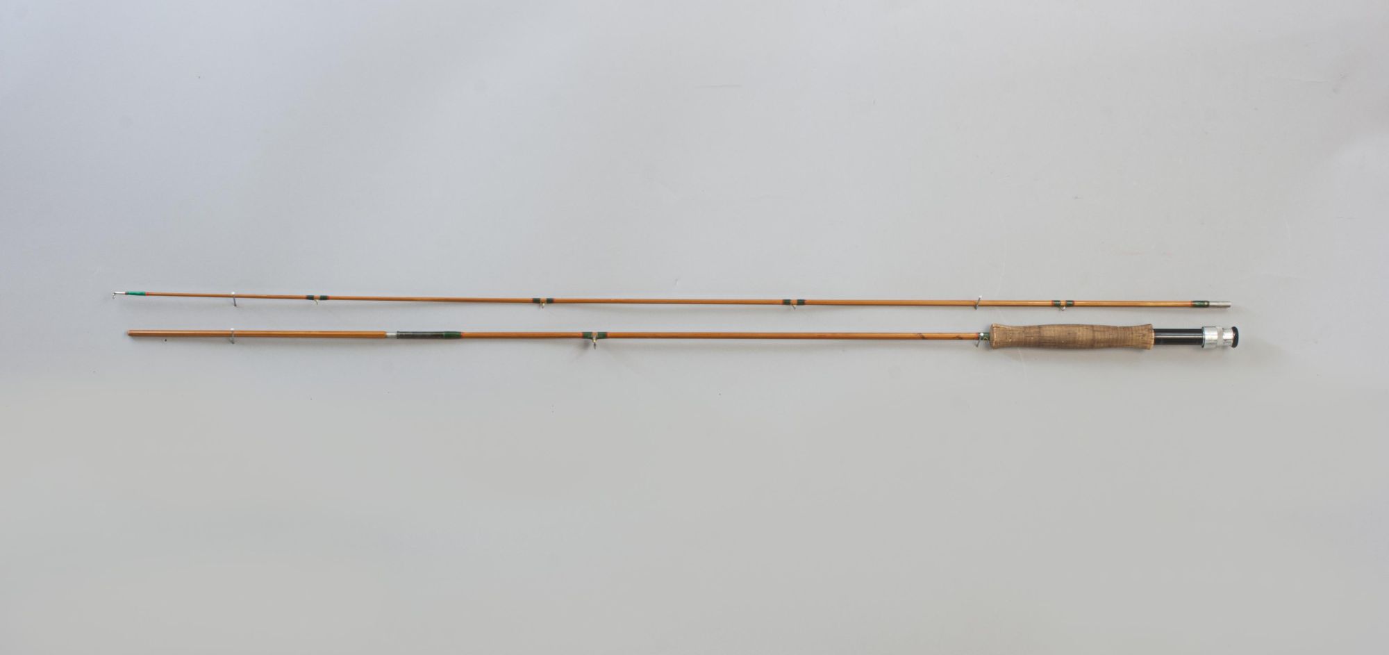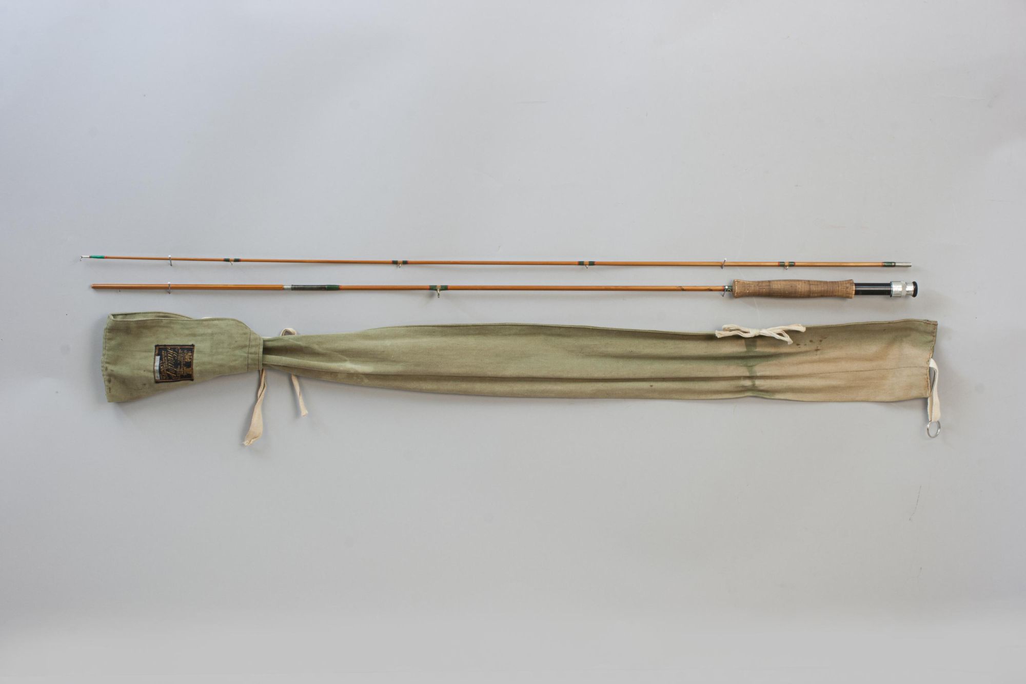 The Hardy 'Continental Special' is a split cane Palakona 2-piece rod made by Hardy's of Alnwick, it is in good condition with suction joints, screw universal alloy band reel fitting, cork handle, snake rings and green coloured Silk tyings with crimson ends. The fly-fishing rod has the black inscription spiralling around the shaft:- #4, Continental Special, "Palakona", Regd Trade Mark, 7', and comes in an original Hardy's canvas partition bag with cloth label. The split cane brook trout fly rod is an unusual rod, possibly a special order. It may have been altered and made shorter (the inscription states 7' and it measures 6') but there are no obvious signs of this, likely dating to the late 1960s - early 1970s. The butt part of the rod with a long bamboo stopper for protection of the tip when in the canvas bag.