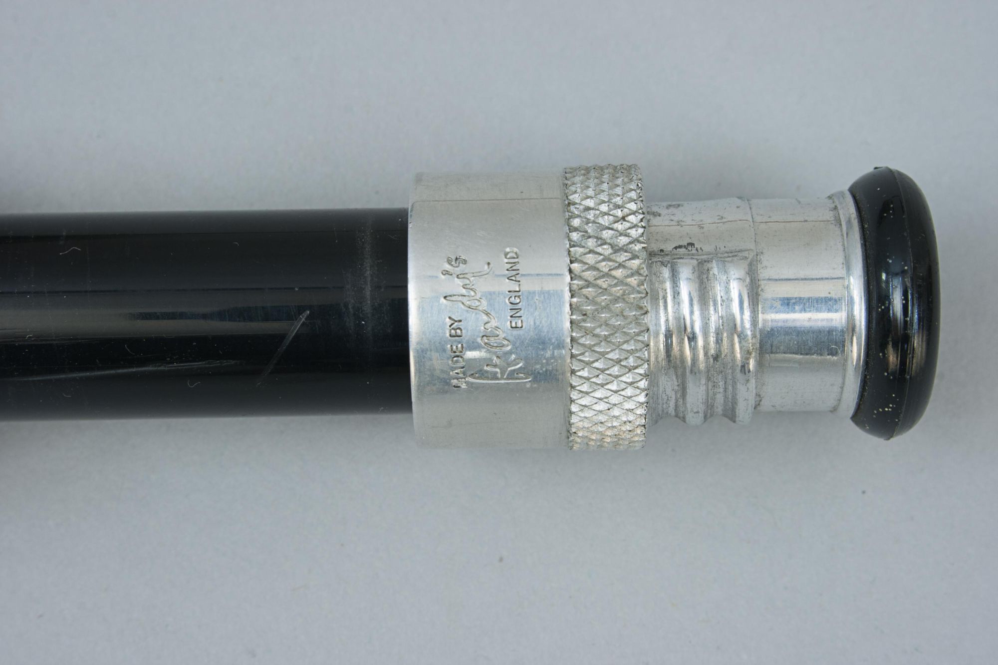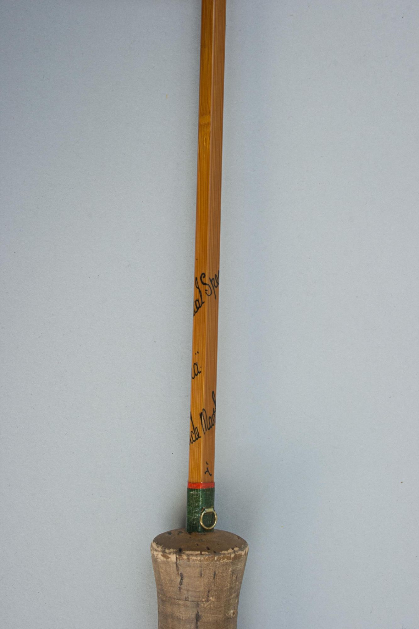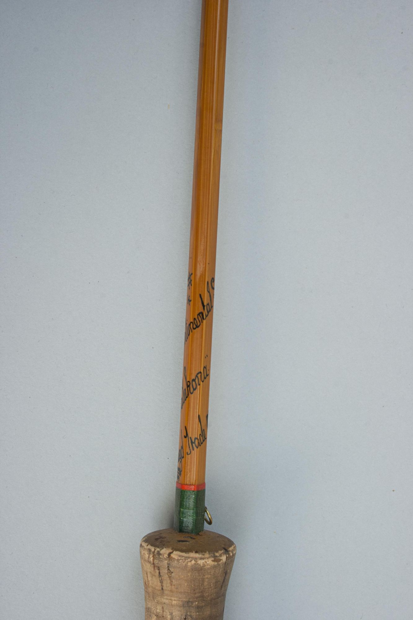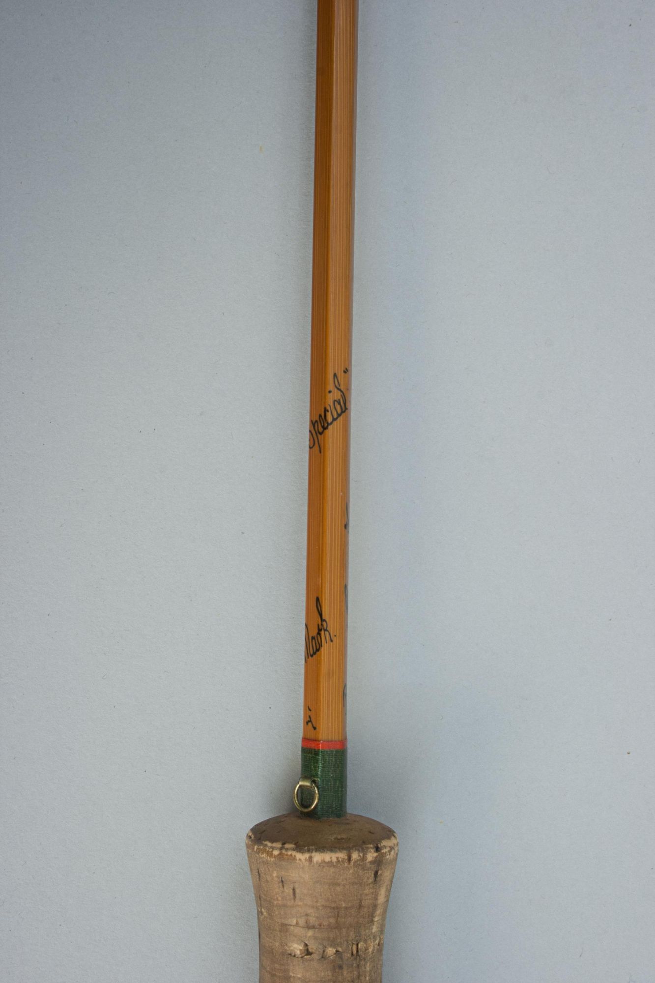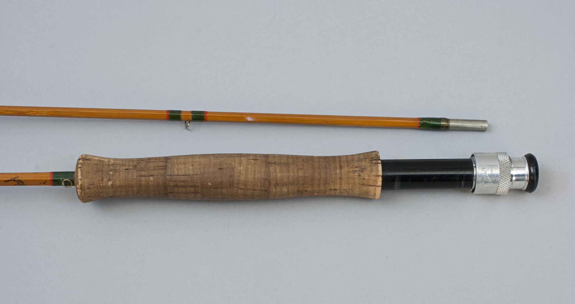 The Hardy 'Continental Special' is a split cane Palakona 2-piece rod made by Hardy's of Alnwick, it is in good condition with suction joints, screw universal alloy band reel fitting, cork handle, snake rings and green coloured Silk tyings with crimson ends. The fly-fishing rod has the black inscription spiralling around the shaft:- #4, Continental Special, "Palakona", Regd Trade Mark, 7', and comes in an original Hardy's canvas partition bag with cloth label. The split cane brook trout fly rod is an unusual rod, possibly a special order. It may have been altered and made shorter (the inscription states 7' and it measures 6') but there are no obvious signs of this, likely dating to the late 1960s - early 1970s. The butt part of the rod with a long bamboo stopper for protection of the tip when in the canvas bag.