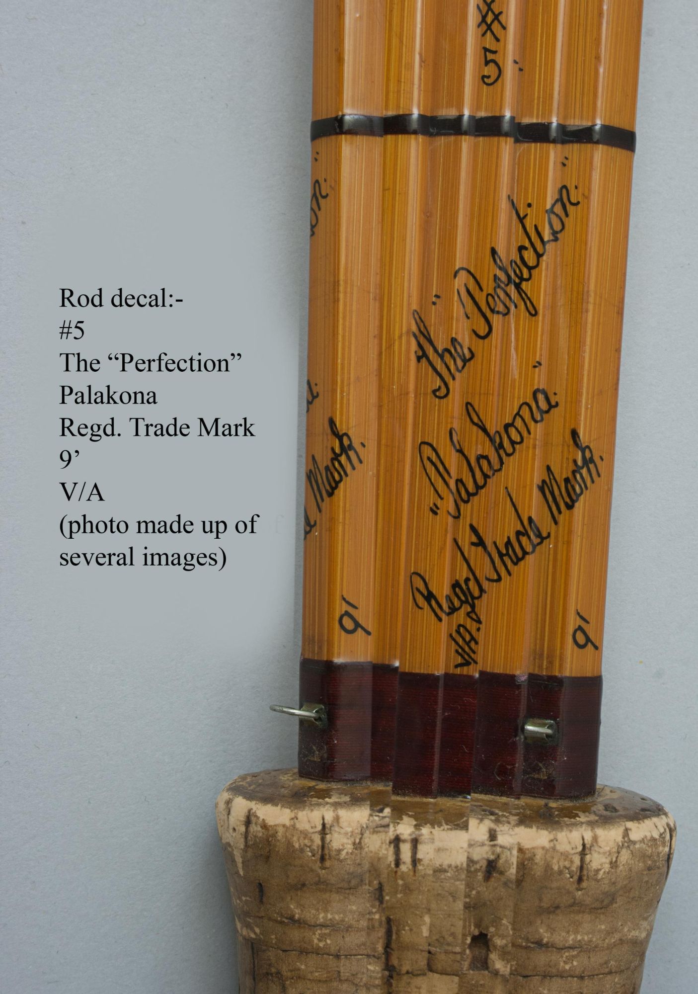 A beautifully 2 piece 9' split cane fly fishing rod by Hardy of Alnwick. The rod is in very good condition with the inscription spiralling around the rod, #5, The "Perfection", Palakona, Regd Trade Mark, 9', V/A'. The rod is a 2 piece rod with original hardy partition canvas bag, fitted with bronze ferrules, suction joint with wooden stopper, cork handle with alloy screw reel fitting. The alloy screw reel fitting bears Hardy's logo on it but no date code.