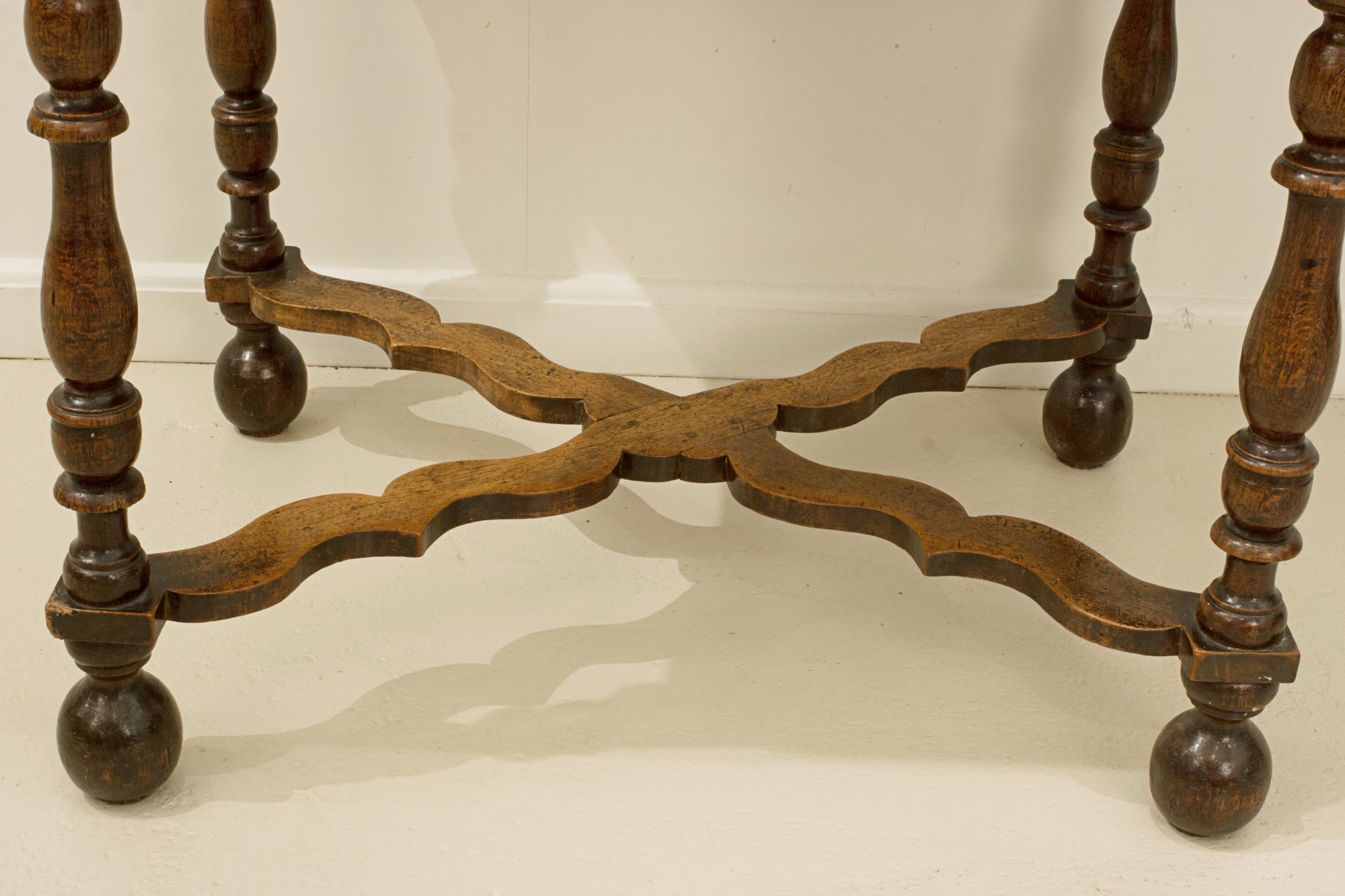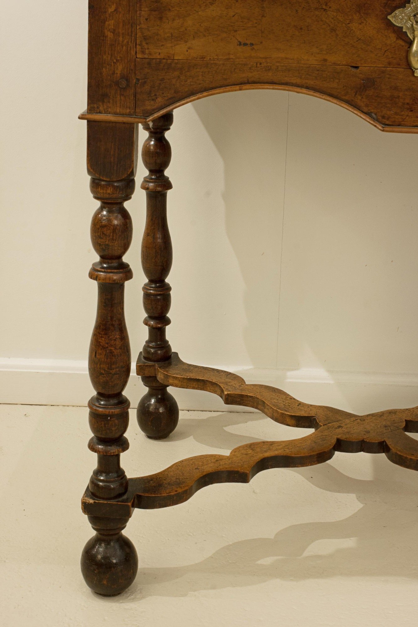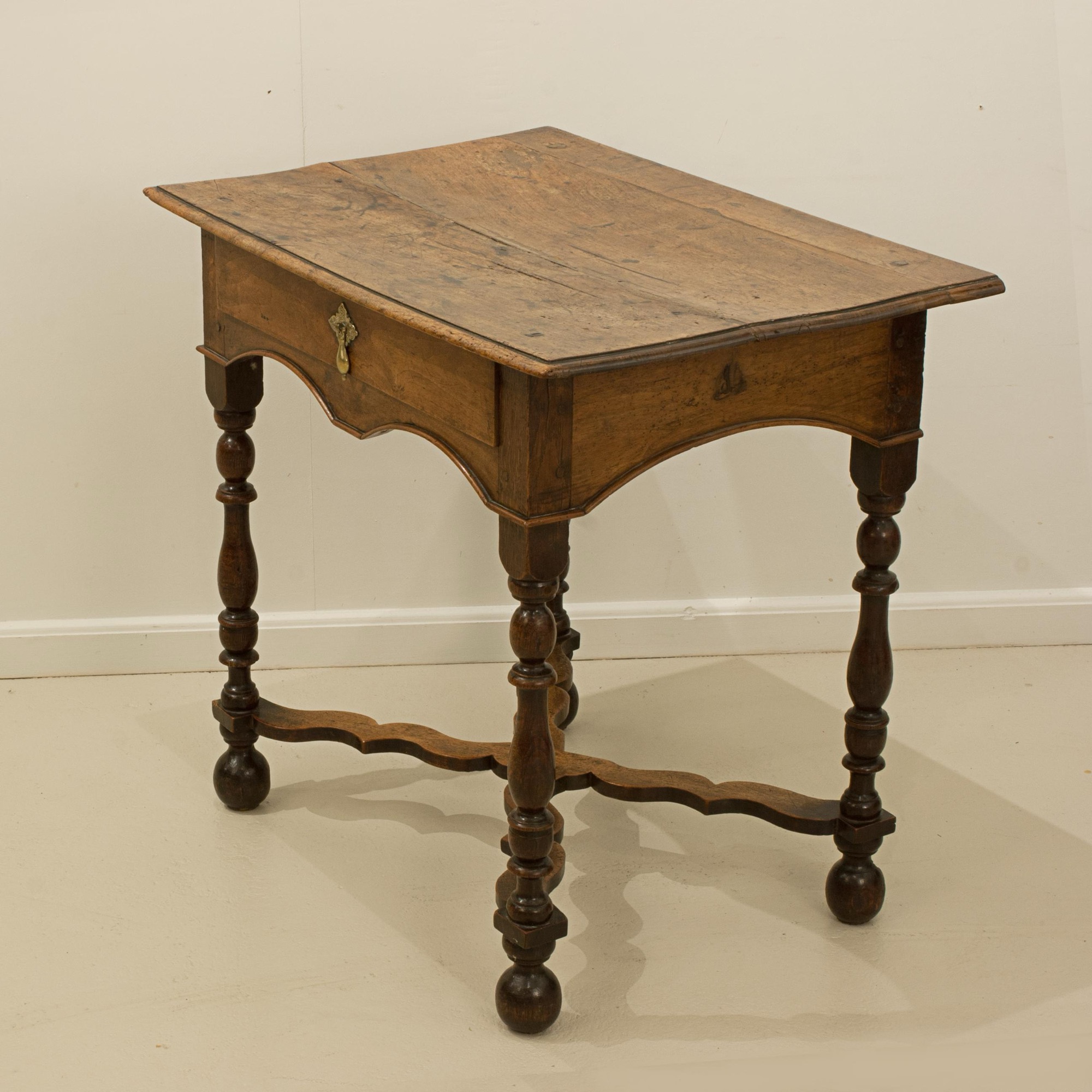 A beautiful early 19th-century walnut and oak side table of elegant proportions. The rectangular moulded top sits above a spacious single drawer with an attractive brass drop handle and shaped frieze. Standing on finely turned baluster legs united by a shaped X-stretcher and terminating in classic ball feet, this piece showcases craftsmanship and character throughout.