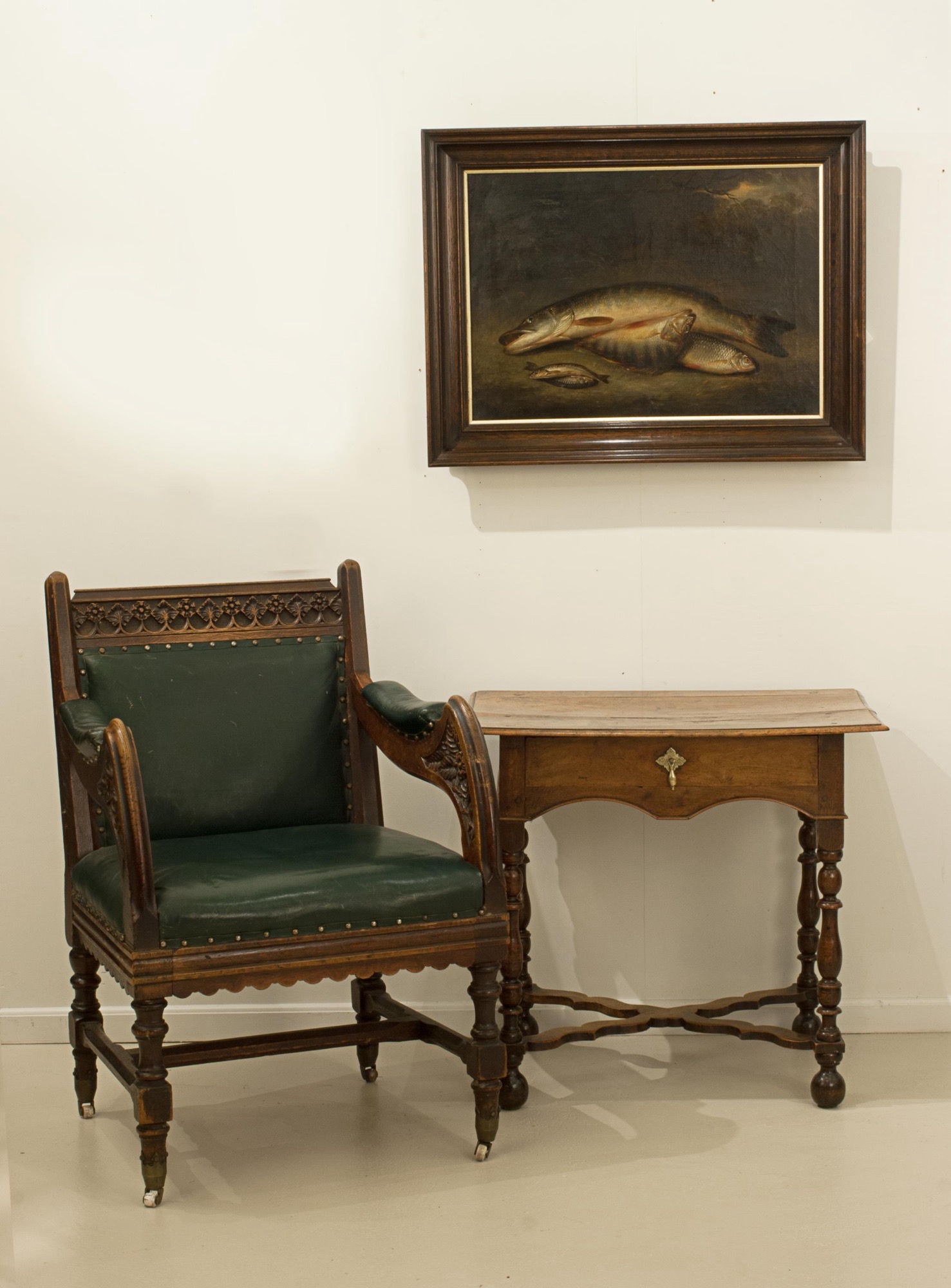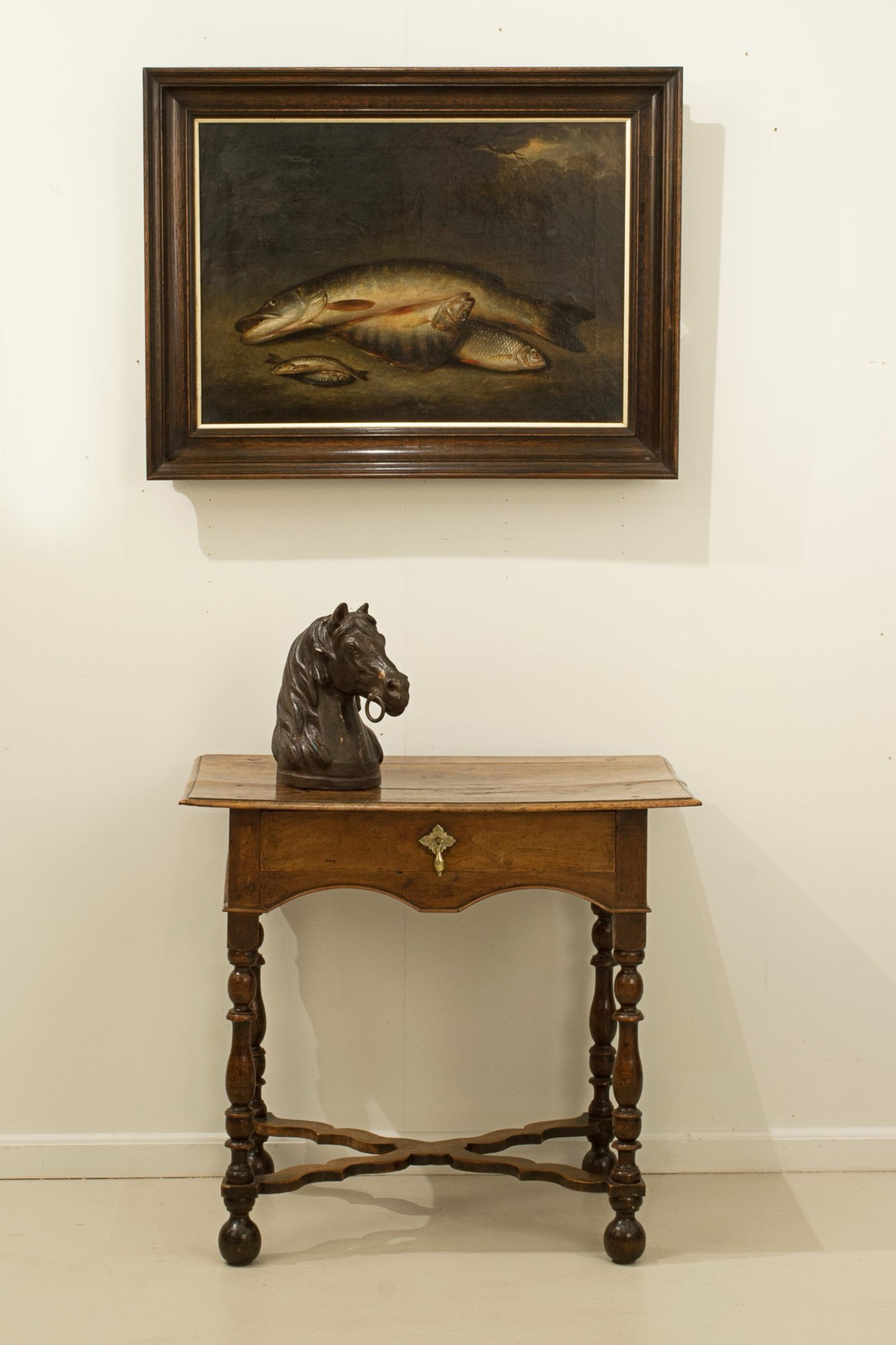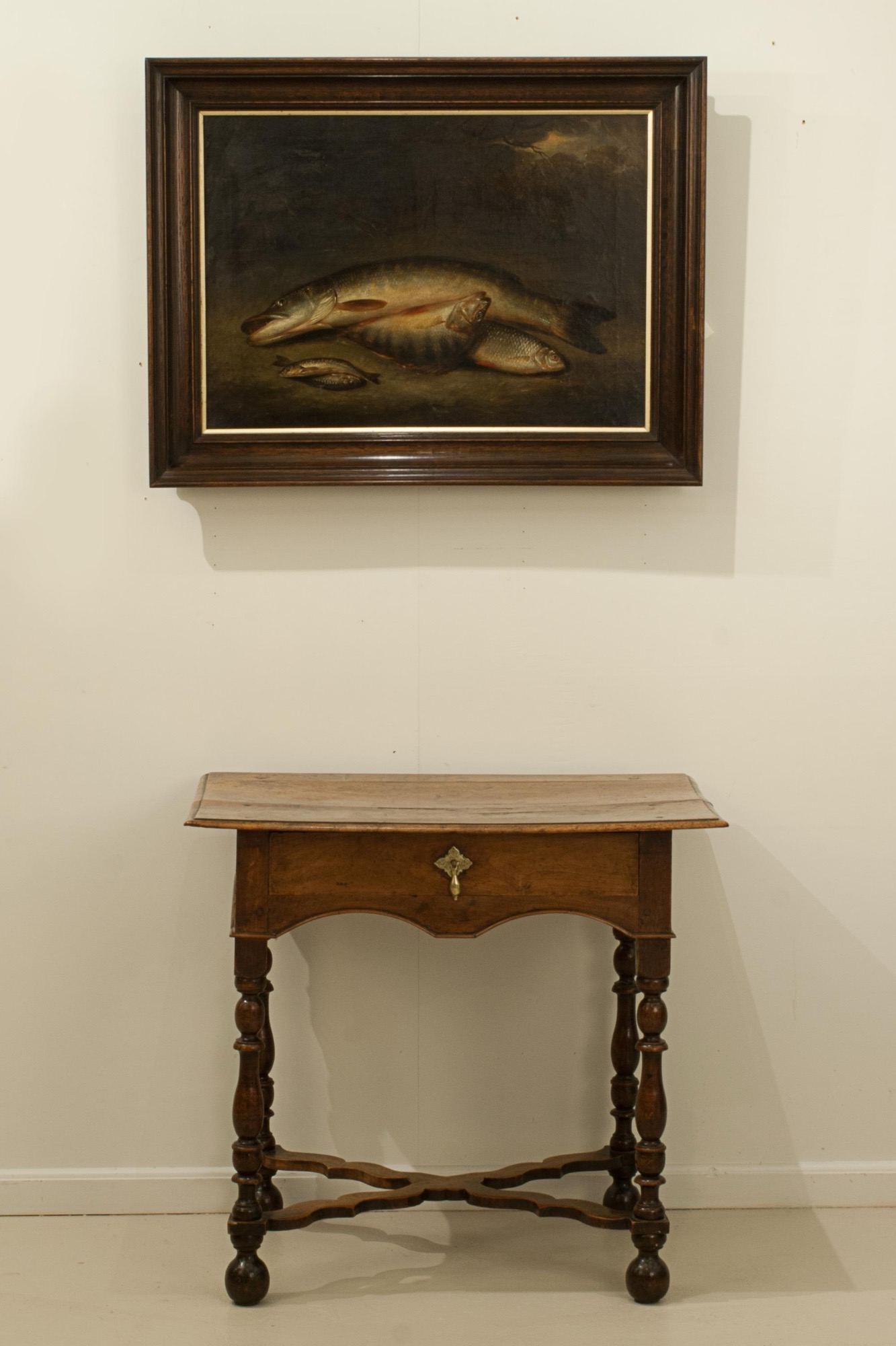 A beautiful early 19th-century walnut and oak side table of elegant proportions. The rectangular moulded top sits above a spacious single drawer with an attractive brass drop handle and shaped frieze. Standing on finely turned baluster legs united by a shaped X-stretcher and terminating in classic ball feet, this piece showcases craftsmanship and character throughout.