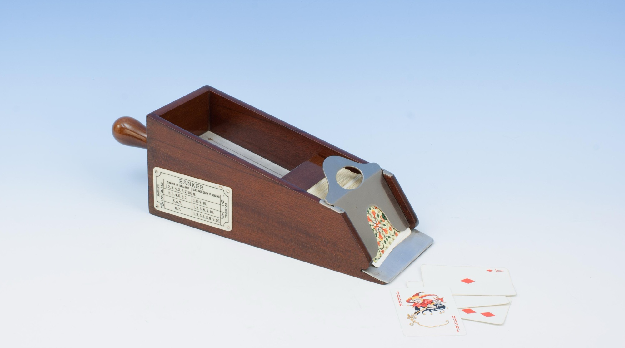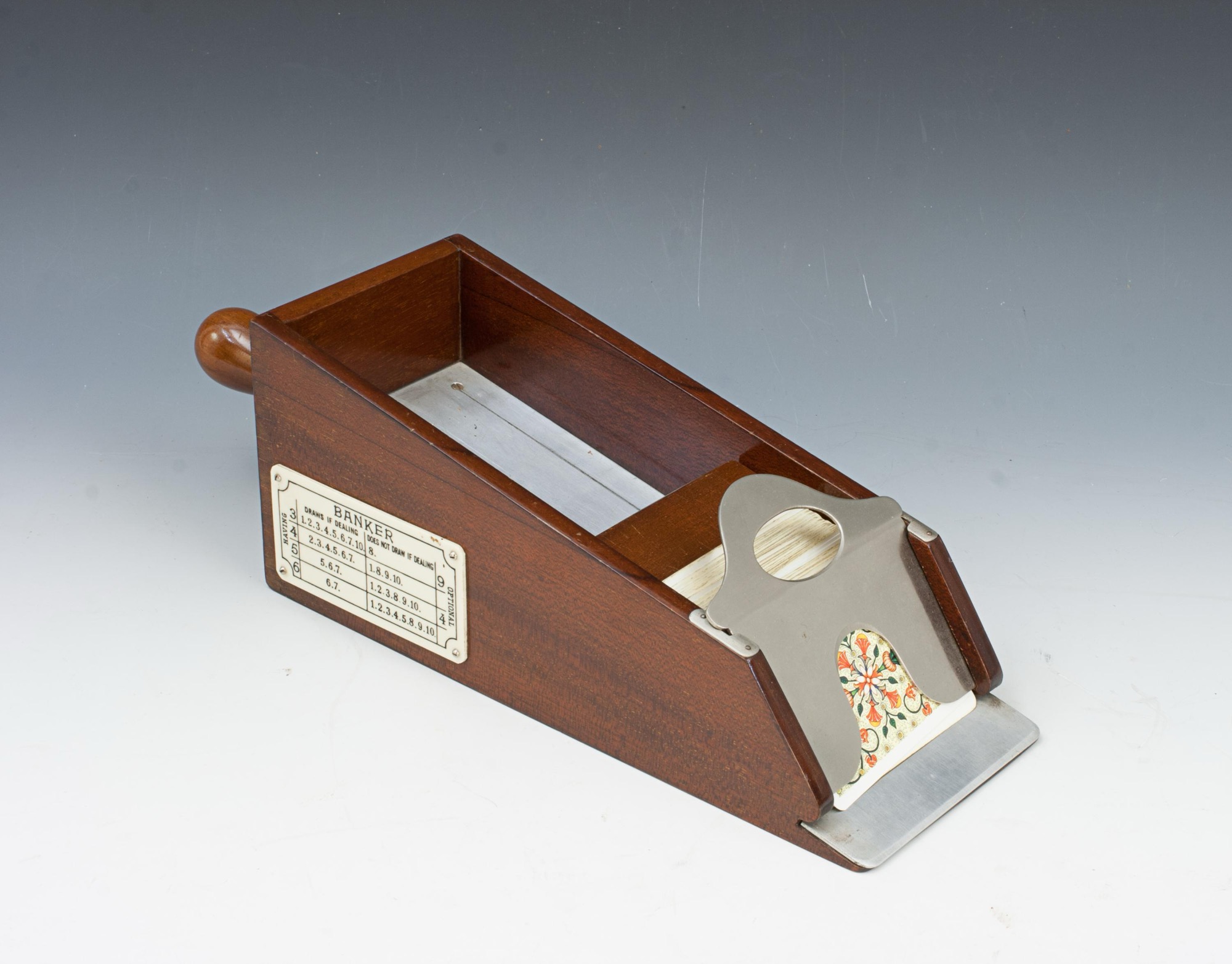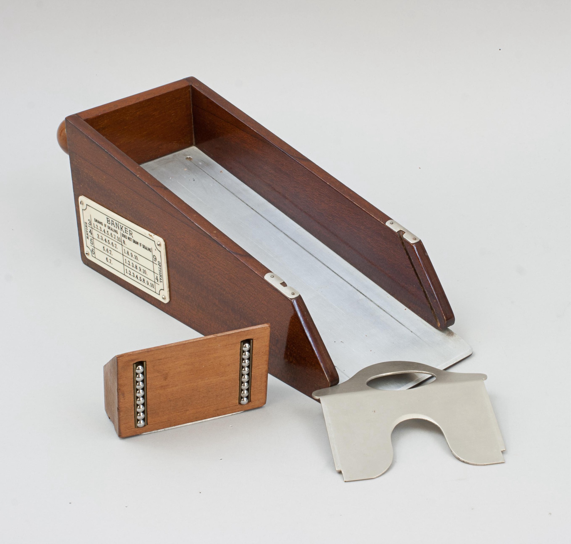 Elevate your card games with this exquisite French mahogany and aluminium card dealer's shoe, perfect for blackjack, poker, and the sophisticated Chemin de Fer. A Chemin de Fer rules plaque is elegantly displayed on the side, guiding players through the game's intricate tactics, essential for avoiding costly errors in this strategic, high-stakes variant.