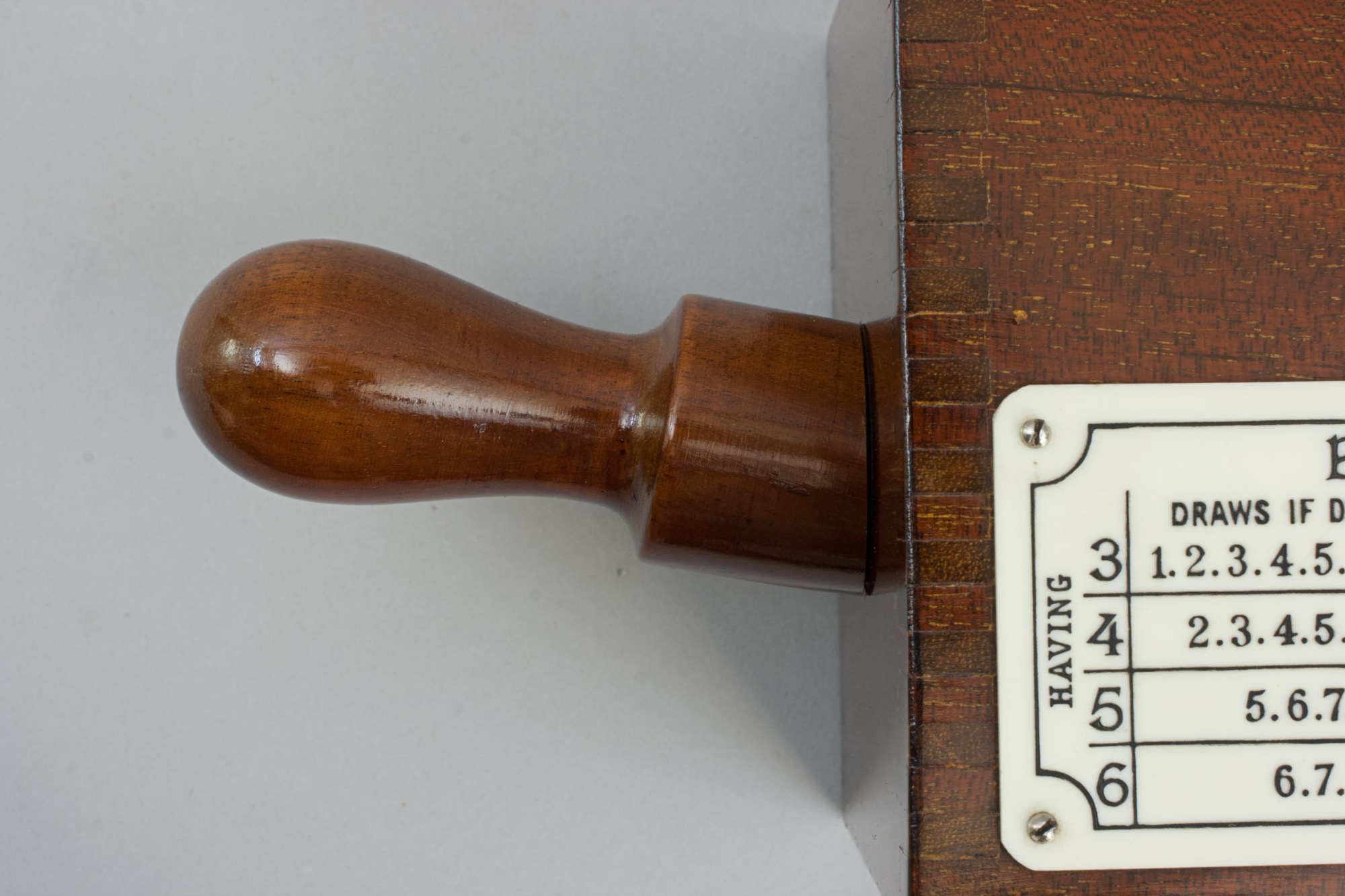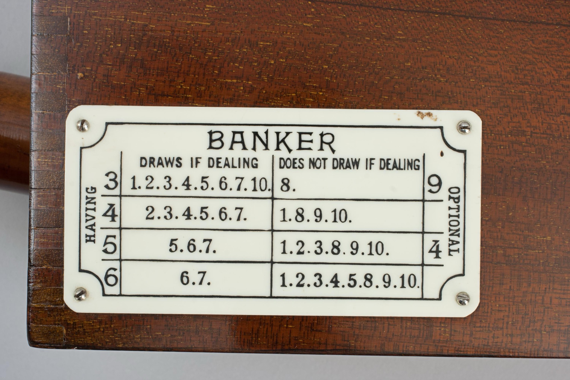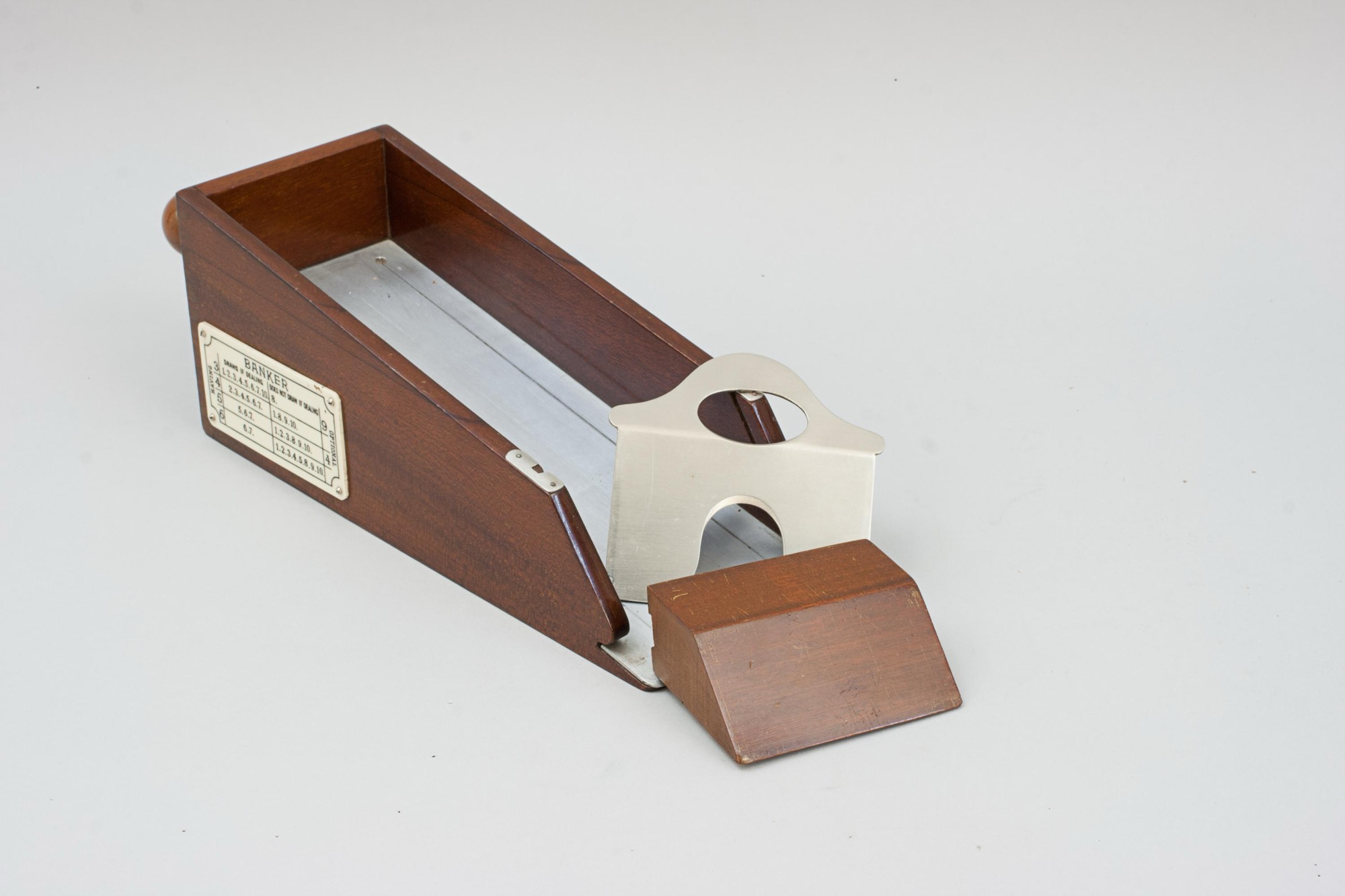 Elevate your card games with this exquisite French mahogany and aluminium card dealer's shoe, perfect for blackjack, poker, and the sophisticated Chemin de Fer. A Chemin de Fer rules plaque is elegantly displayed on the side, guiding players through the game's intricate tactics, essential for avoiding costly errors in this strategic, high-stakes variant.
