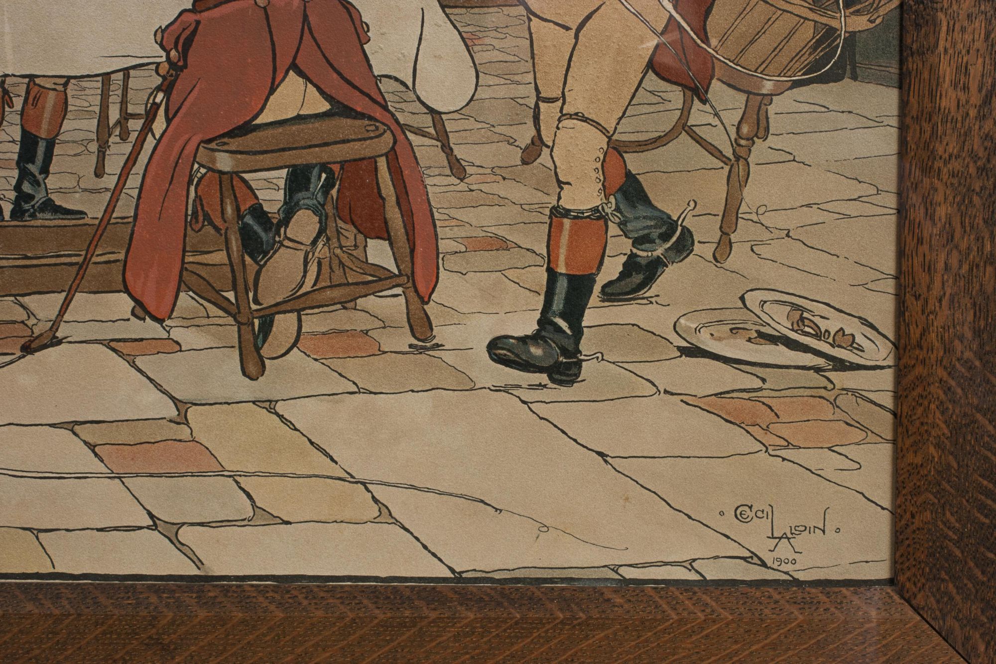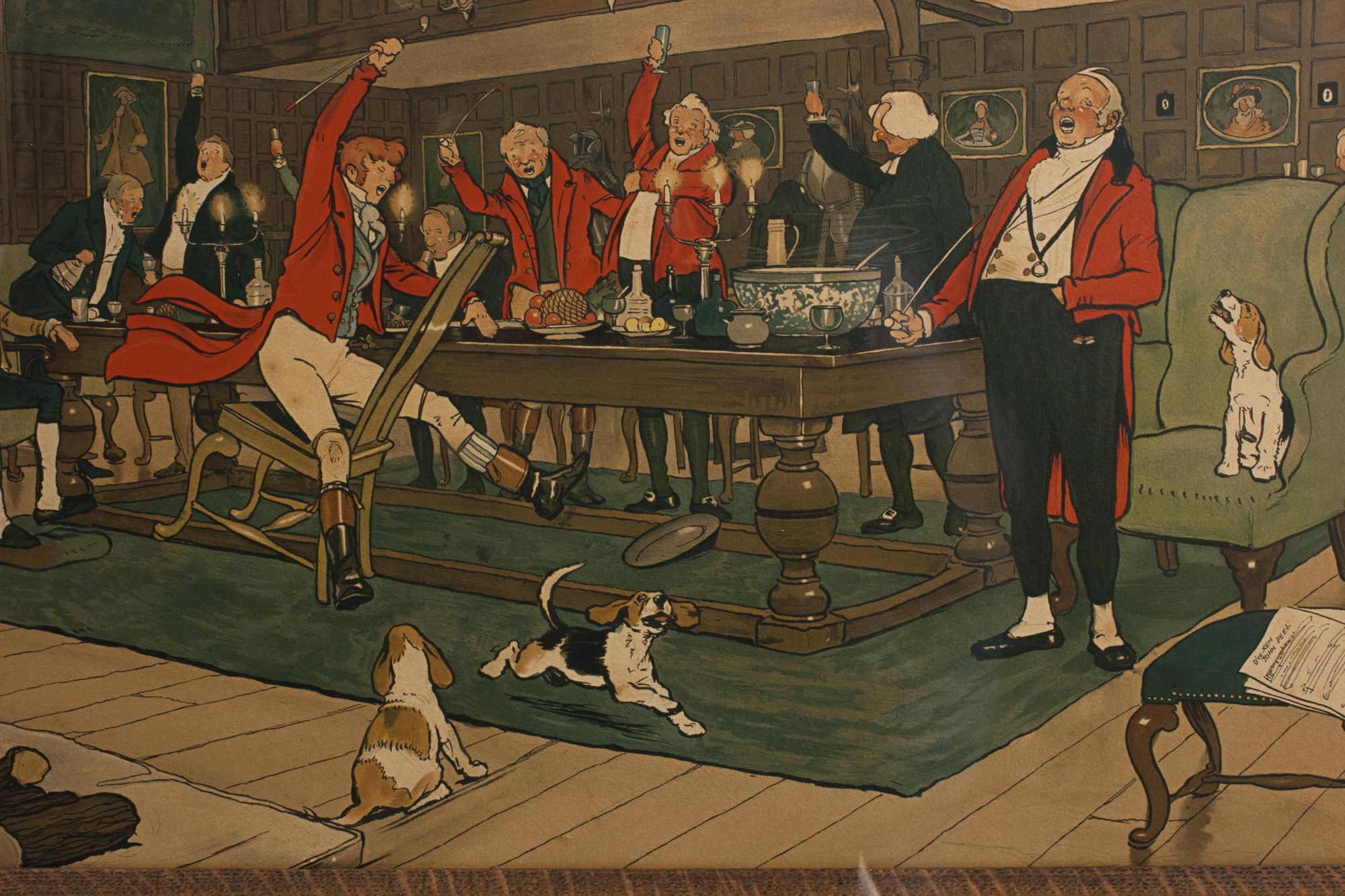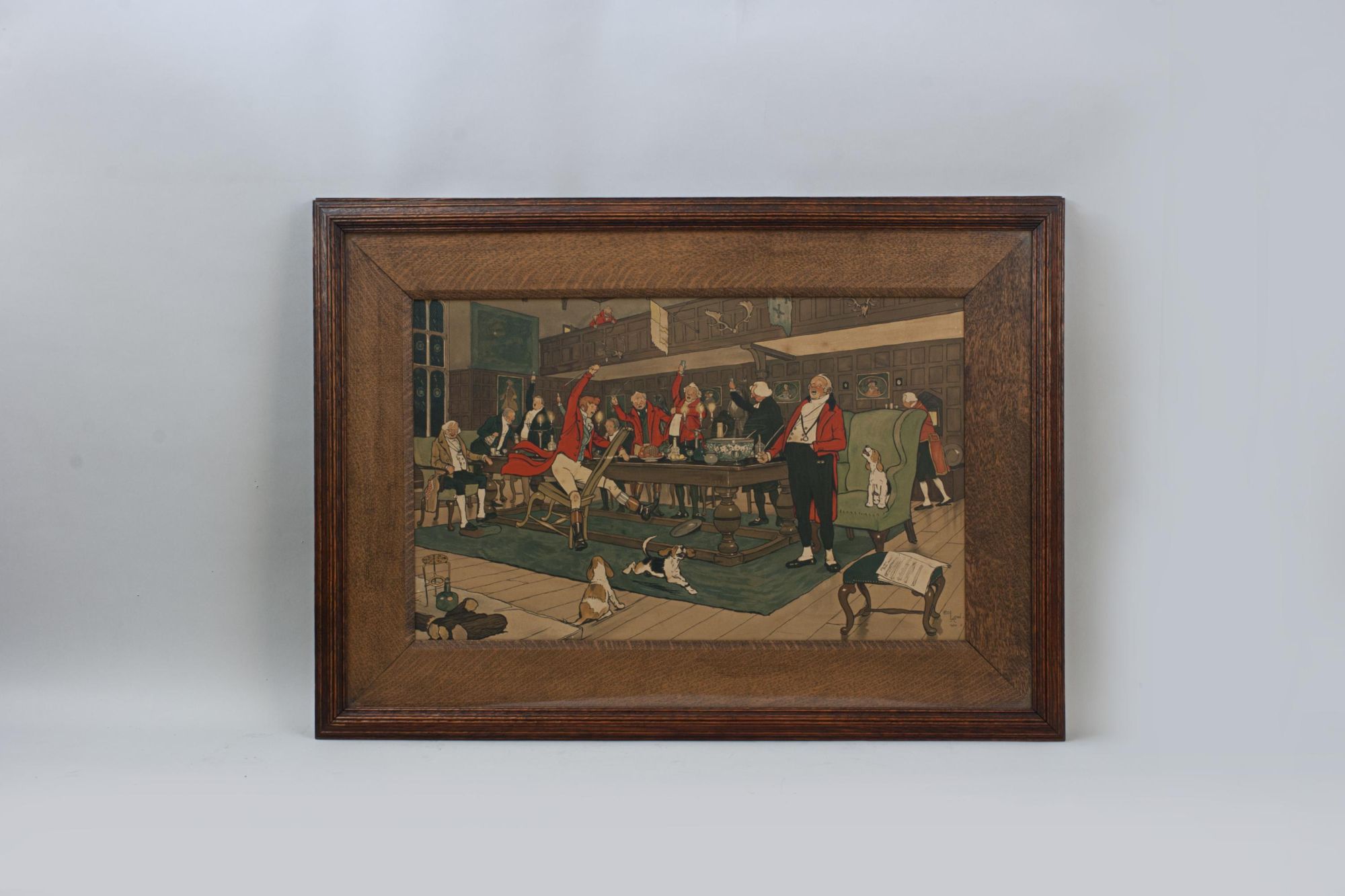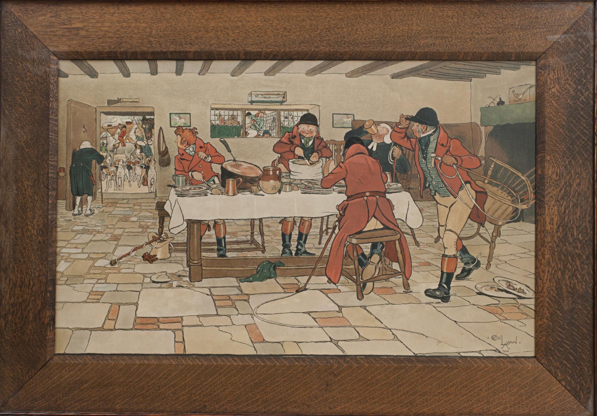 This is one of Cecil Aldin's most famous hunting series 'The Fallowfield Hunt' which tells the story of a days hunting. It was a sequence of six pictures, The Hunt Breakfast at the Three Pigeons, Breaking Cover, Full Cry, A Check, The Death and finally The Hunt Supper. This original pair of lithograph prints depicts the start and finish of the hunting day, The Hunt Breakfast And The Hunt Supper. As with a lot of Aldin's pictures there are touches of humour, depicting Breakfast at the Three Pigeons and a boisterous party celebrating the end of the hunt. In the breakfast scene five gentlemen have nearly missed the start of the hunt. The are desperately trying to finish off their breakfast as the hunt can be seen passing the open door. In the supper scene a large bowl of punch is on the table with a couple of decanters and the gentlemen are seen singing at the top of their voices, even the dogs are joining in. One gentleman is riding a chair as if it is a horse. A great pair of Fox Hunting pictures with great colouring and in their original oak frames with oak mounts.