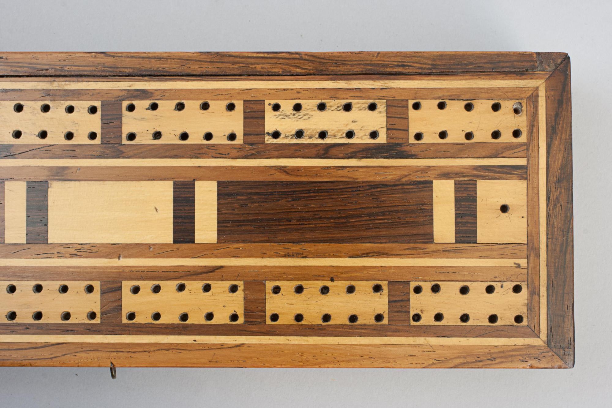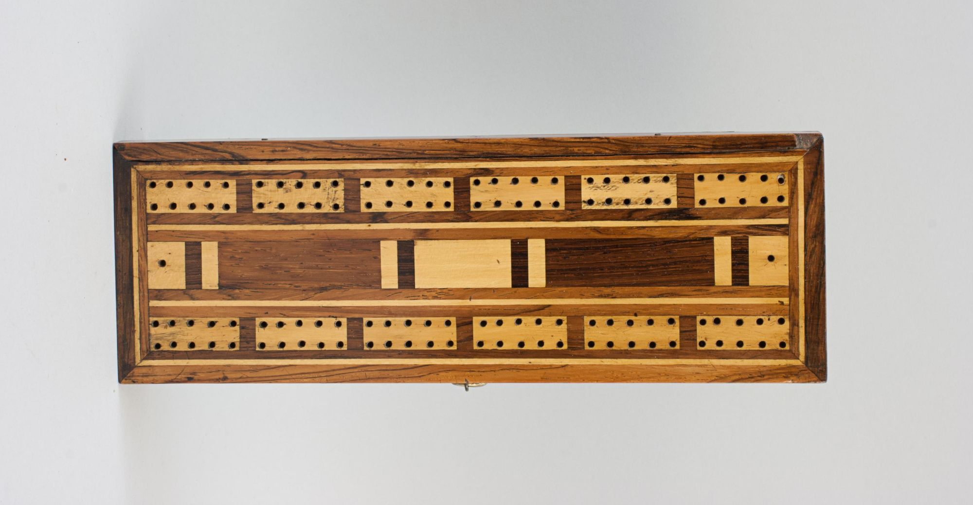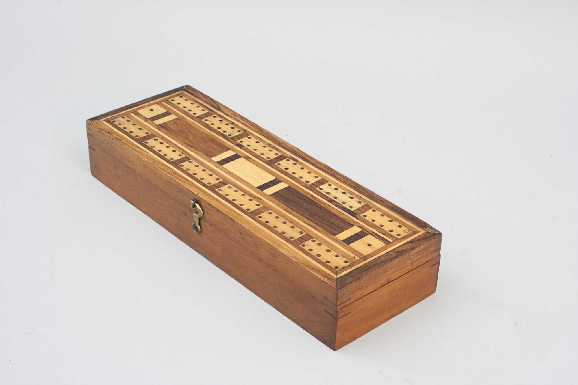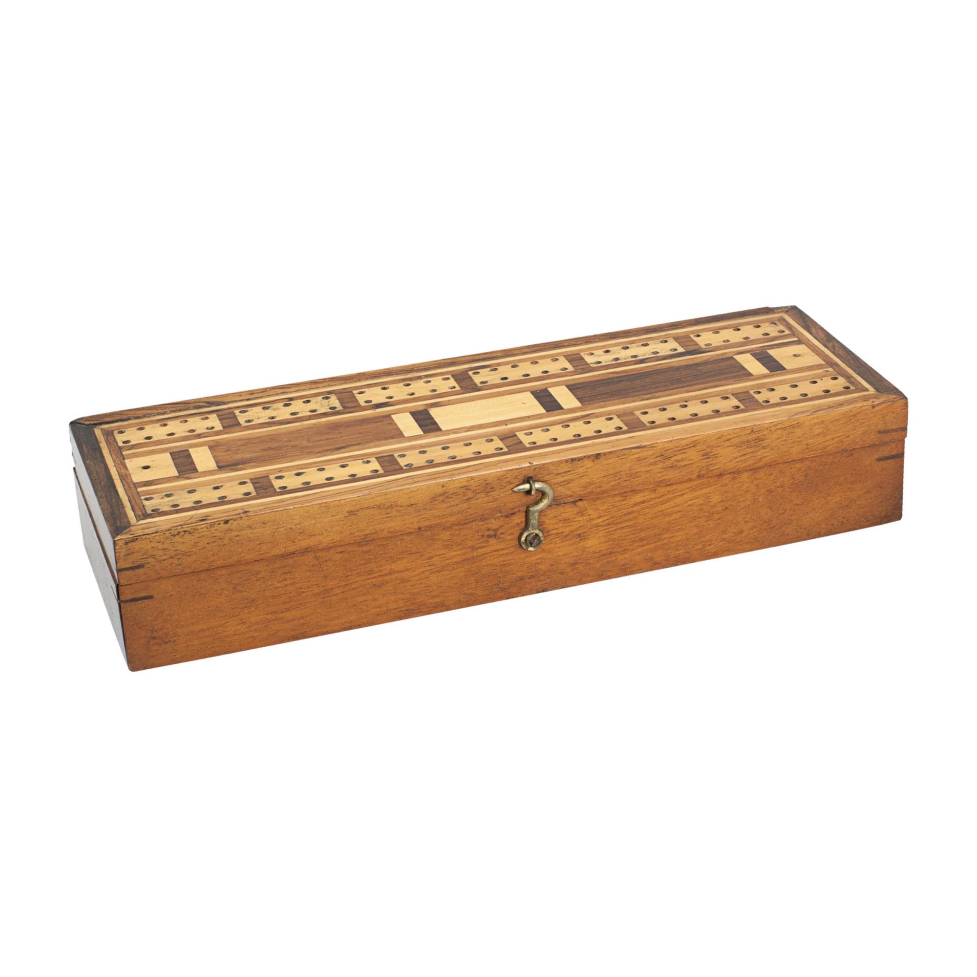 A traditional rectangular cribbage board box with inlaid decoration, made from mahogany and veneered in exotic woods. The board has no scoring numbers but is divided into 5 point segments as a means of keeping track of the score, there is a total of two sets of 60 holes (30 'out' and 30 'back'). One player or team scores on one set of holes and the other player or team scores on the second set, this way you can tell at a glance who is winning and how far away from victory they are. The hinged lid lifts to reveal three compartments, one lidded central compartment for pegs with one either side for a pack of playing cards.