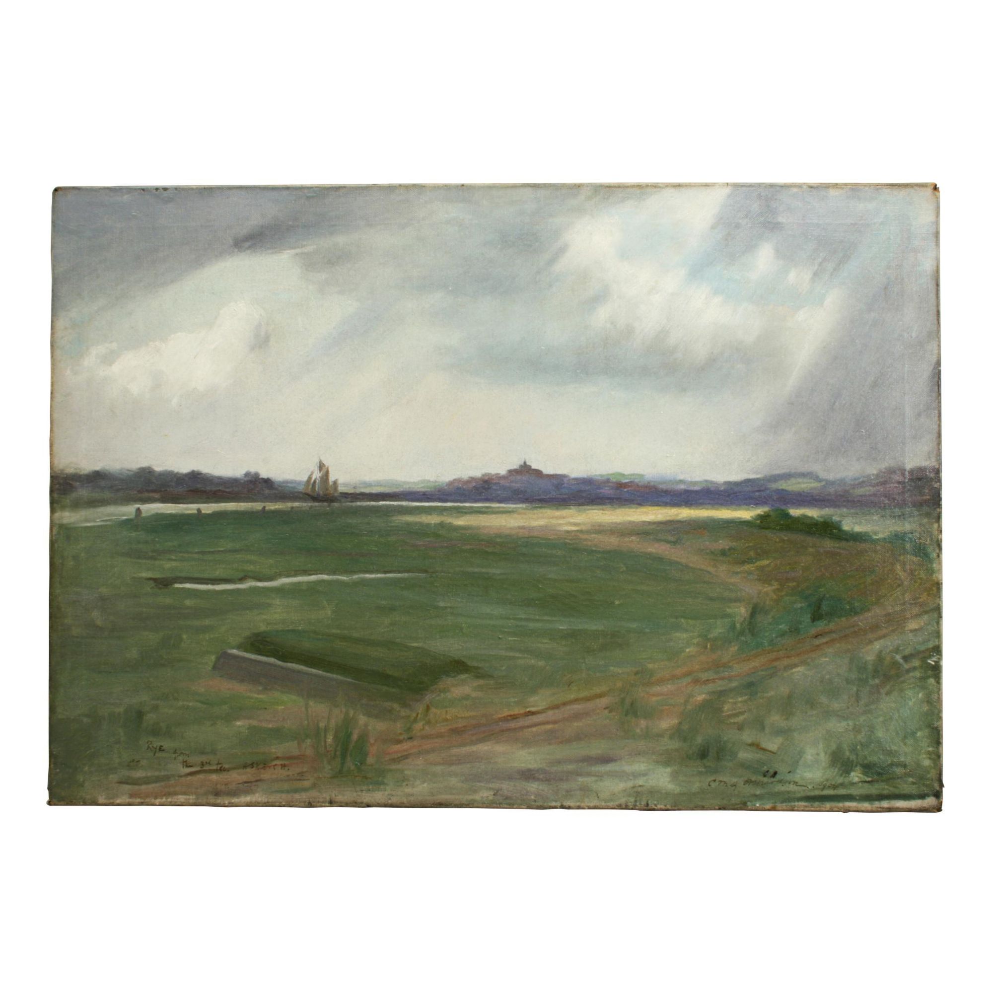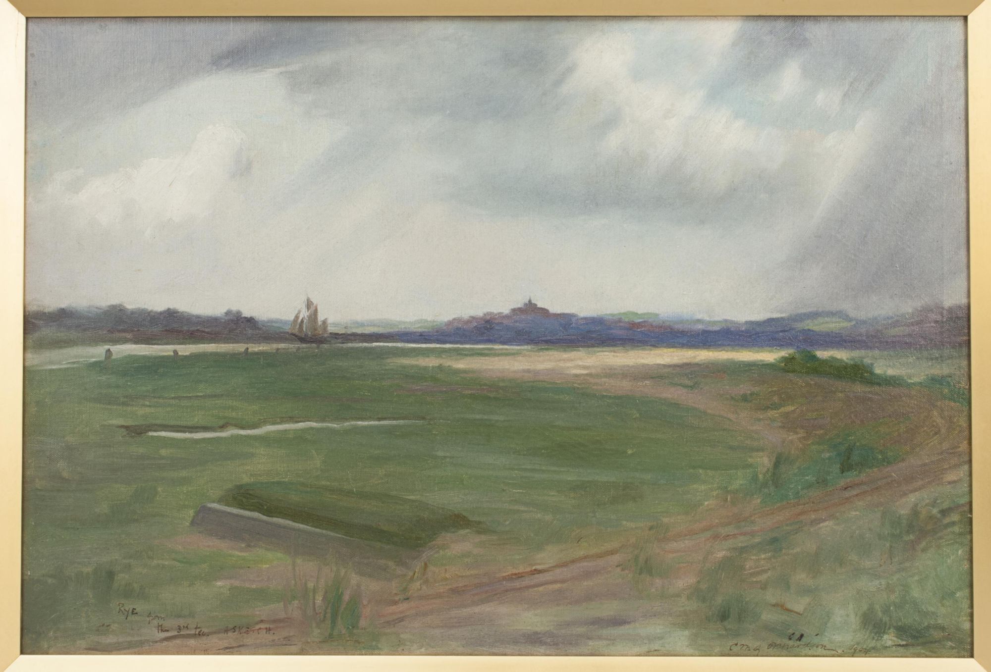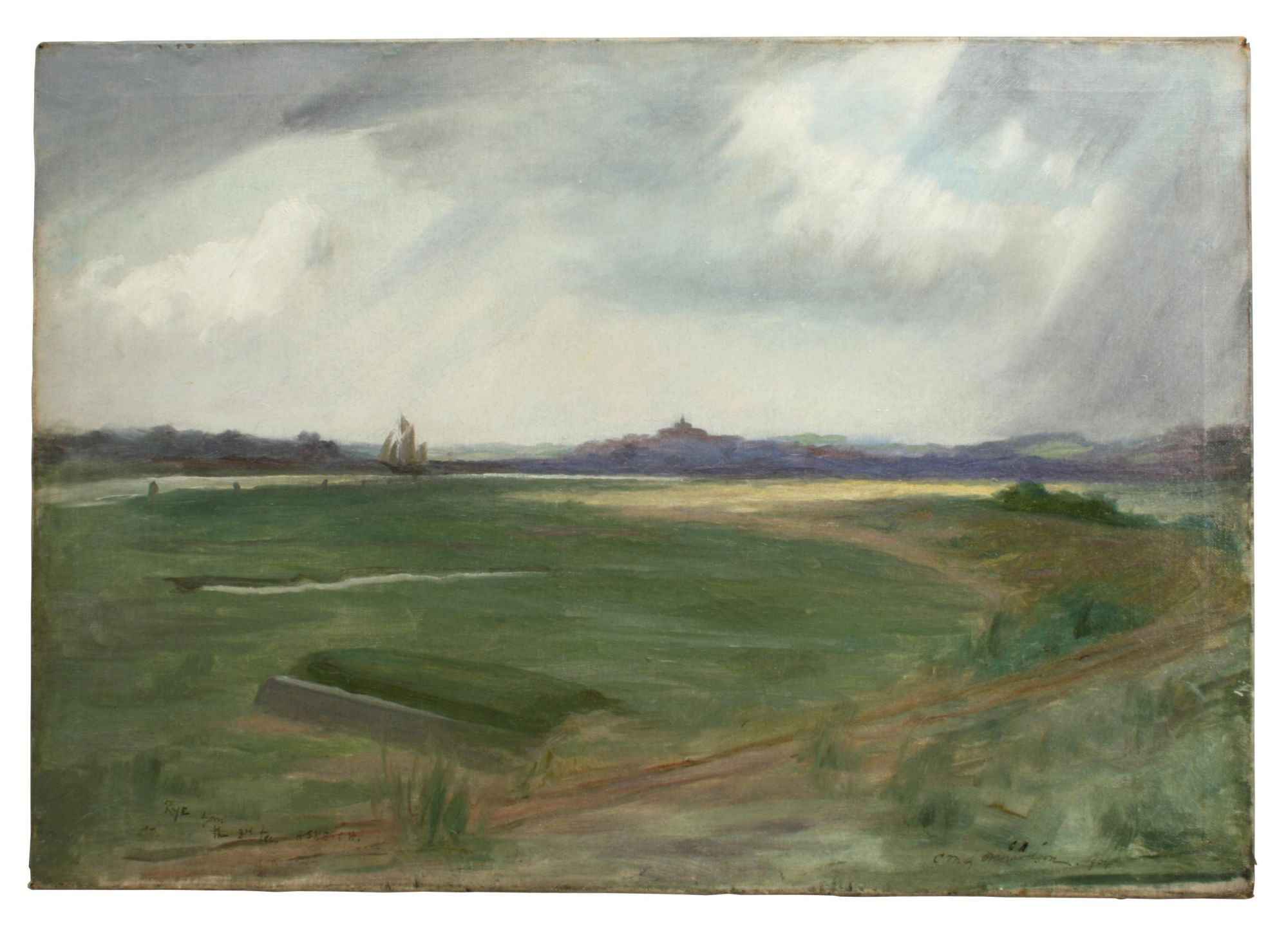 A charming early 20th-century oil painting depicting the view of Rye Harbour from the 3rd Tee of Rye Golf Course. The work is signed and dated Charles M. Orchardson, 1904, and bears the inscription "Rye from the 3rd Tee."