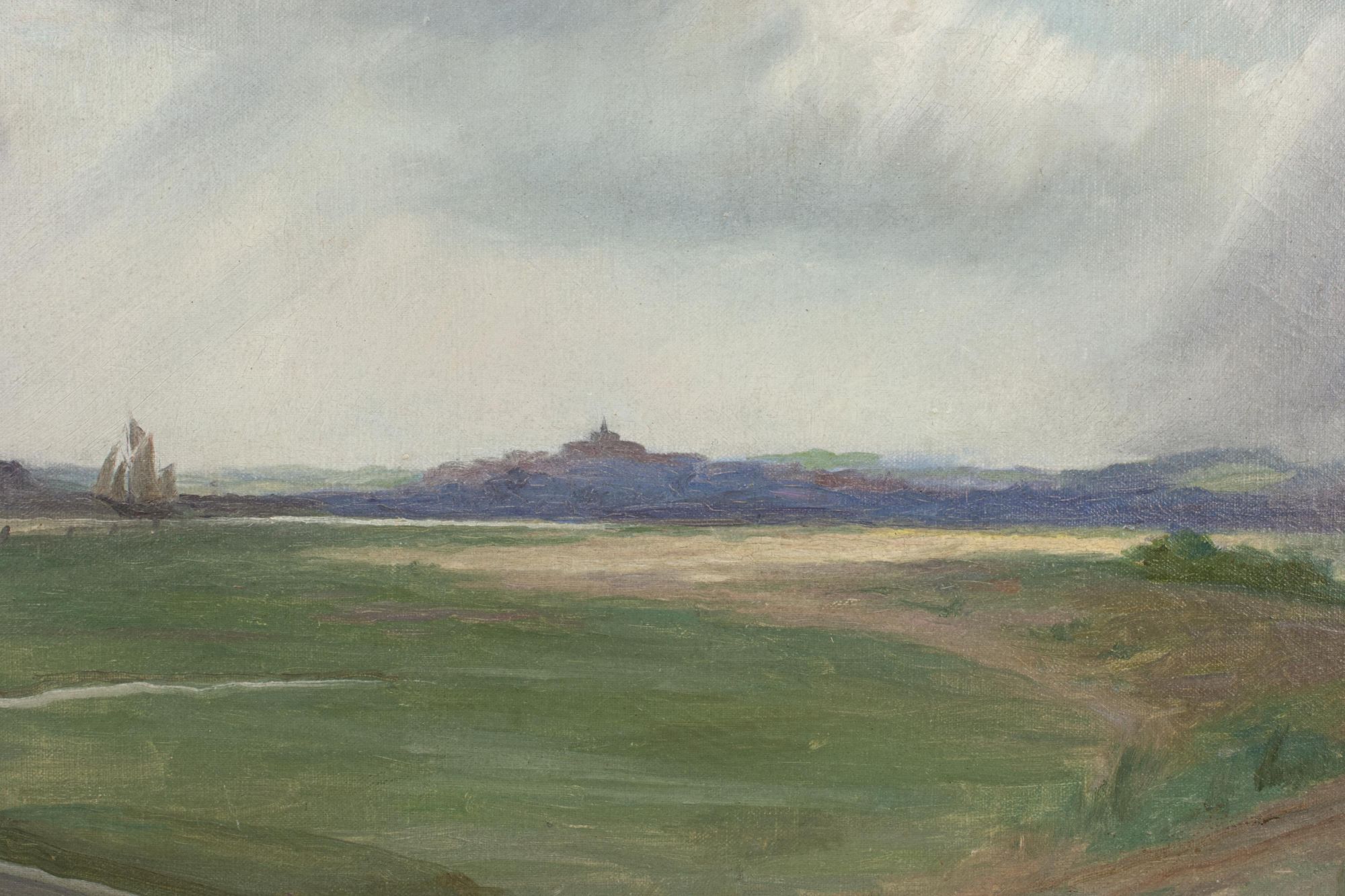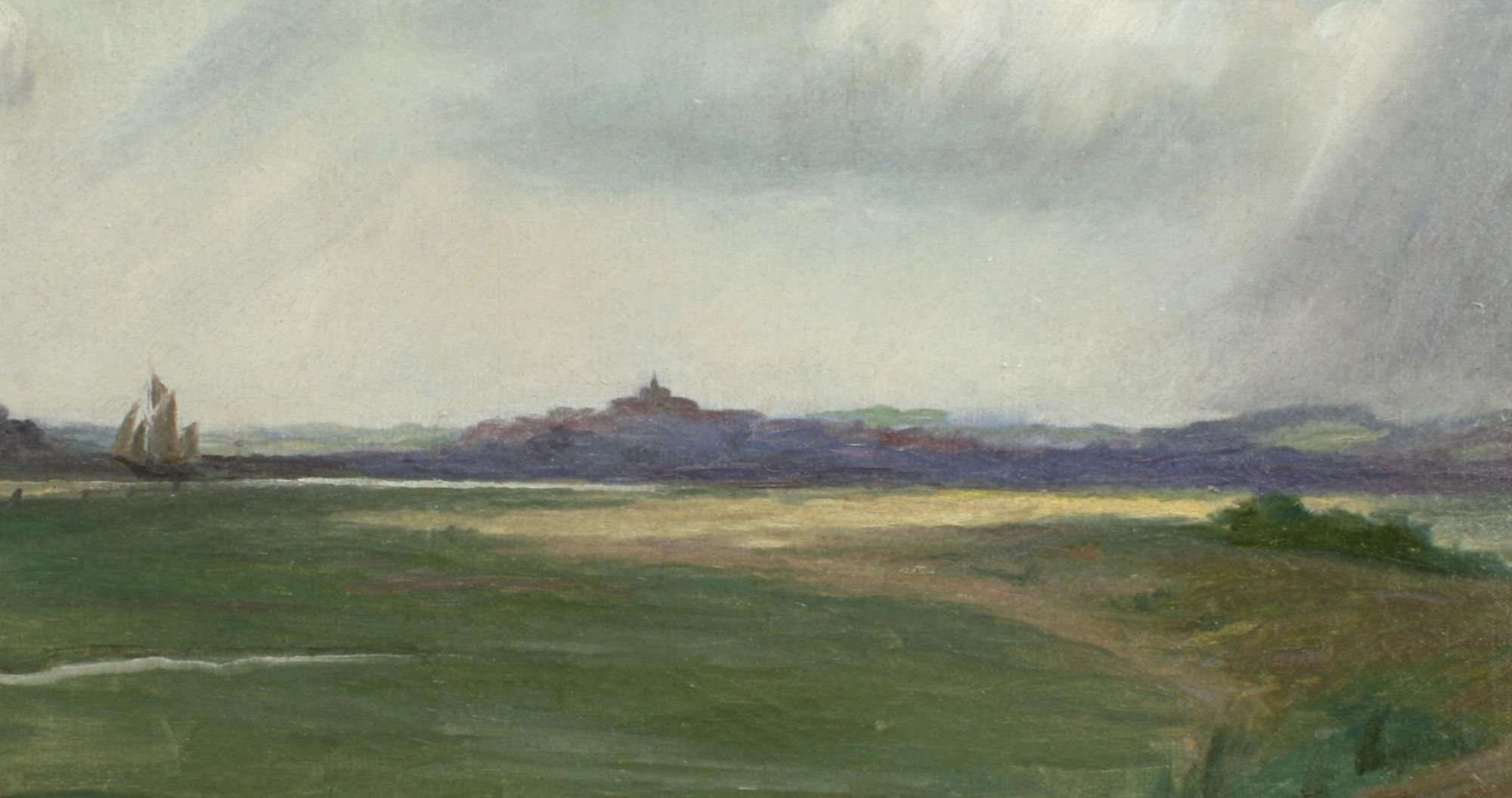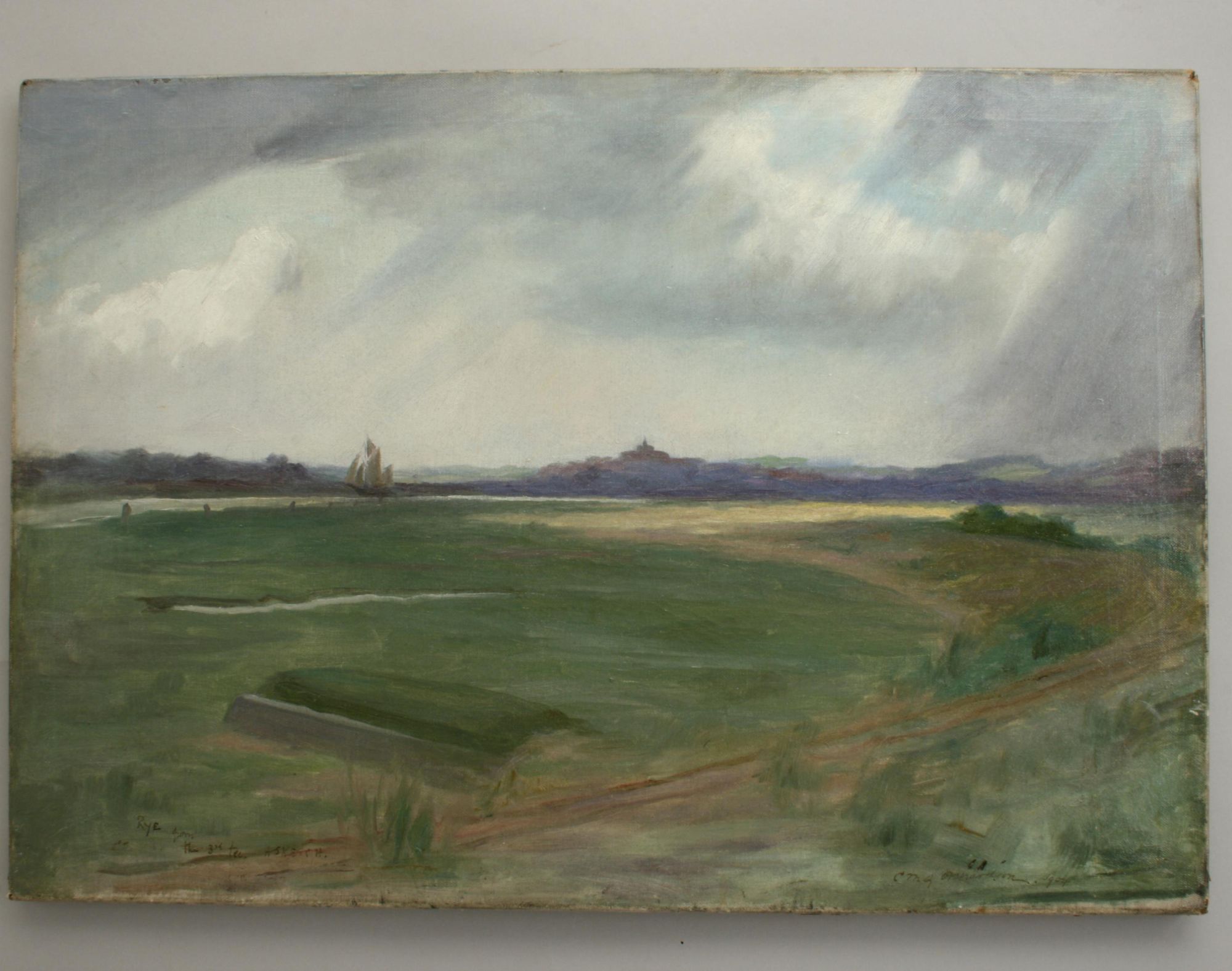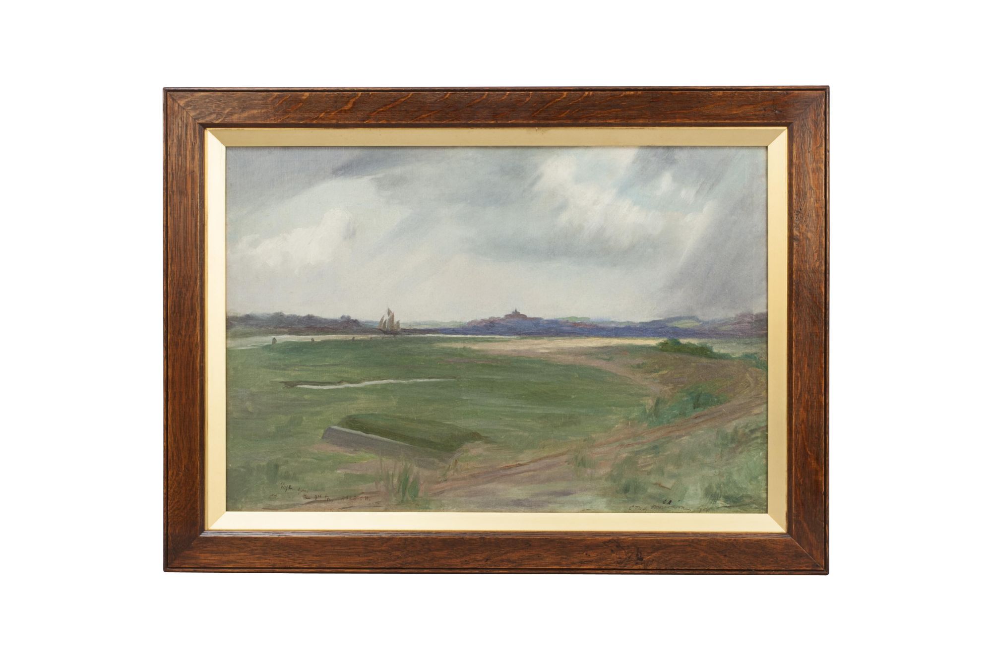 A charming early 20th-century oil painting depicting the view of Rye Harbour from the 3rd Tee of Rye Golf Course. The work is signed and dated Charles M. Orchardson, 1904, and bears the inscription "Rye from the 3rd Tee."
