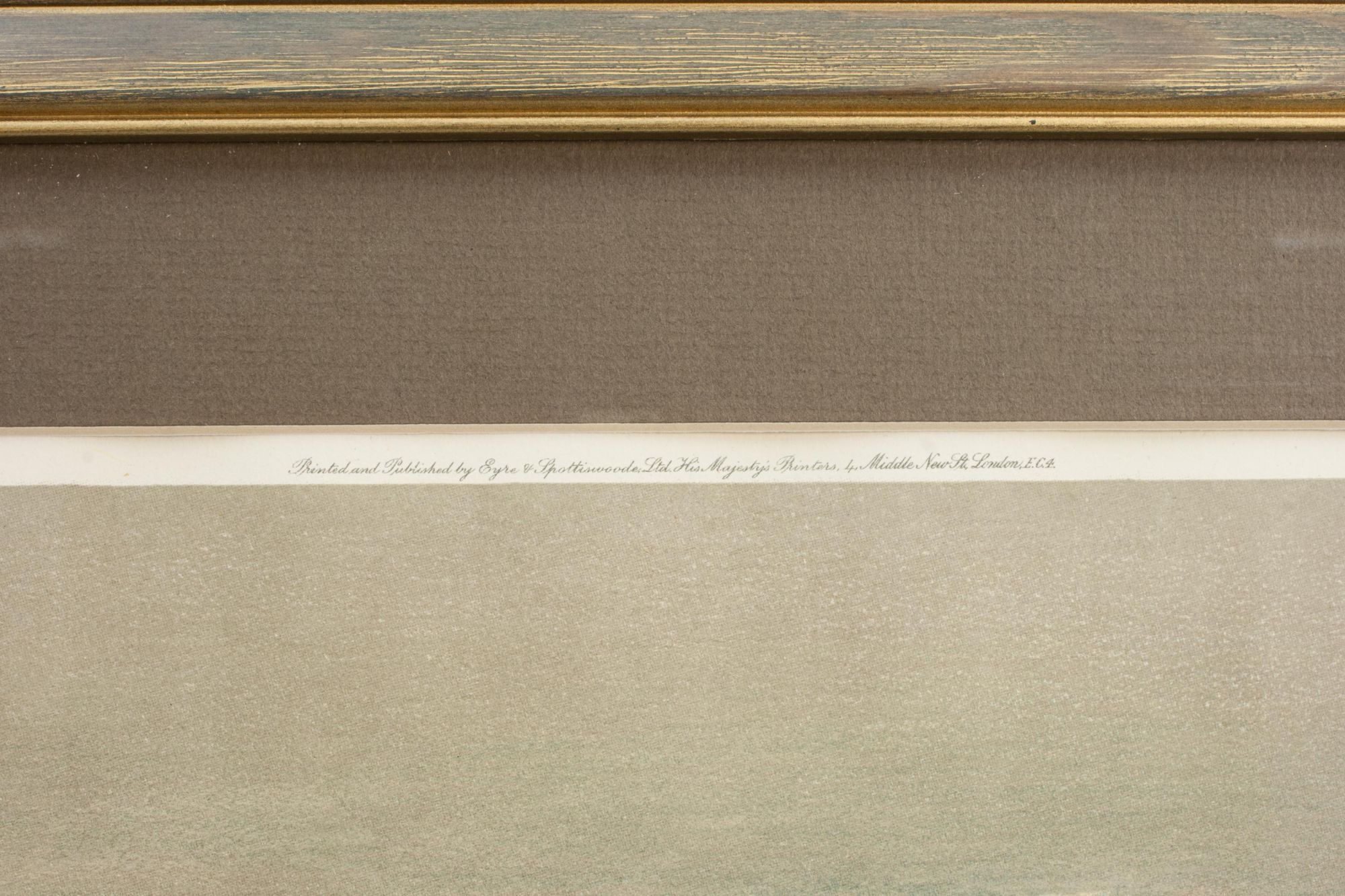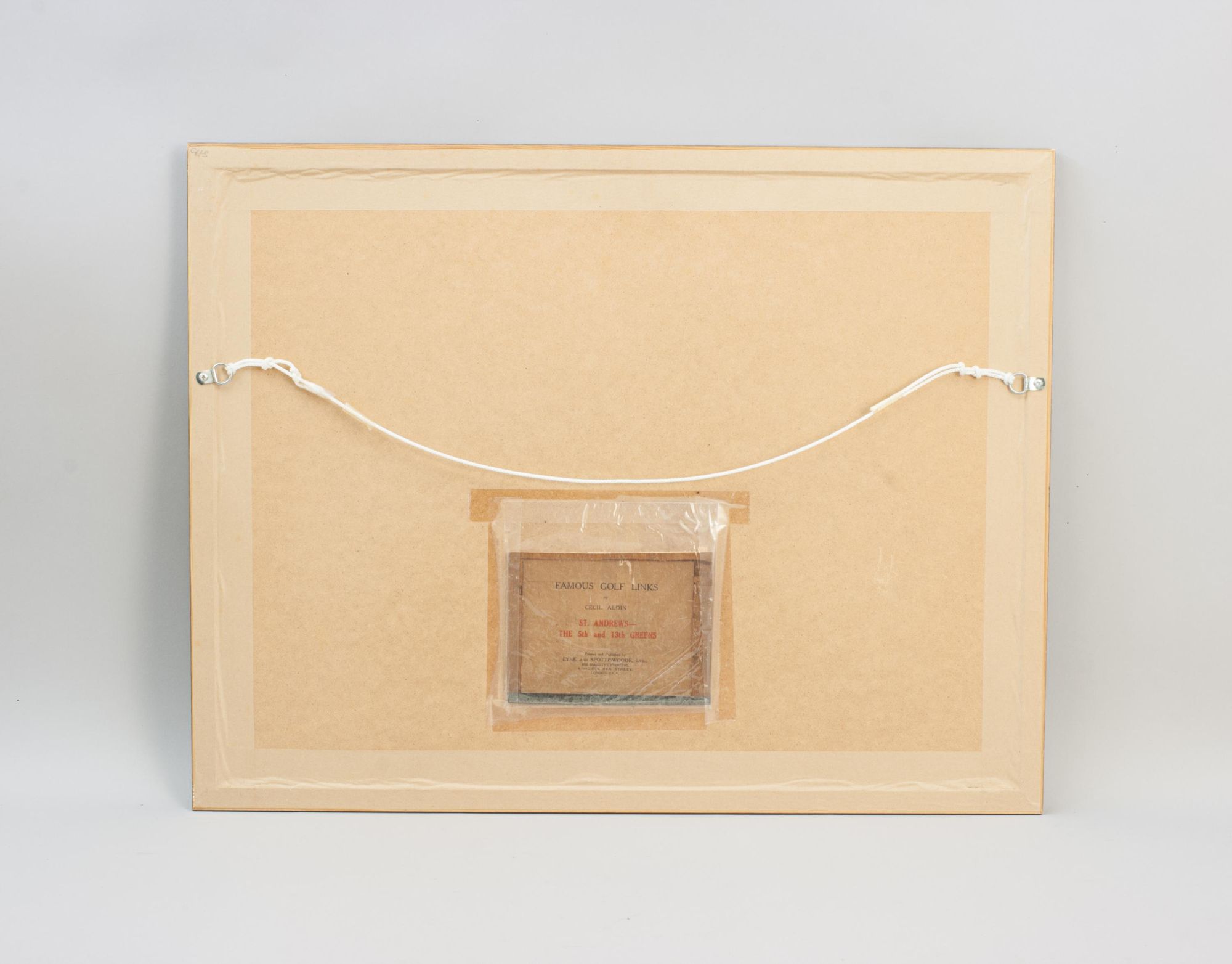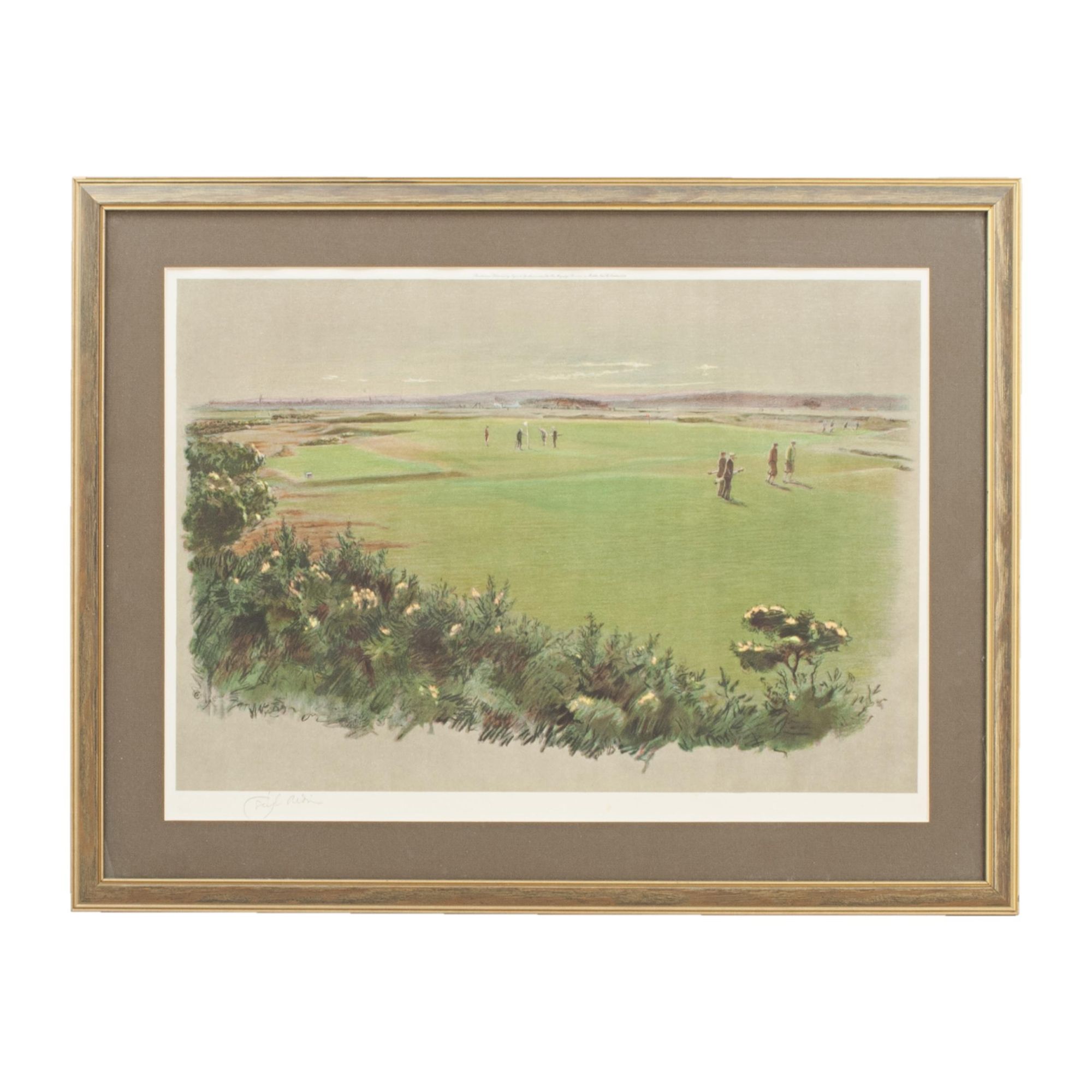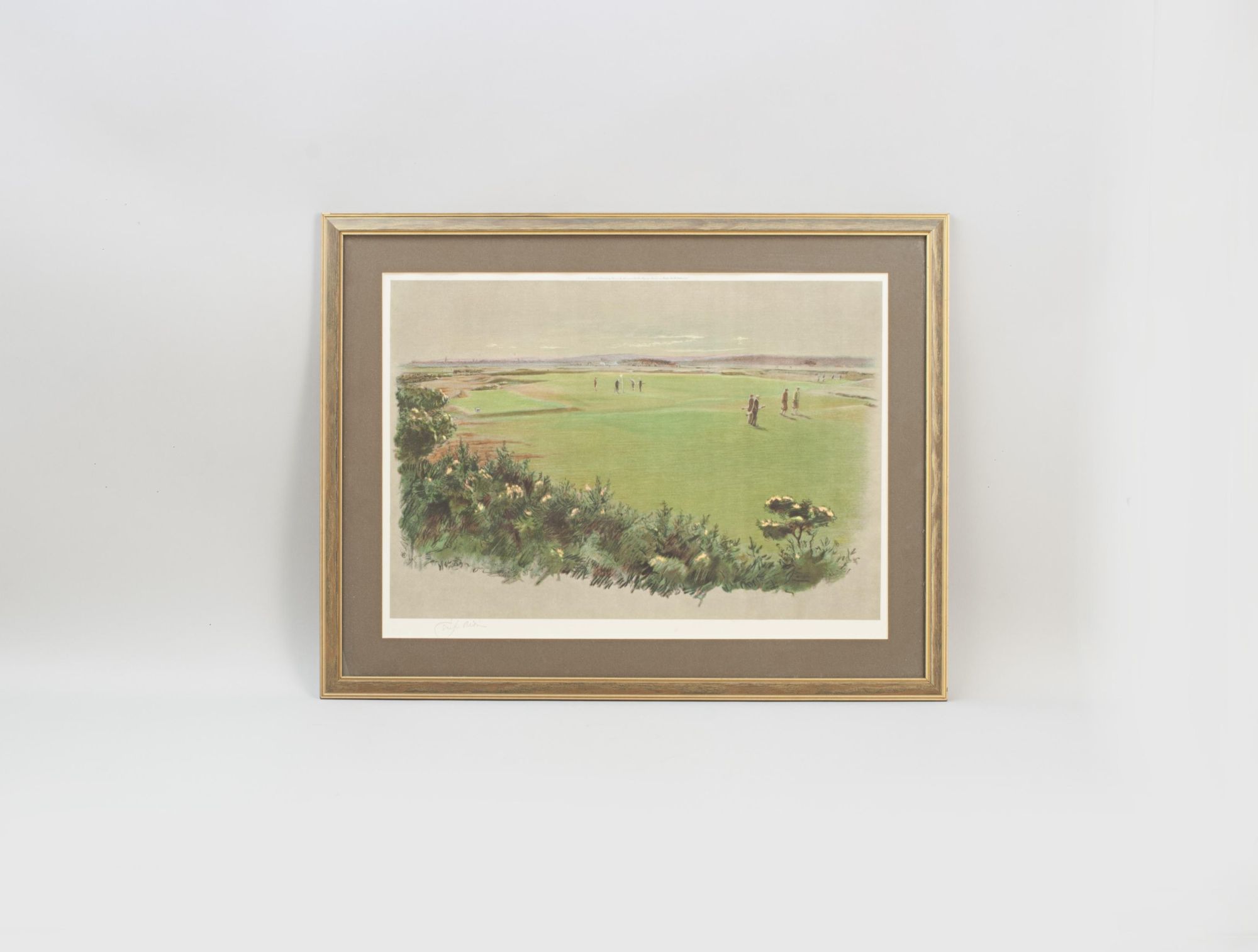 A colourful framed golf photolithograph of St Andrews, 5th and 13th Greens. Signed in pencil in the lower left hand margin by the artist, Cecil Aldin. Printed and published by Eyre & Spottiswoode, Ltd., His Majesty's printers. 4 Middle New Street, London, E.C.4. and with Fine Art Trade Guild stamp.