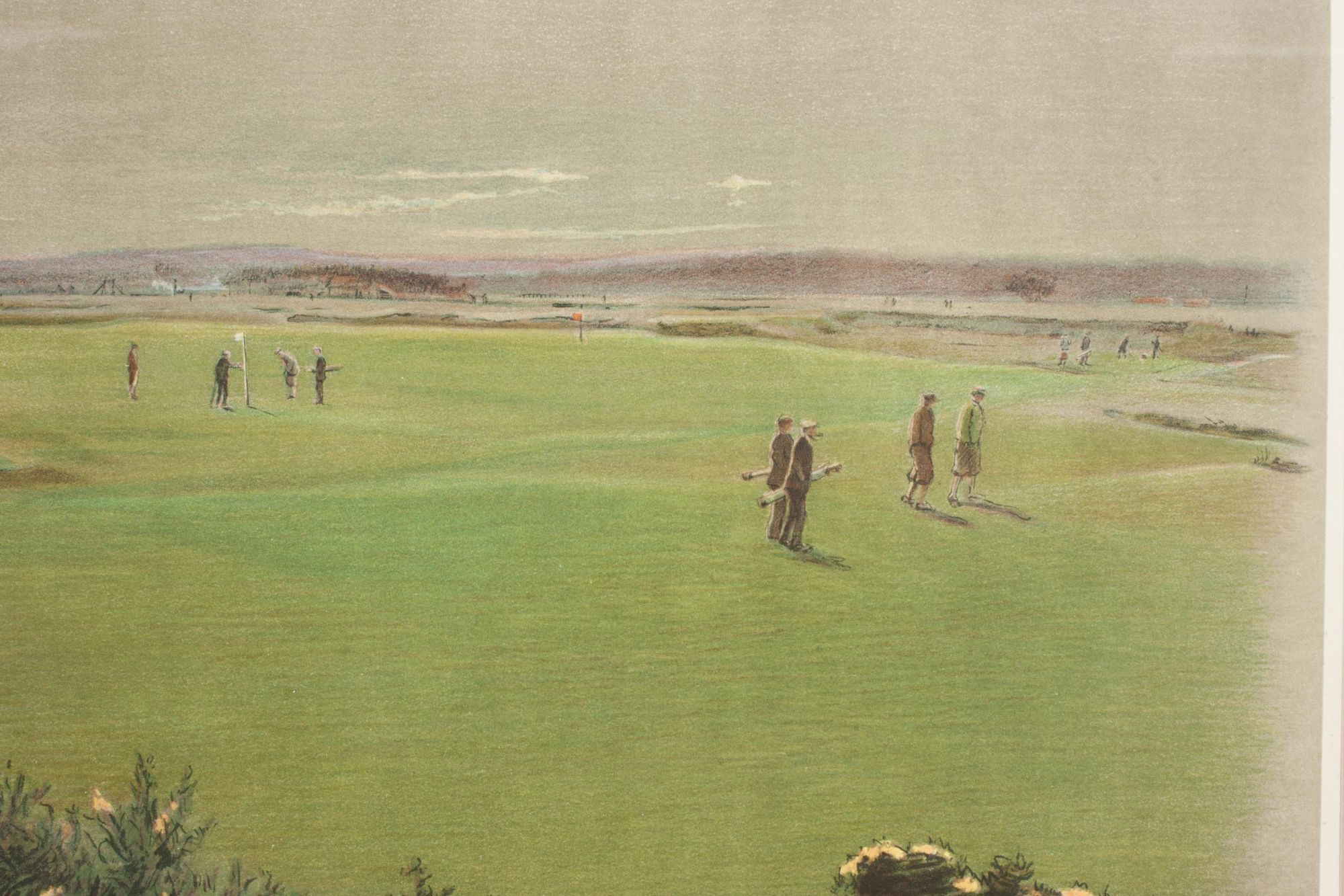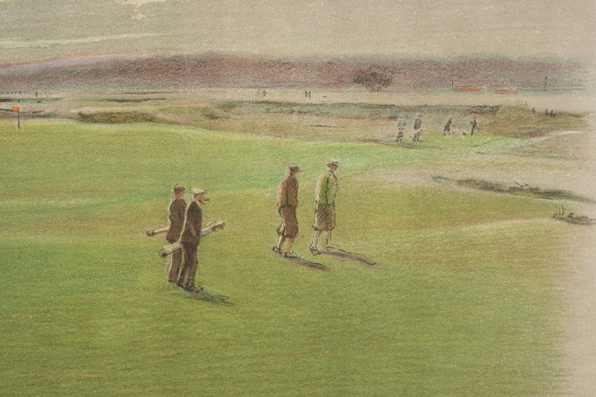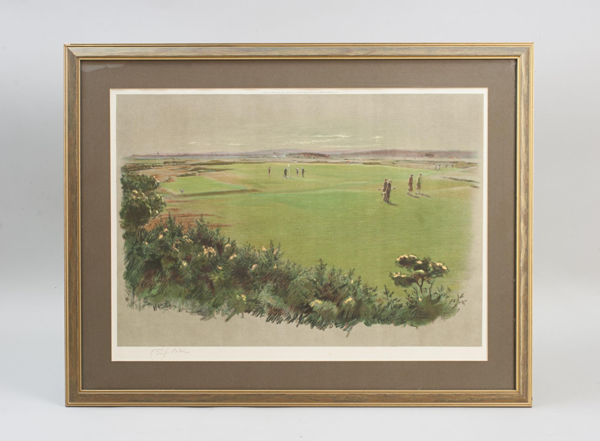 Aldin produced few golfing works and this example is one of a series of six golf course views "Famous Golf Courses" published in the 1920's. The six golf courses were Sunningdale, North Berwick, Westward Ho, Royal St. George's, Walton Heath and St Andrews.