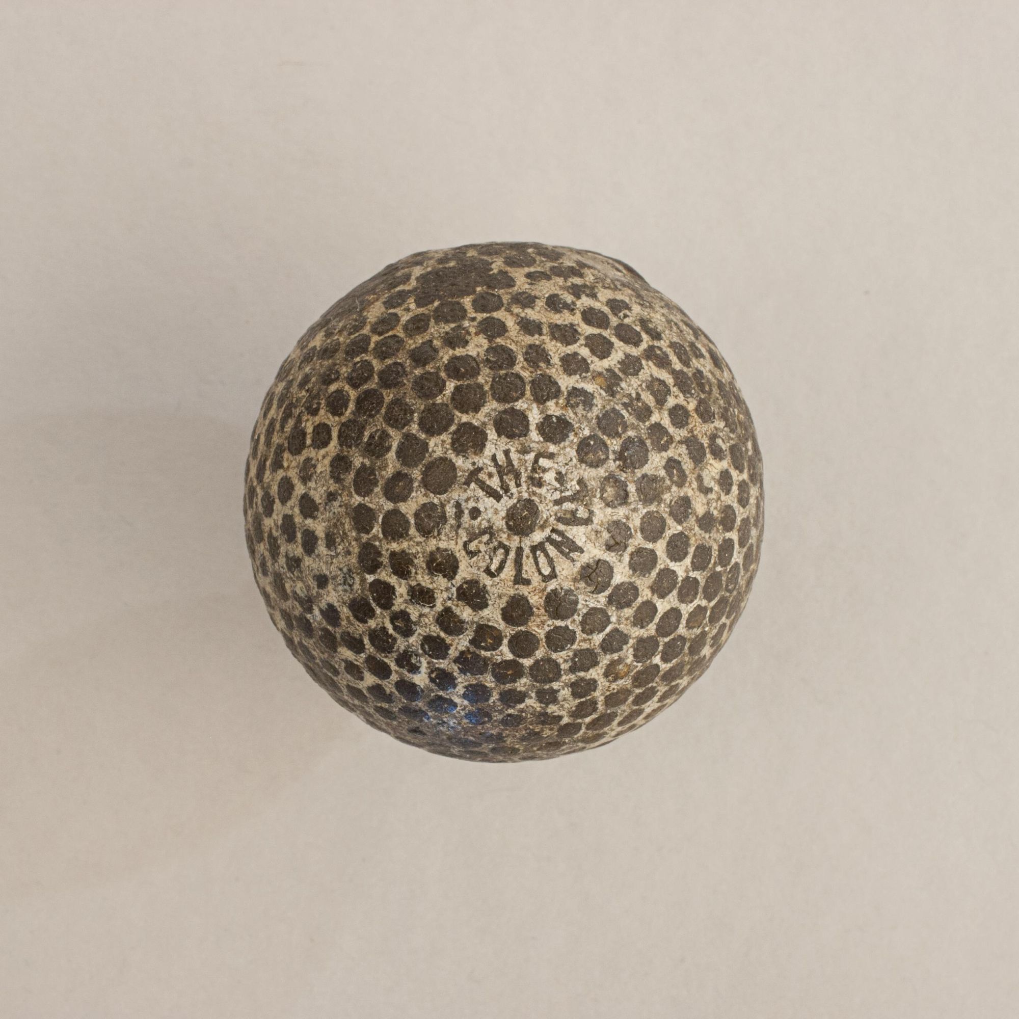 A good example of 'The Colonel' bramble patterned rubber core golf ball. The golf ball is in well used condition and is manufactured by St. Mungo Manufacturing Co. of America, Newark, New Jersey and Glasgow. One pole is stamped 'The Colonel' in raised lettering around a single bramble, while the opposite pole has been worn away. It is with the classic bramble pattern, raised dimples, although quite smooth now.