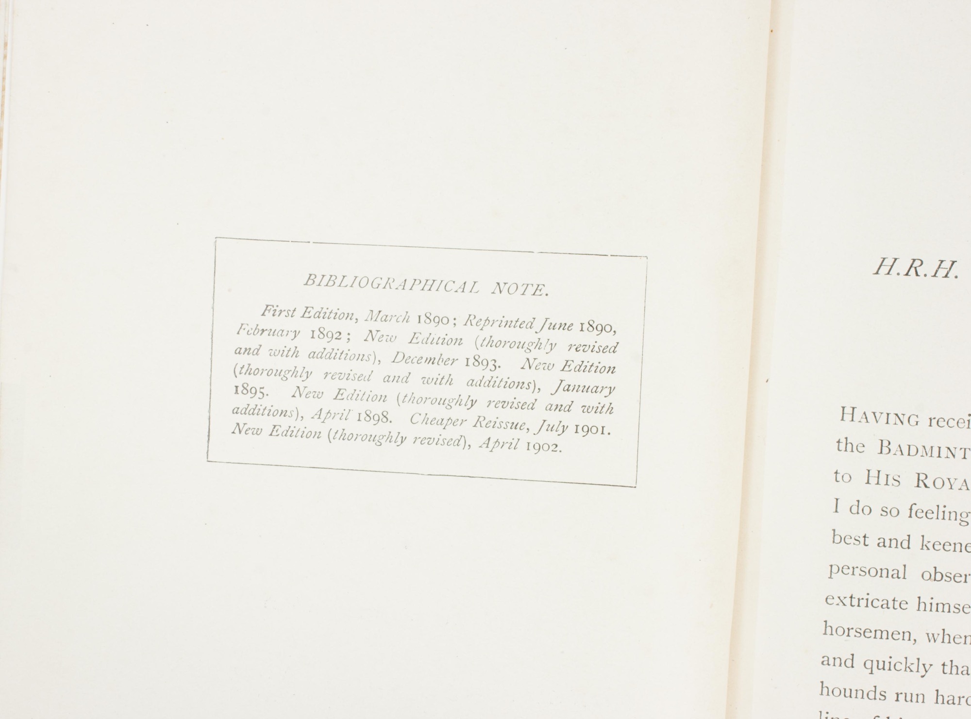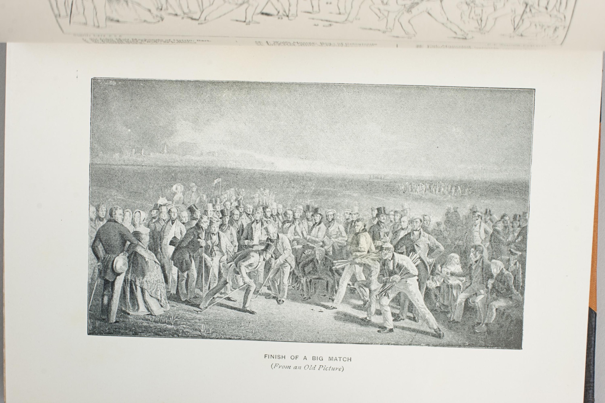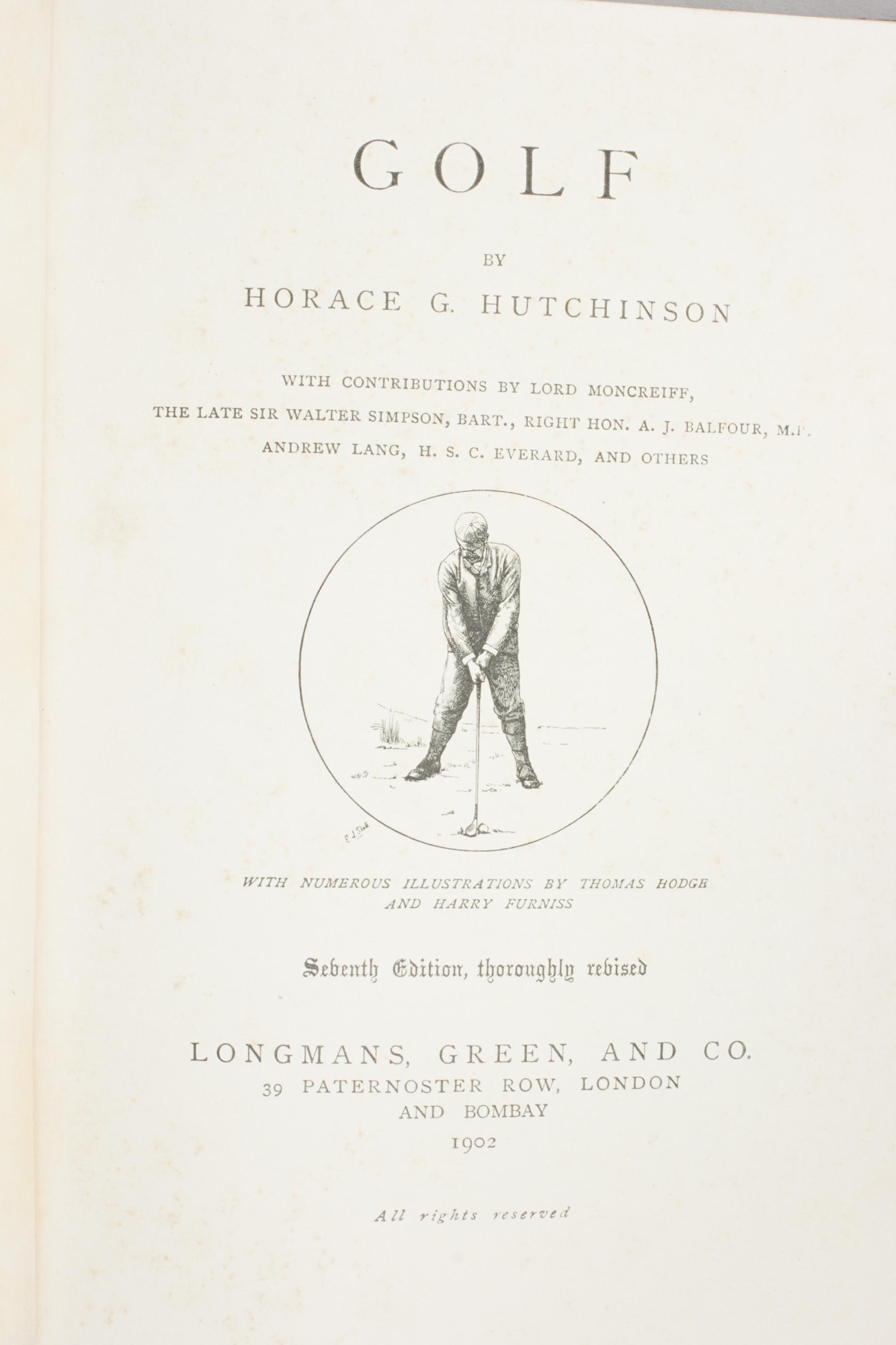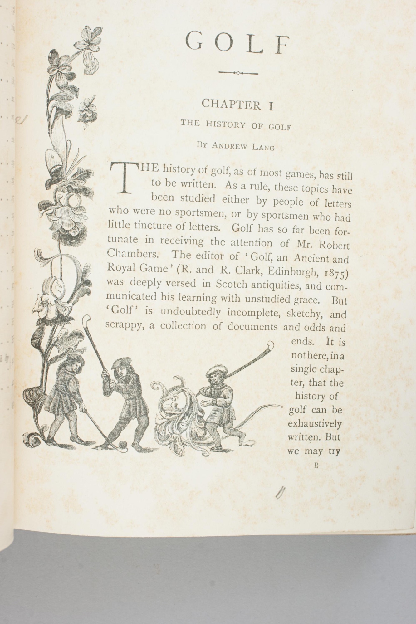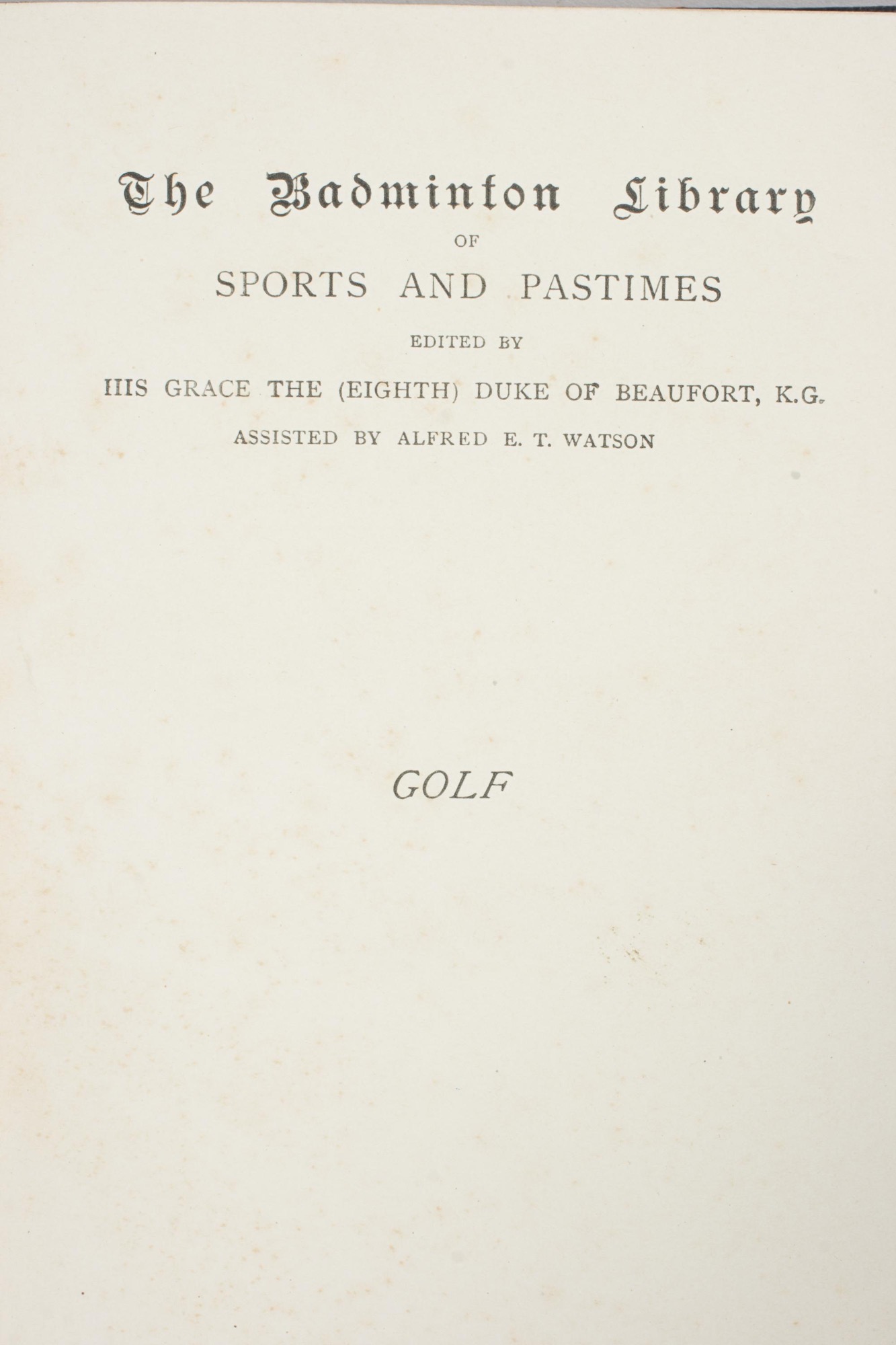 Badminton Library Book, Deluxe Volume, Golf. A fantastic 'Badminton Library of Sports and Pastimes' book - Golf, edited by His Grace The Duke of Beaufort. Published in 1902 by Longmans, Green, & Co. 39 paternoster Row, London and Bombay. Deluxe hardback binding with original blue half morocco, spine lettered in gilt, gilt family coat of arms of The Duke of Beaufort over orange cloth, blue endpapers and blue silk bookmarker. The book with wonderful illustrations throughout, frontispiece and title page vignette with tissue guard. The Badminton Library, originally published between 1885 and 1896, was a sporting and publishing project conceived and founded by Henry Somerset 8th Duke of Beaufort. It developed into a series of sporting books which aimed to cover all major sports and pastimes, with each volume written by experts who were authorities in their fields. The book titles being - Hunting, Fishing, Racing, Riding & Driving, Shooting, Fencing, Boating, Cycling, Cricket, Yachting, Tennis - Lawn Tennis - Racquets & Fives, Golf - Curling & Skating, Football & other school games.