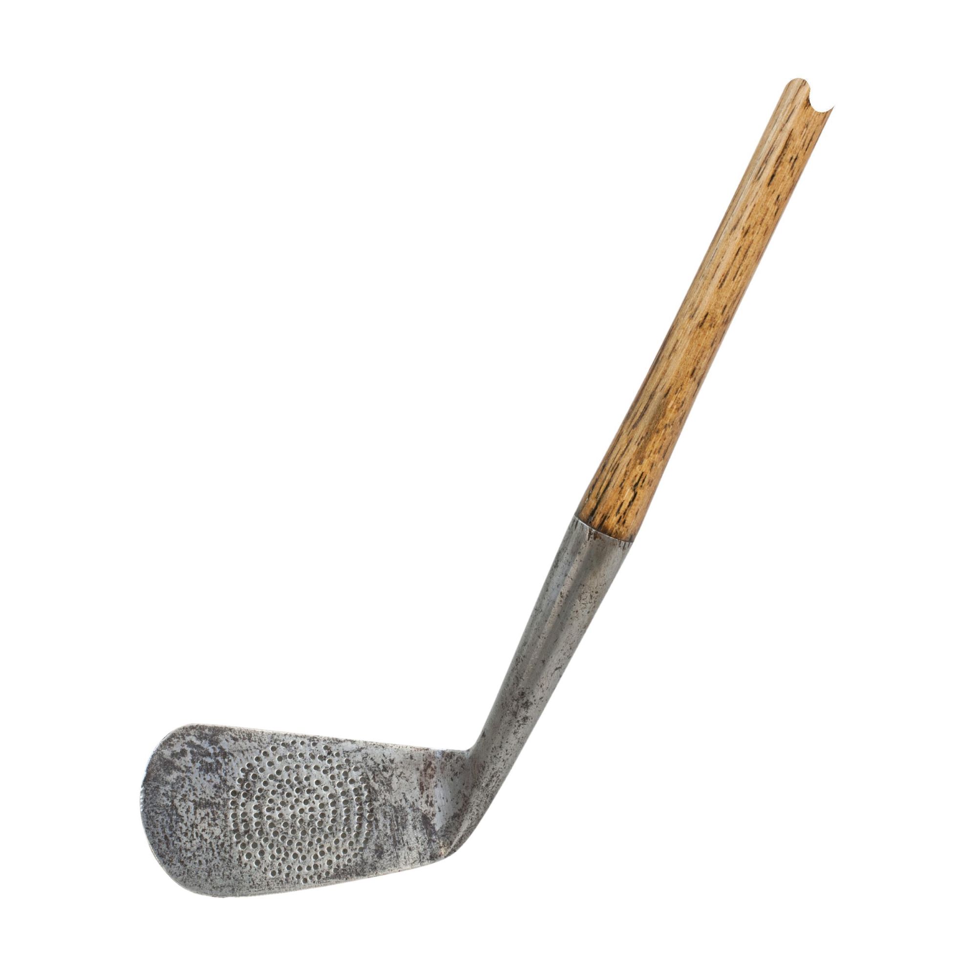 A classic early 20th-century mashie featuring a hickory shaft and original leather grip. The club head is a diamond-back mashie, a design popular with professional and amateur golfers in the early 1900's. The maker's stamp on the back of the head has worn with time and is now unreadable (DREMS can just be made out). The face features hand-punched dot markings arranged in a circular pattern; a distinctive early style used before modern machine-milled scoring lines became standard.